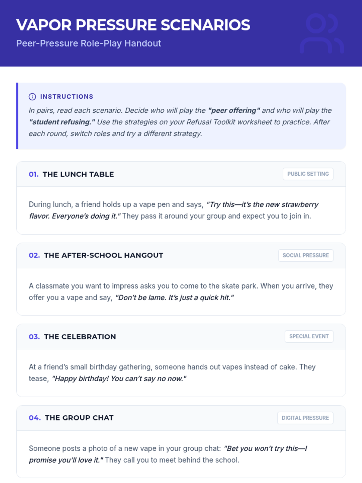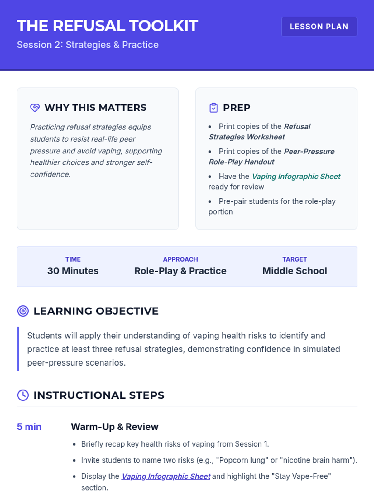 A two-session intervention sequence designed for middle school students to explore the science-based health risks of vaping and develop practical refusal strategies for peer-pressure situations.