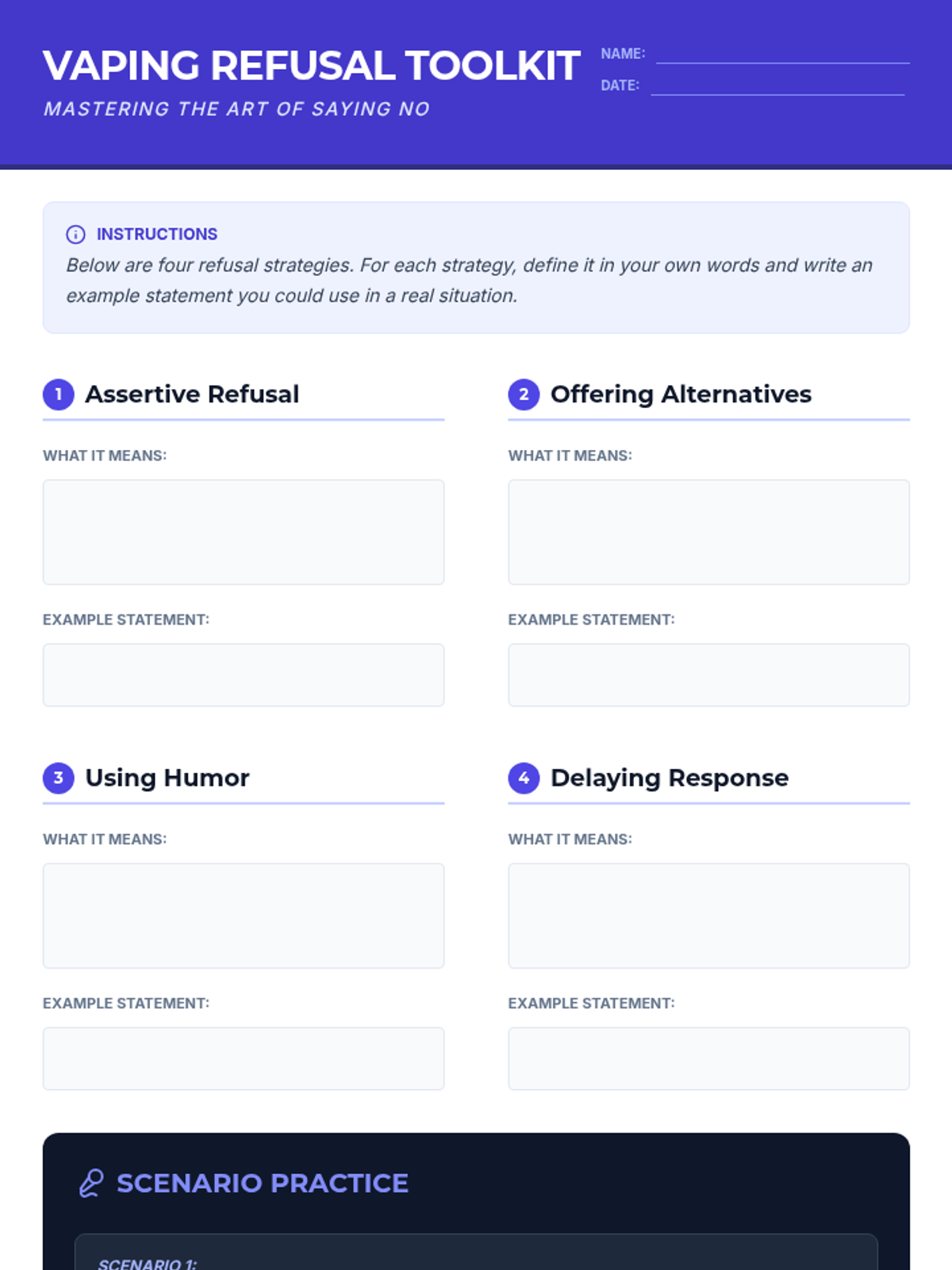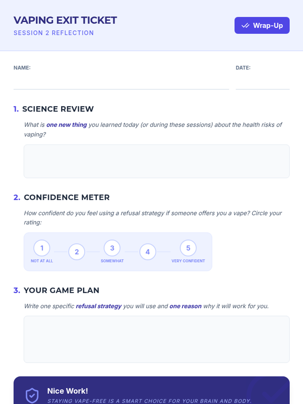 A comprehensive vaping prevention unit that covers health risks, the science of nicotine addiction, and social refusal strategies for middle and high school students.
