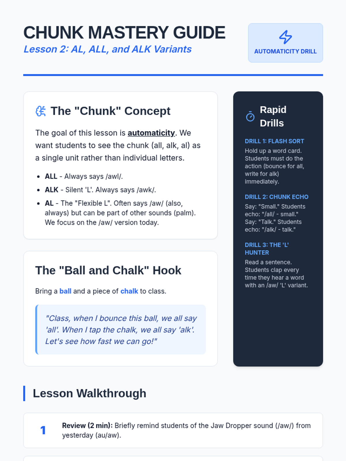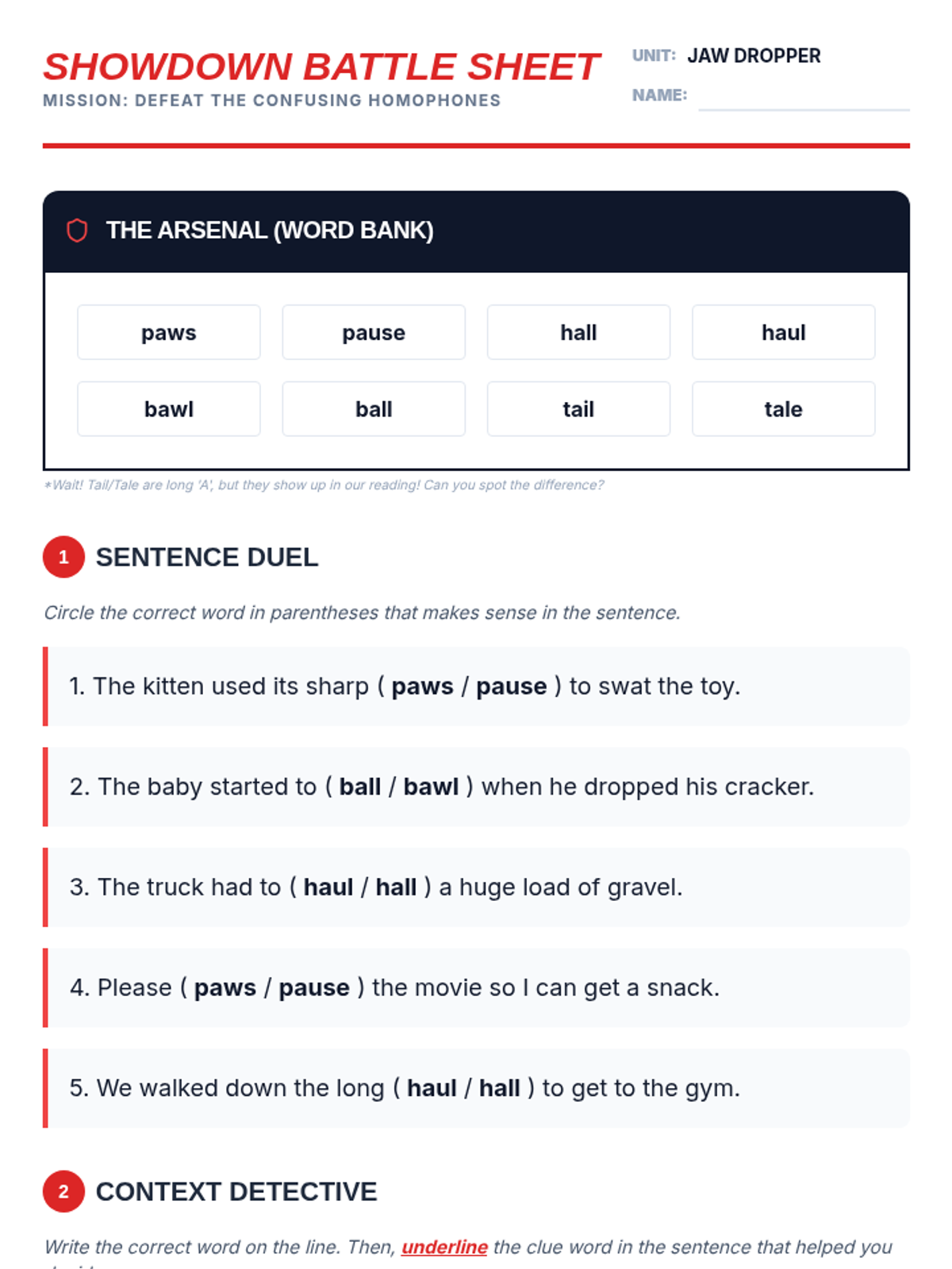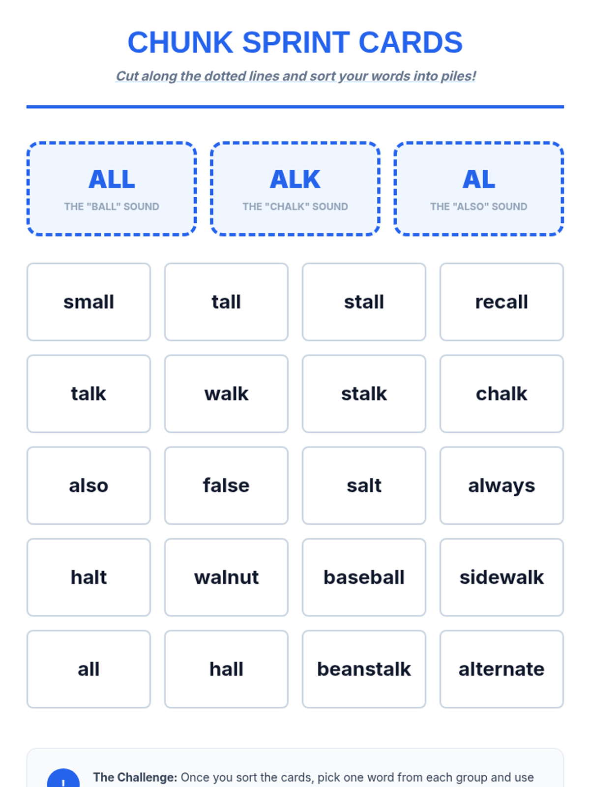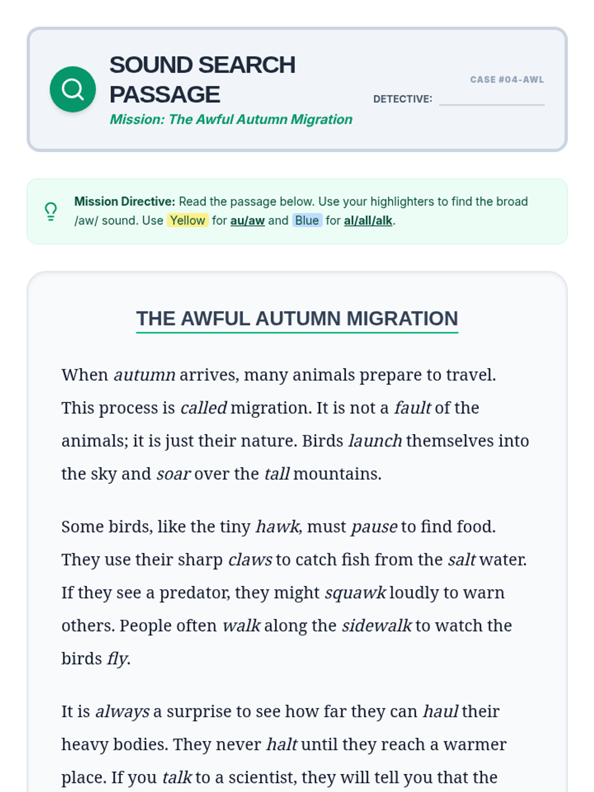 A comprehensive workshop-style sequence for 4th-grade students to master the broad /aw/ sound through its various spelling patterns (au, aw, al, all, alk). Students engage in decoding and encoding exercises to build spelling accuracy and reading fluency.