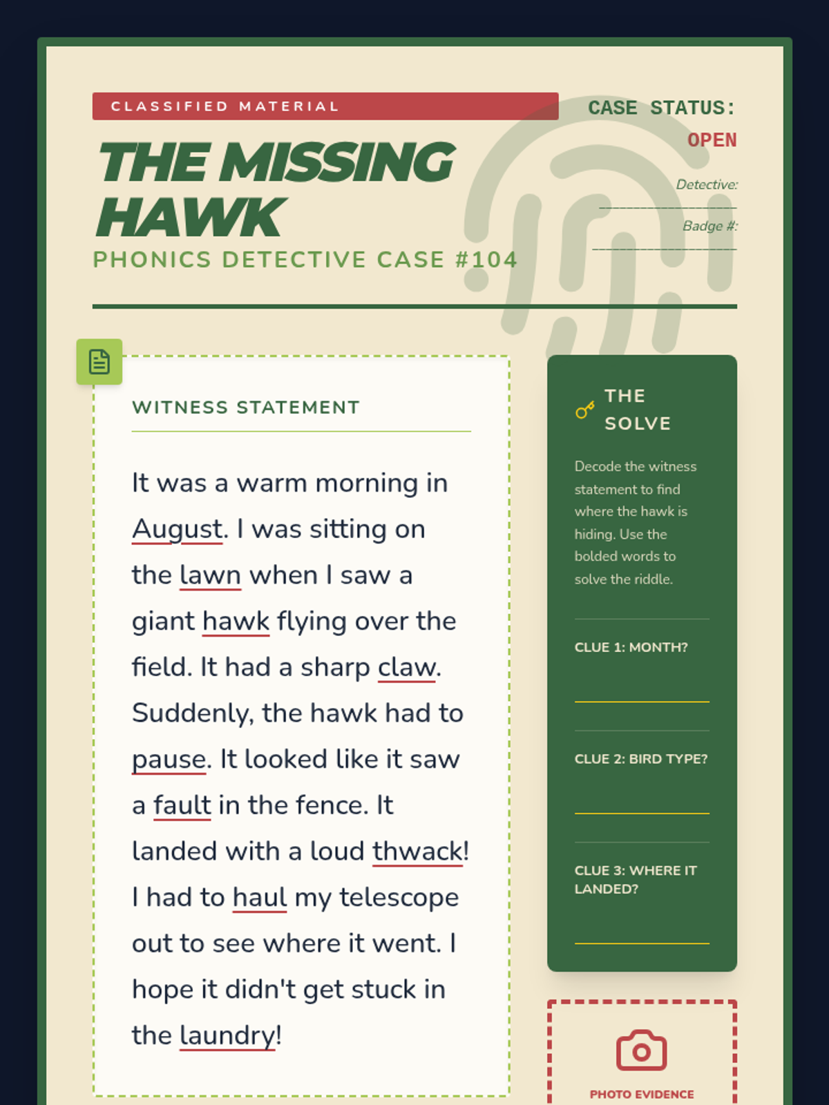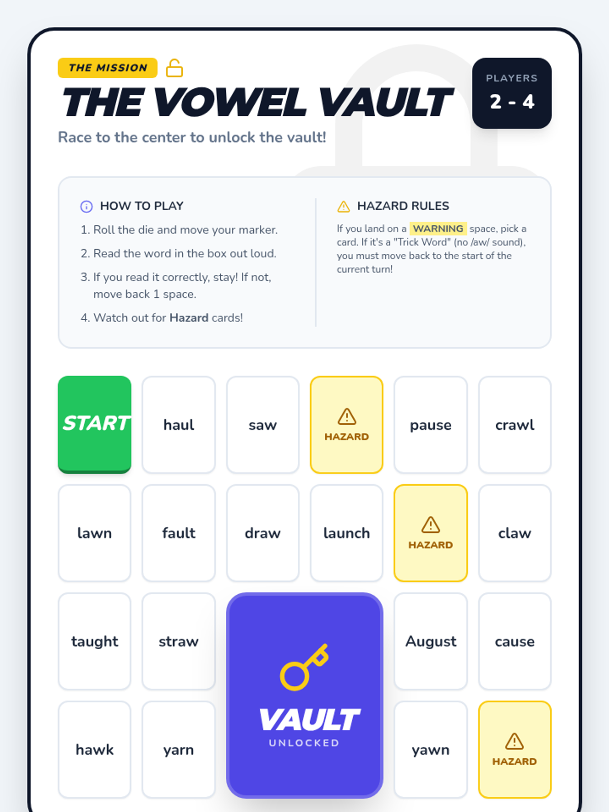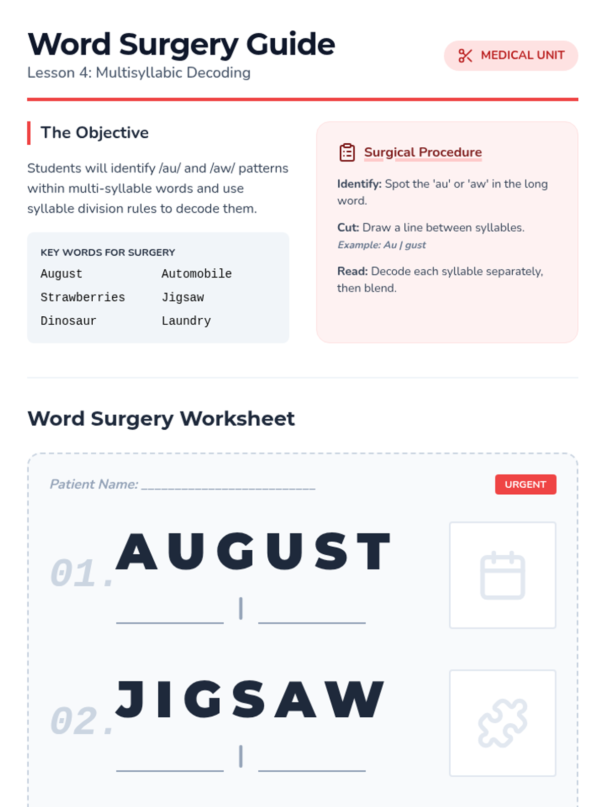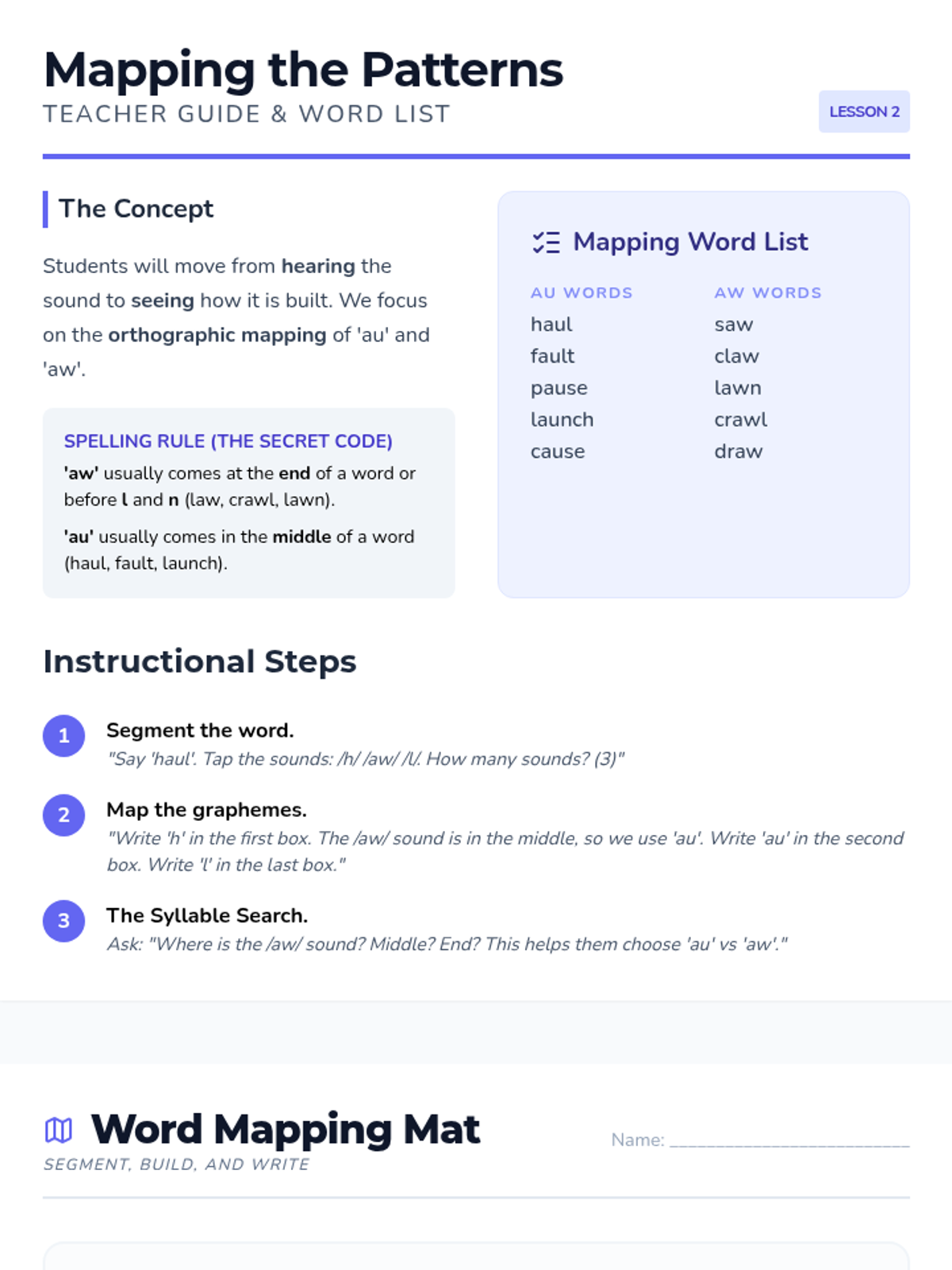 A game-based phonics sequence for 2nd graders to master the variant vowel sounds /au/ and /aw/. Students progress from basic sound recognition to decoding multisyllabic words and applying their knowledge in a mystery-solving context.