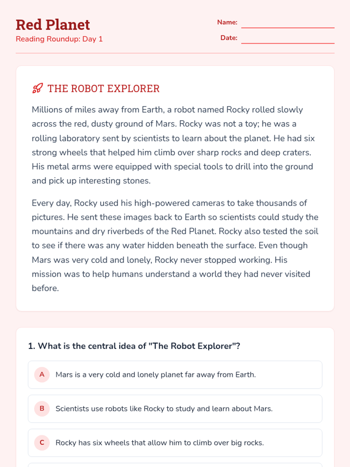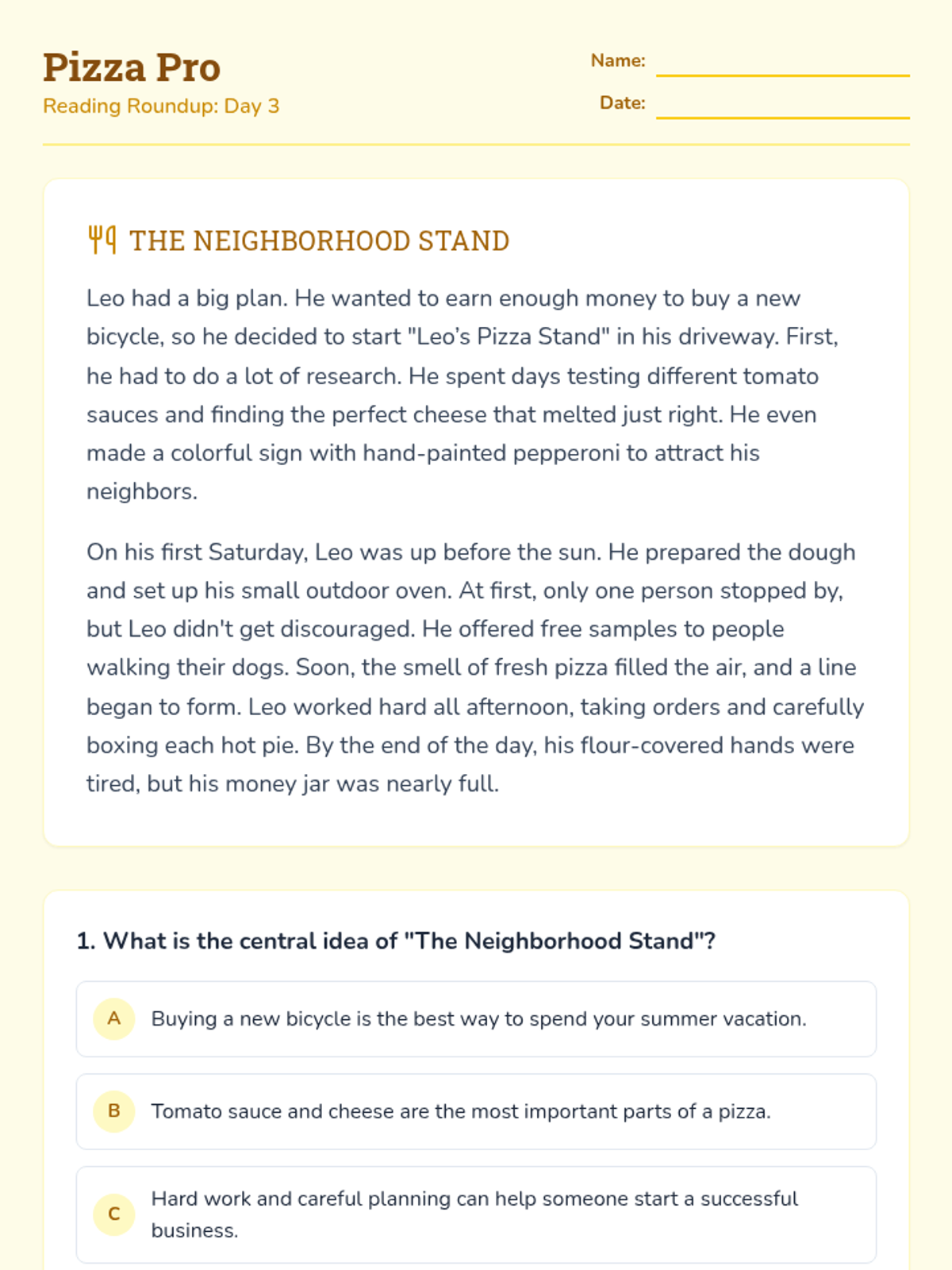 A 4-day reading comprehension unit for 3rd graders featuring a variety of topics (space, drama, cooking, and history) to practice identifying central ideas and themes.