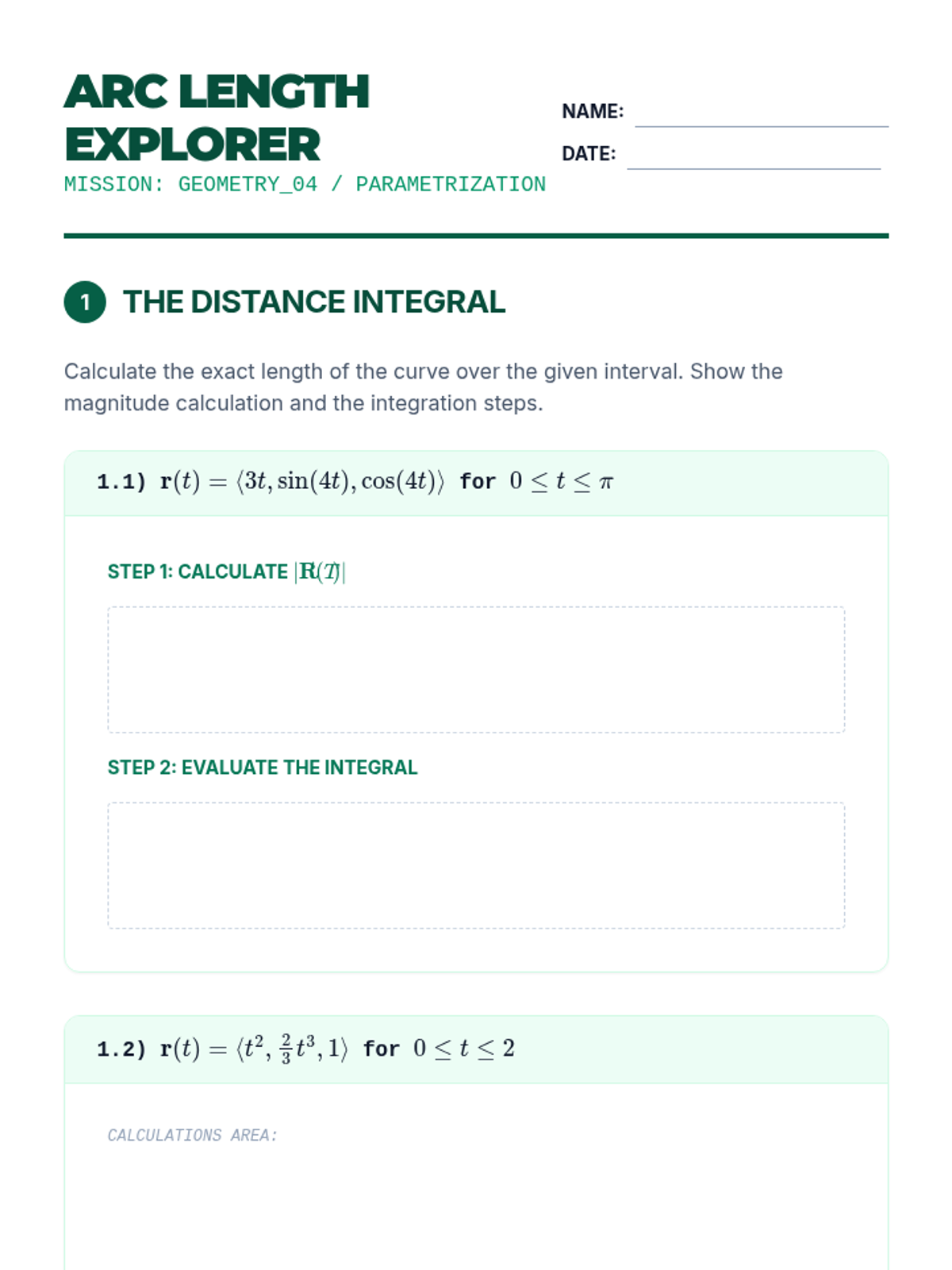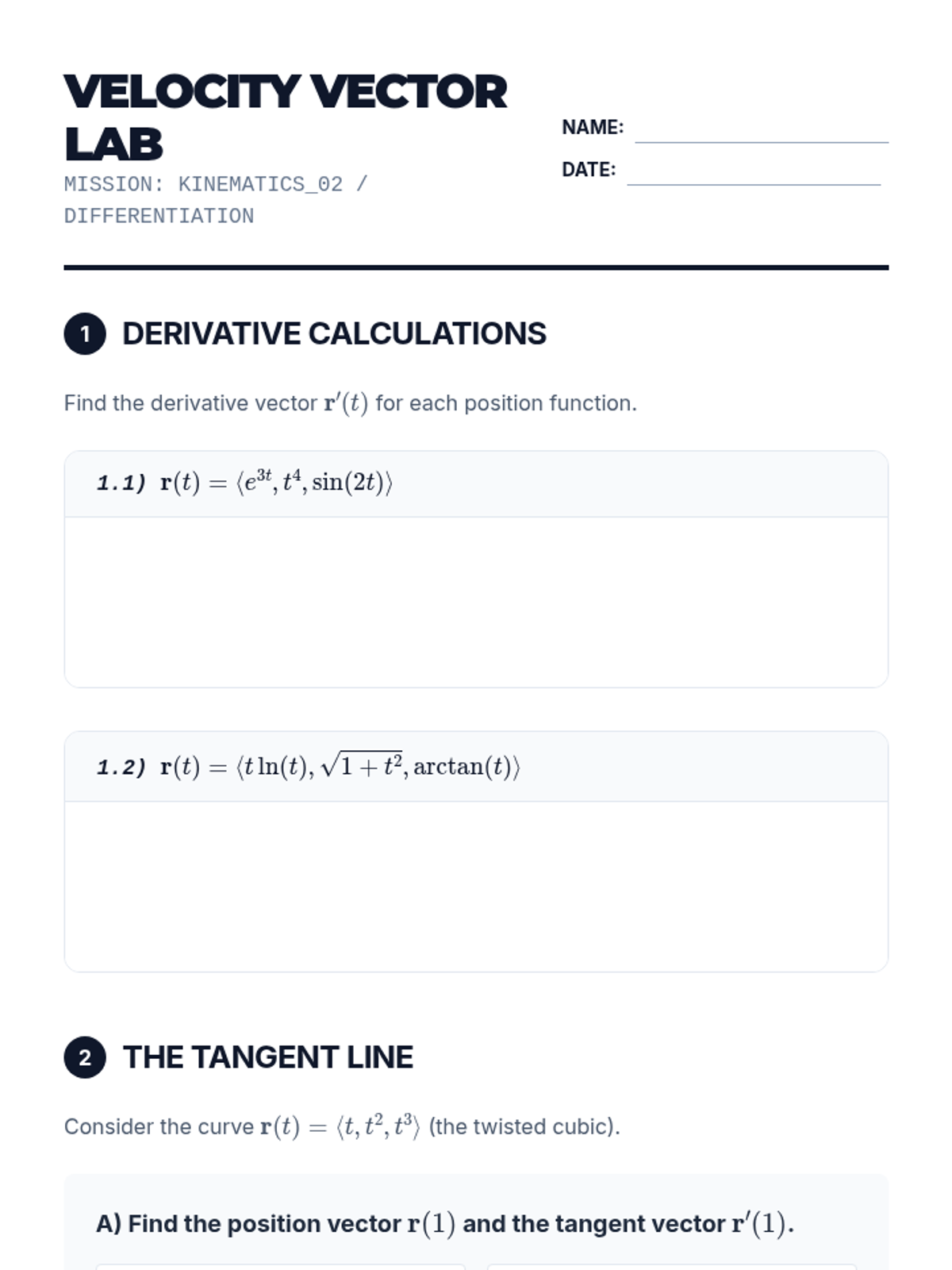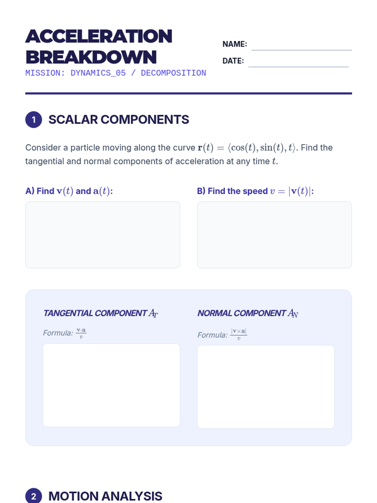 This sequence explores vector-valued functions, connecting abstract calculus concepts to the physical world through kinematics. Students will master defining space curves, differentiating for velocity, integrating for projectile motion, and decomposing acceleration into tangential and normal components.