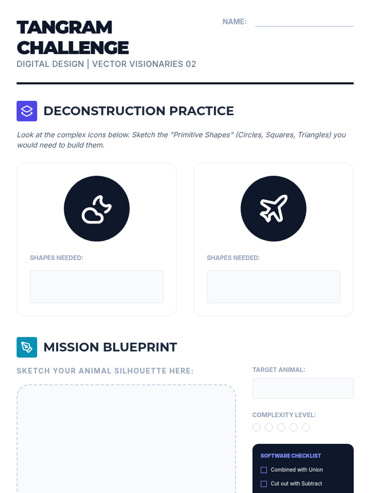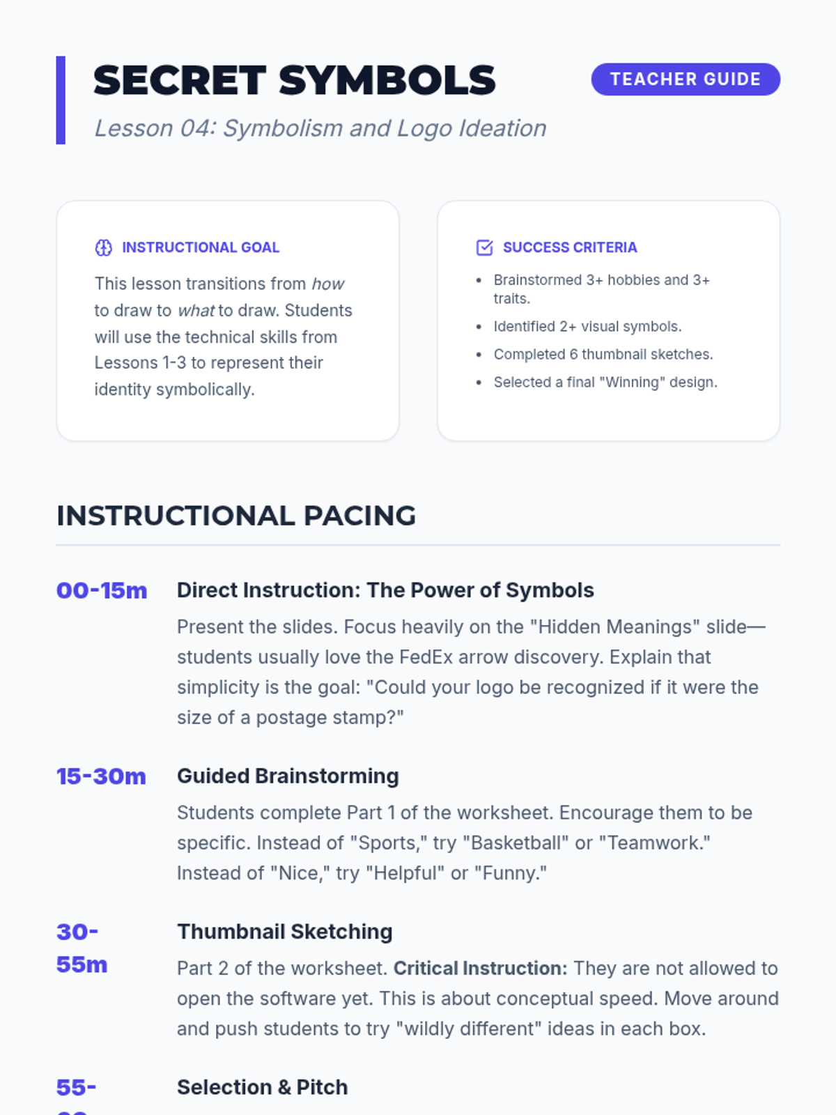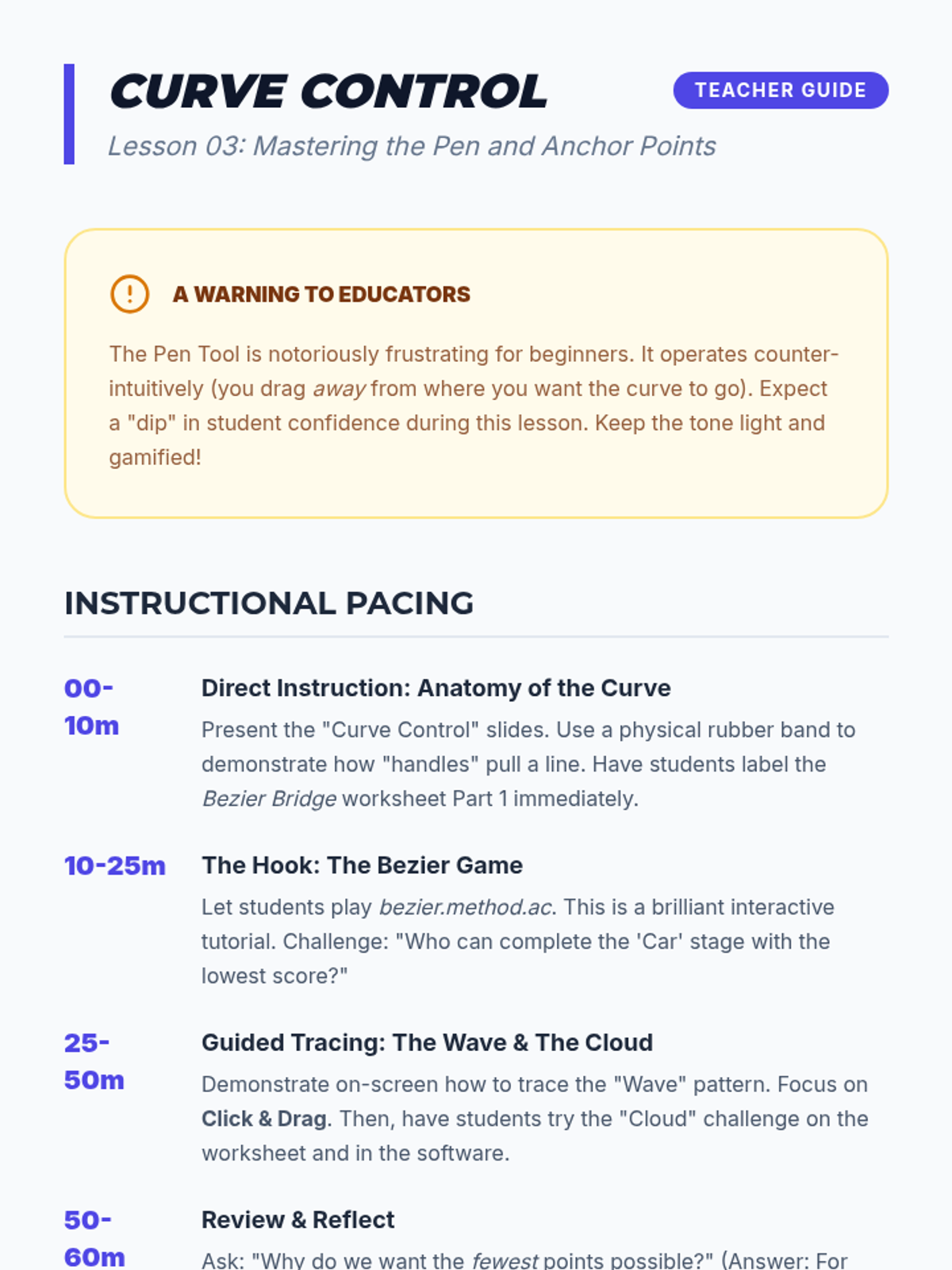 A comprehensive 5-lesson sequence for 6th graders on vector illustration, focusing on the technical differences between raster and vector graphics, mastering shape-building and pen tools, and creating a personal logo. Students move from basic geometry to complex symbolic design.