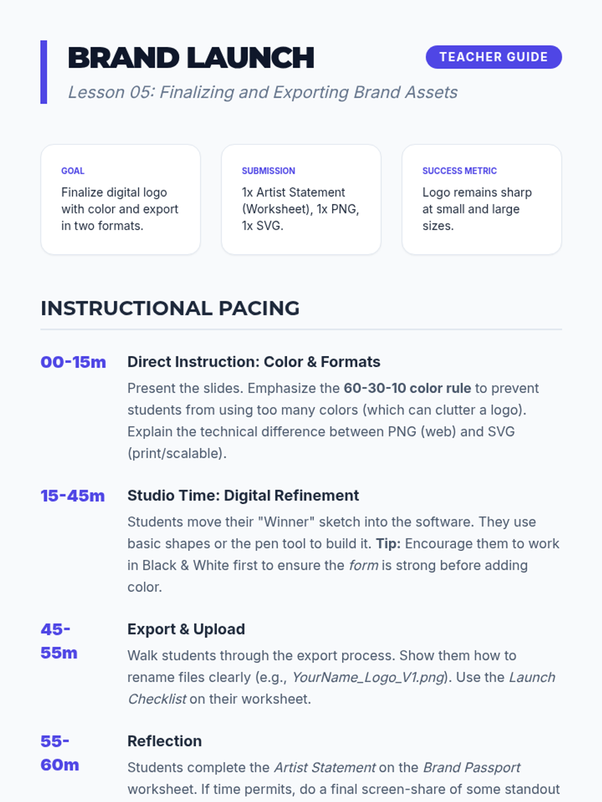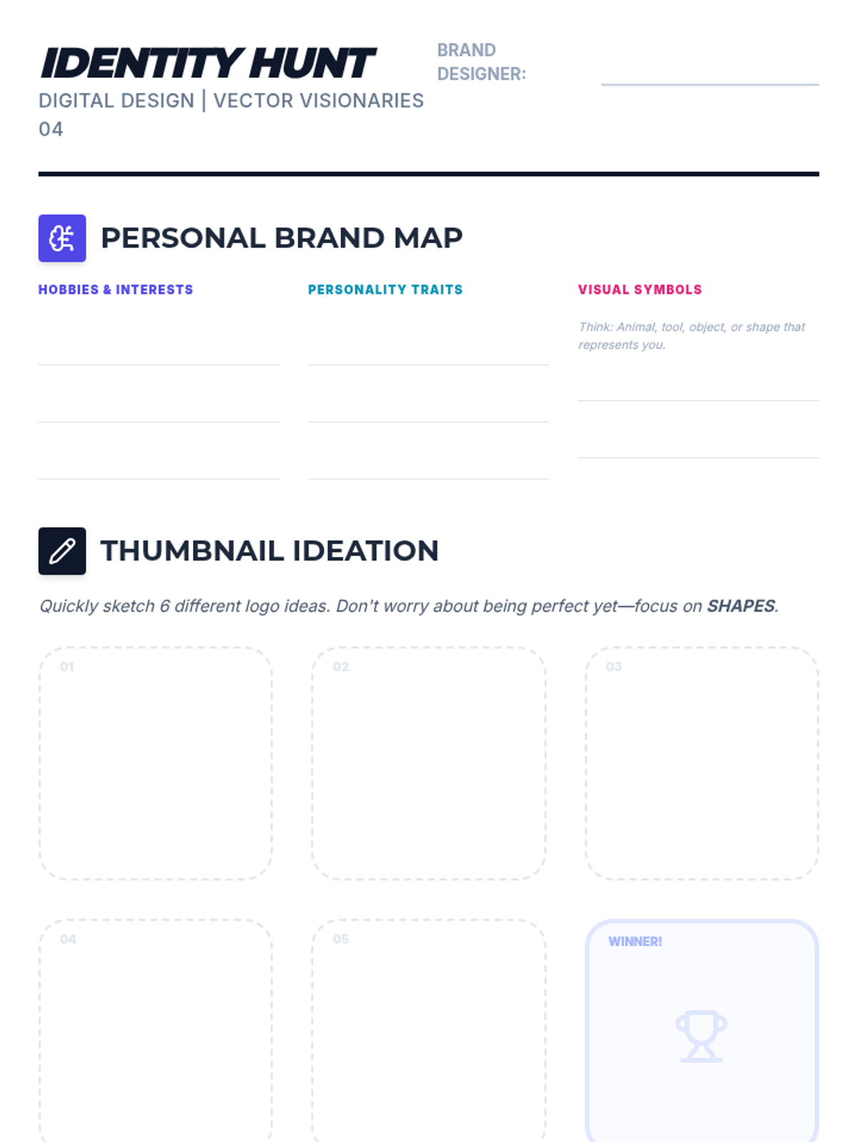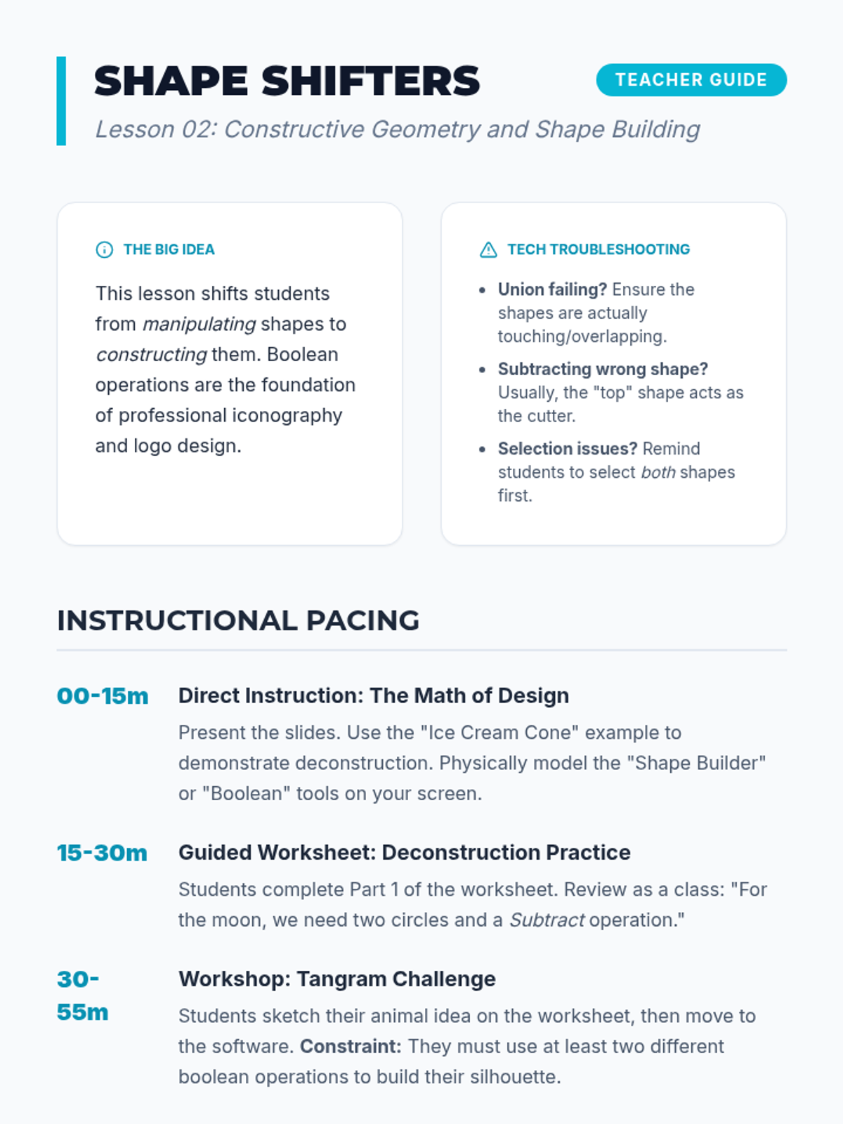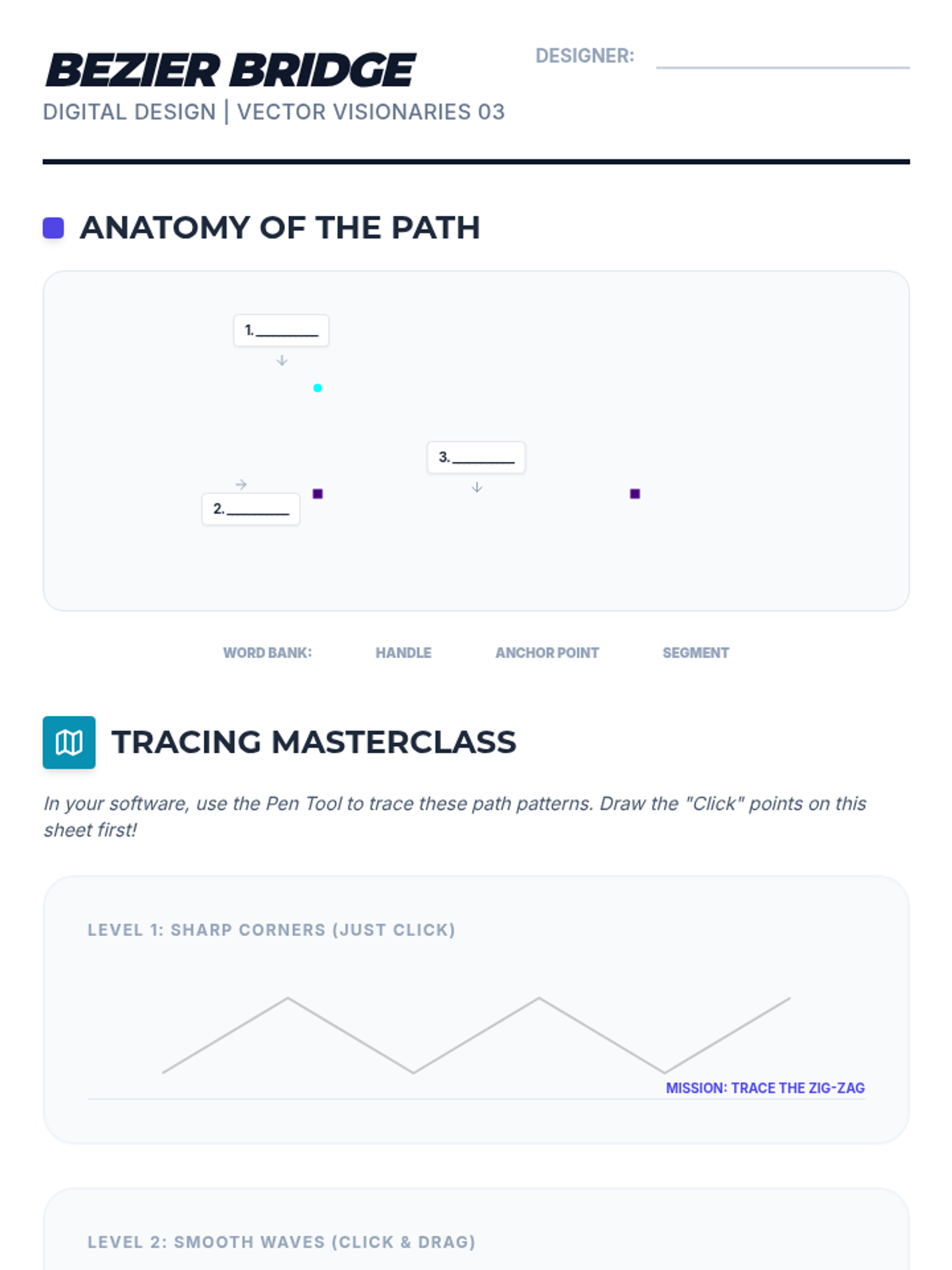 A comprehensive 5-lesson sequence for 6th graders on vector illustration, focusing on the technical differences between raster and vector graphics, mastering shape-building and pen tools, and creating a personal logo. Students move from basic geometry to complex symbolic design.