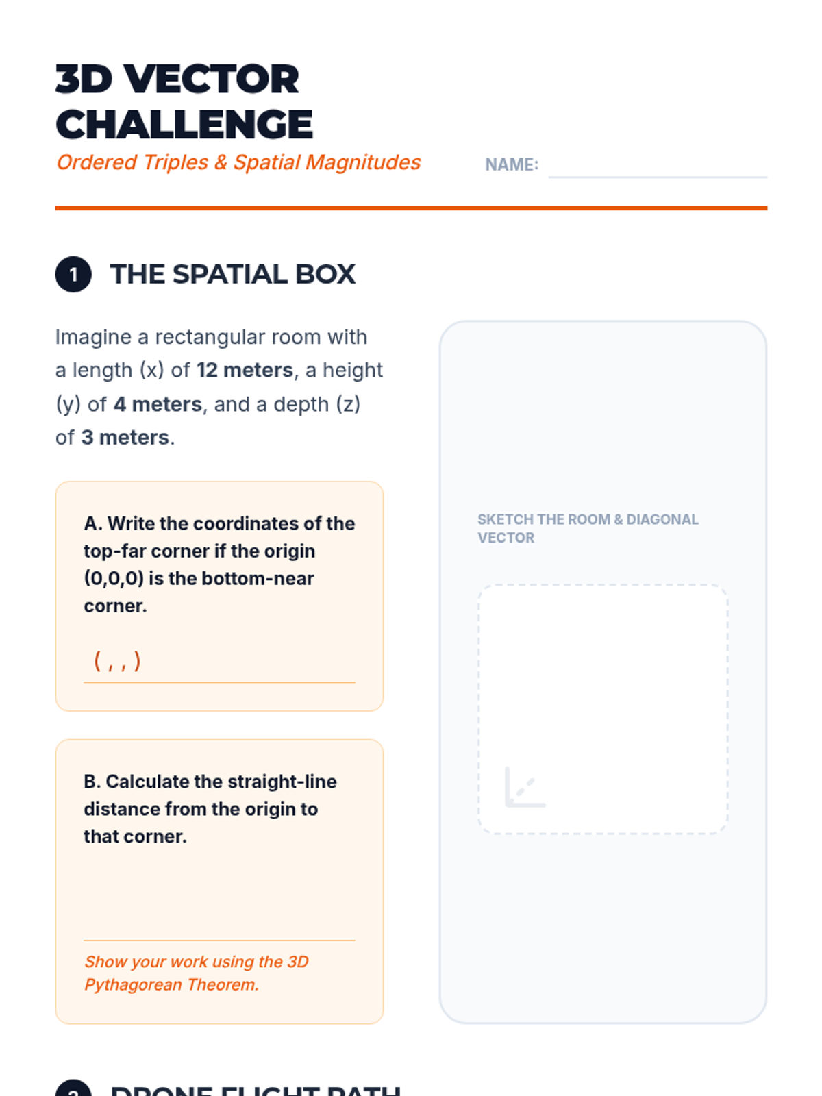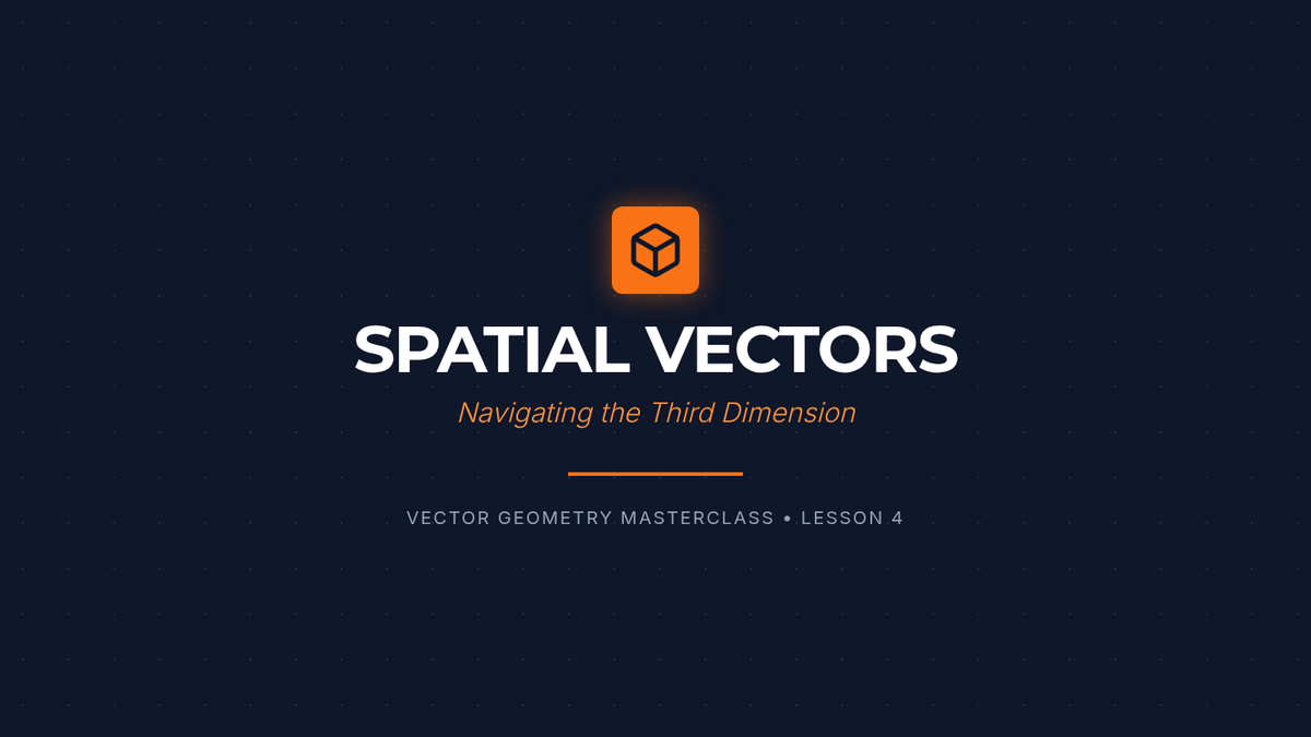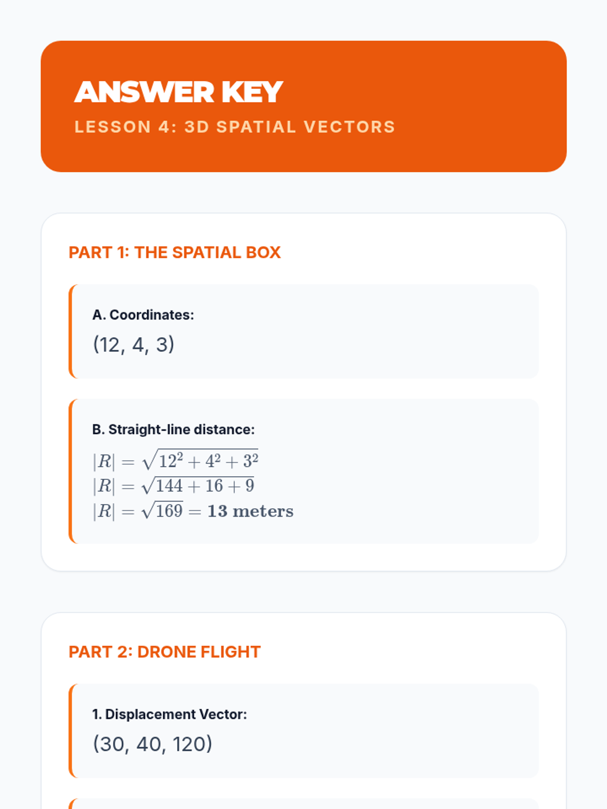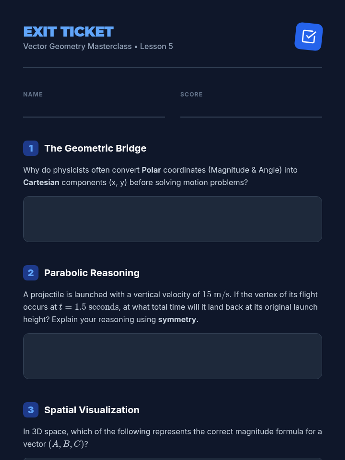 This skill-building sequence focuses on the application of coordinate geometry to solve physics problems involving vectors and kinematics. Students progress from 2D coordinate systems to 3D spatial vectors and parabolic trajectories, mastering the translation of physical motion into geometric models.