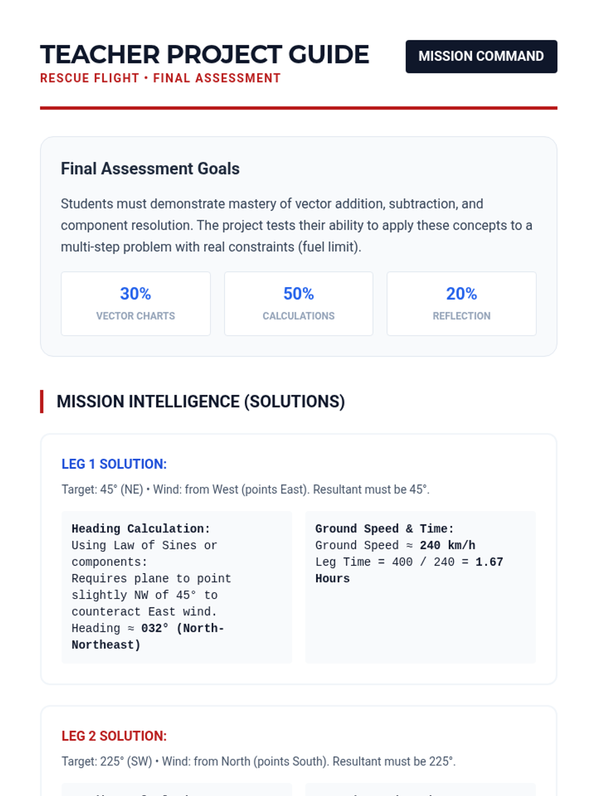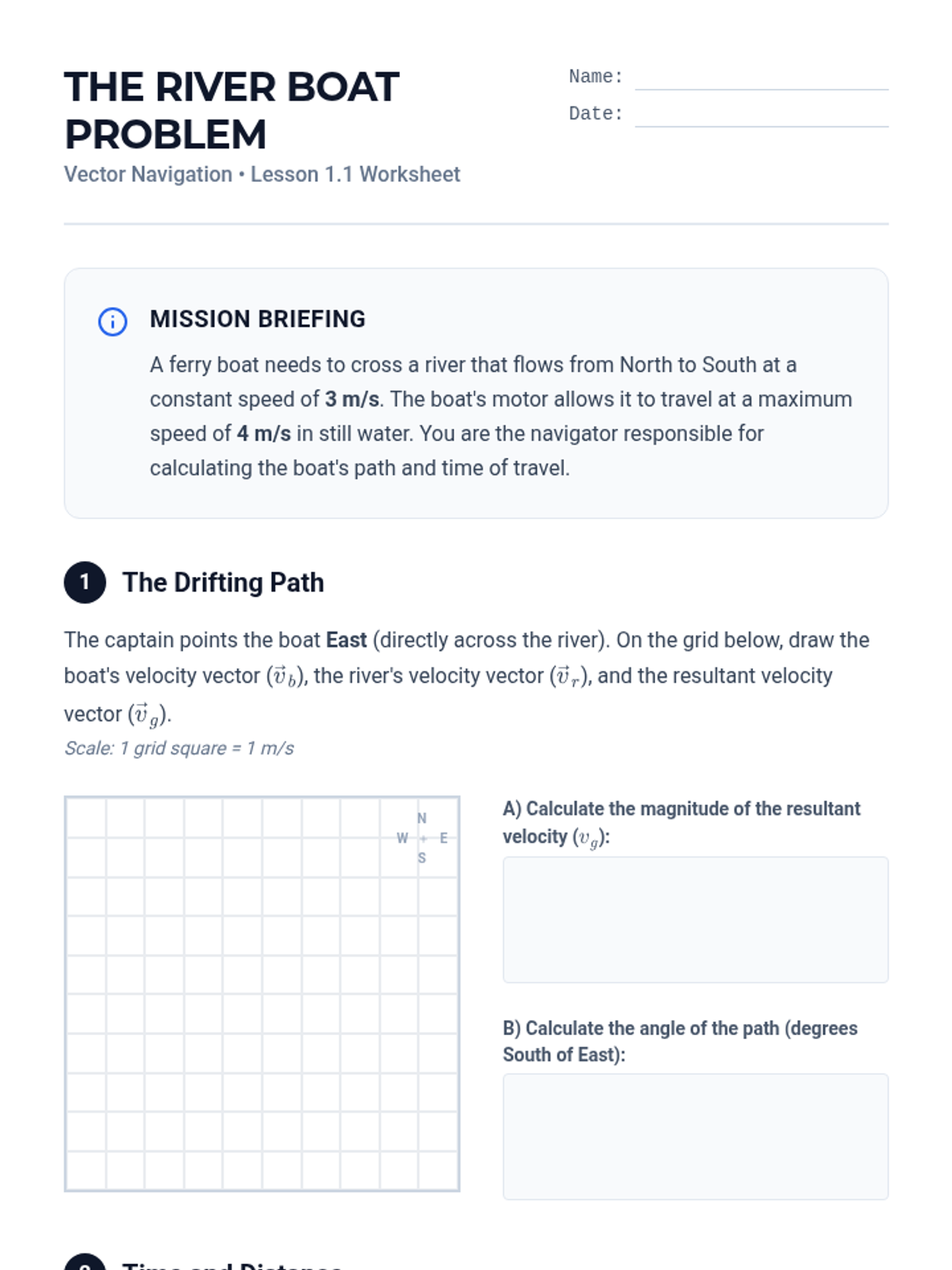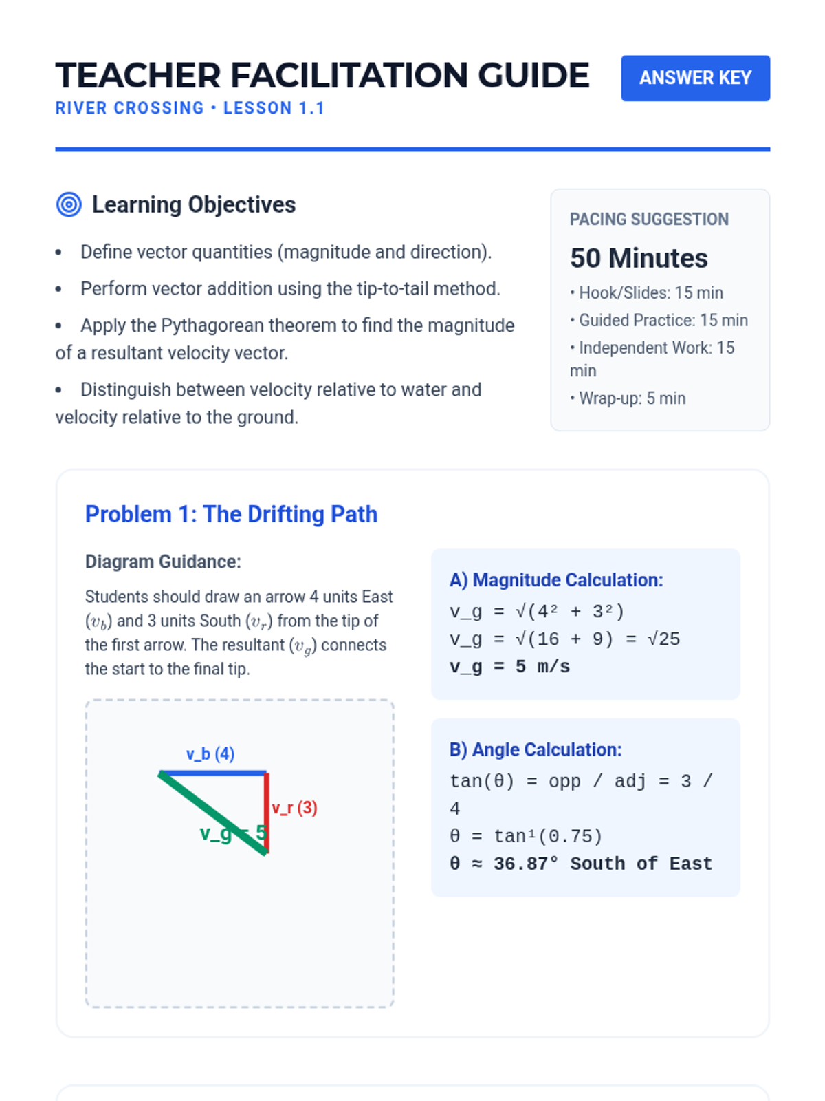 A 9th-grade sequence applying vector theory to navigation and physics. Students explore relative velocity, wind correction, equilibrium, and inclined planes through simulation and project-based learning.