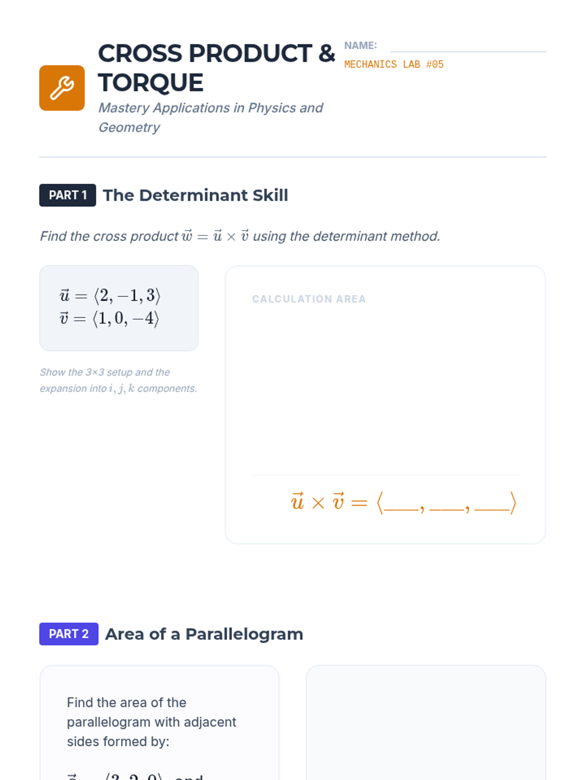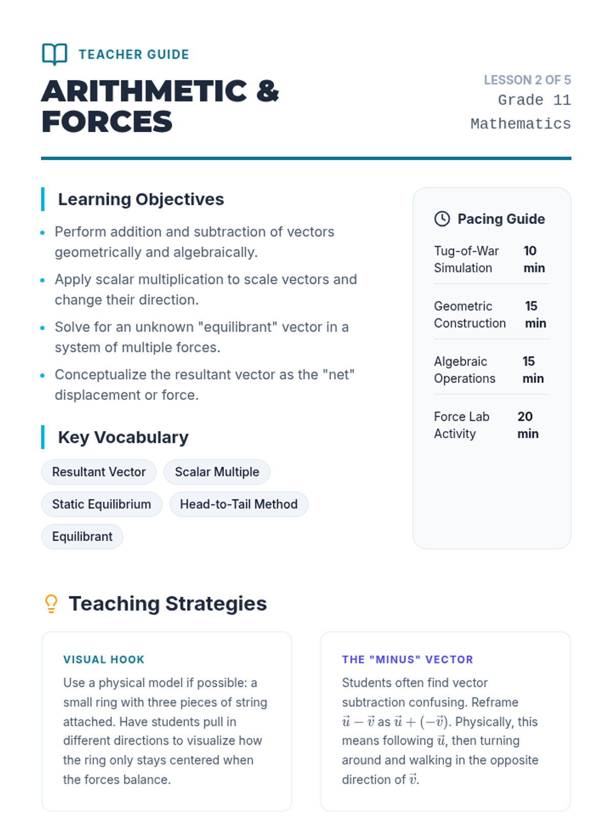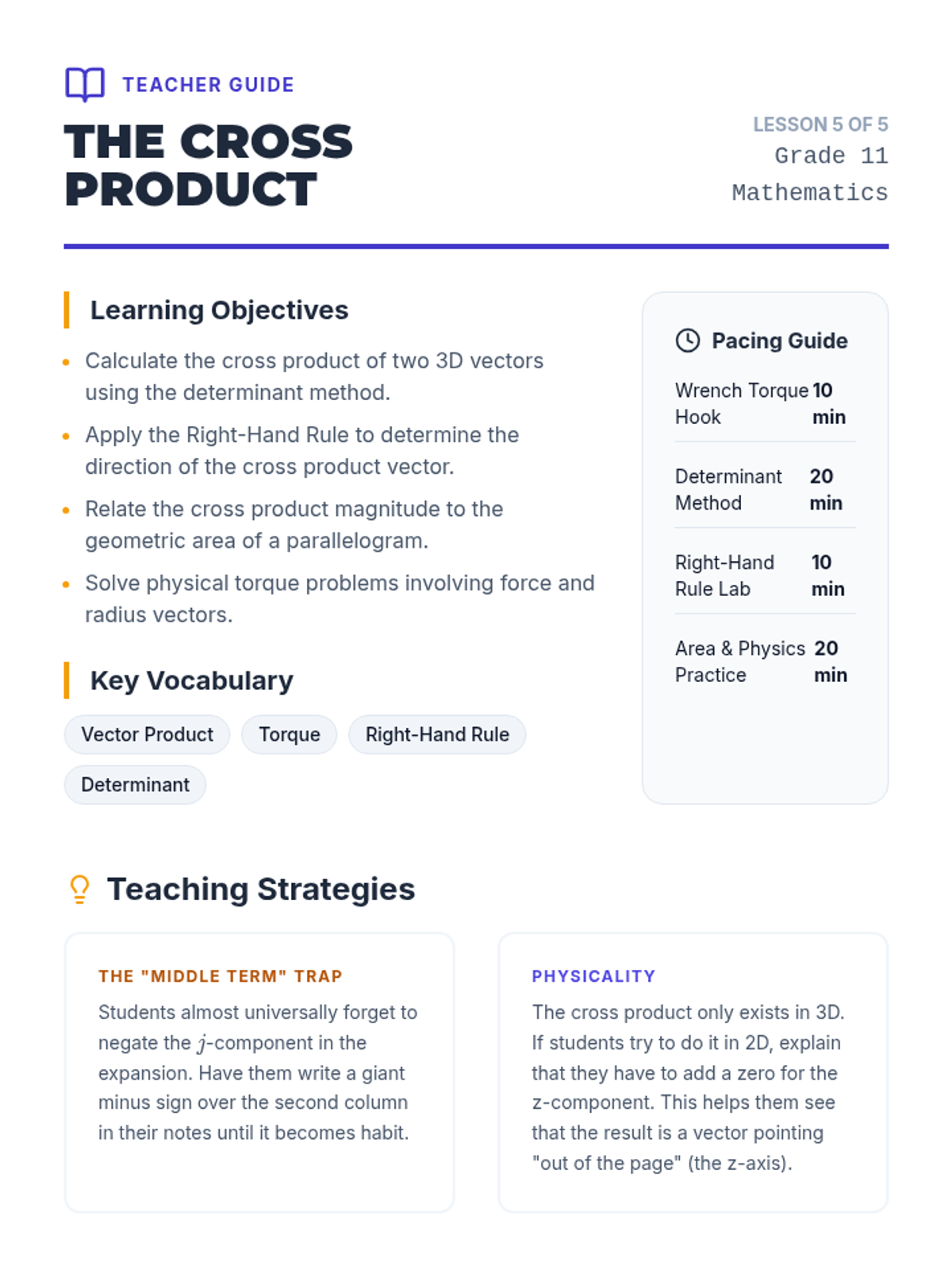 This sequence guides students through the fundamental operations of vector analysis, bridging the gap between geometric visualization and algebraic computation. Students progress from 2D component forms to 3D spatial analysis and complex products, applying their knowledge to physics-based problems like work and torque.