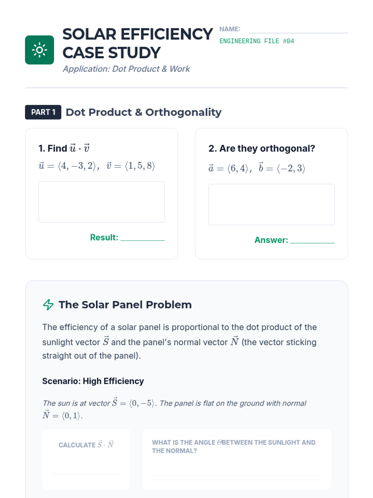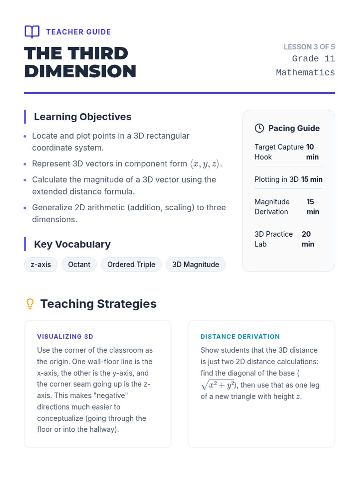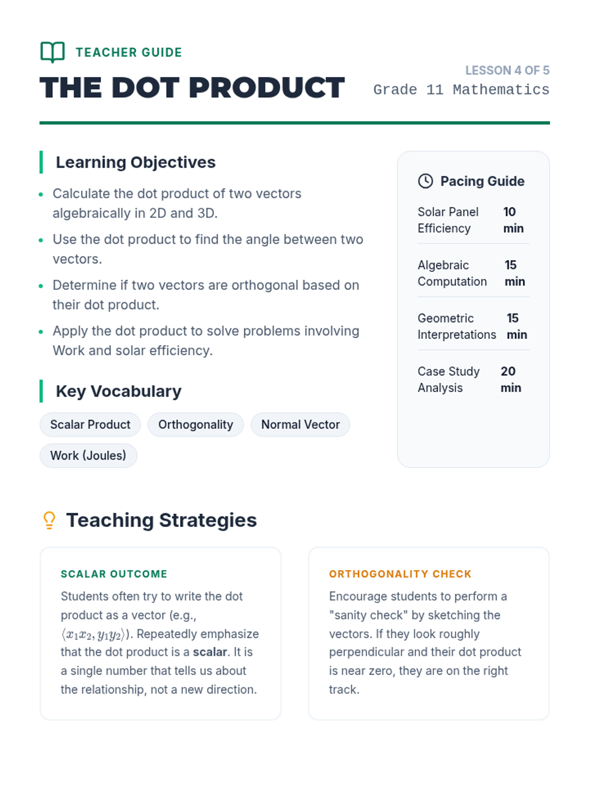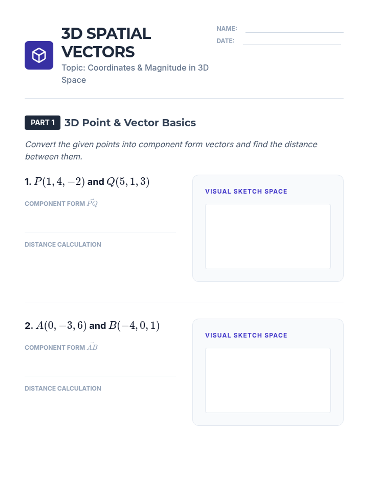 This sequence guides students through the fundamental operations of vector analysis, bridging the gap between geometric visualization and algebraic computation. Students progress from 2D component forms to 3D spatial analysis and complex products, applying their knowledge to physics-based problems like work and torque.
