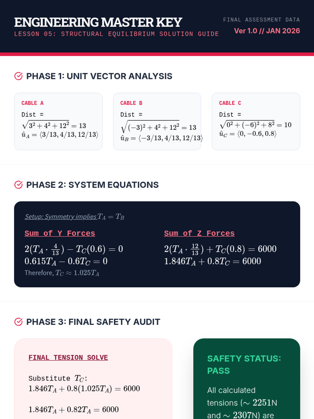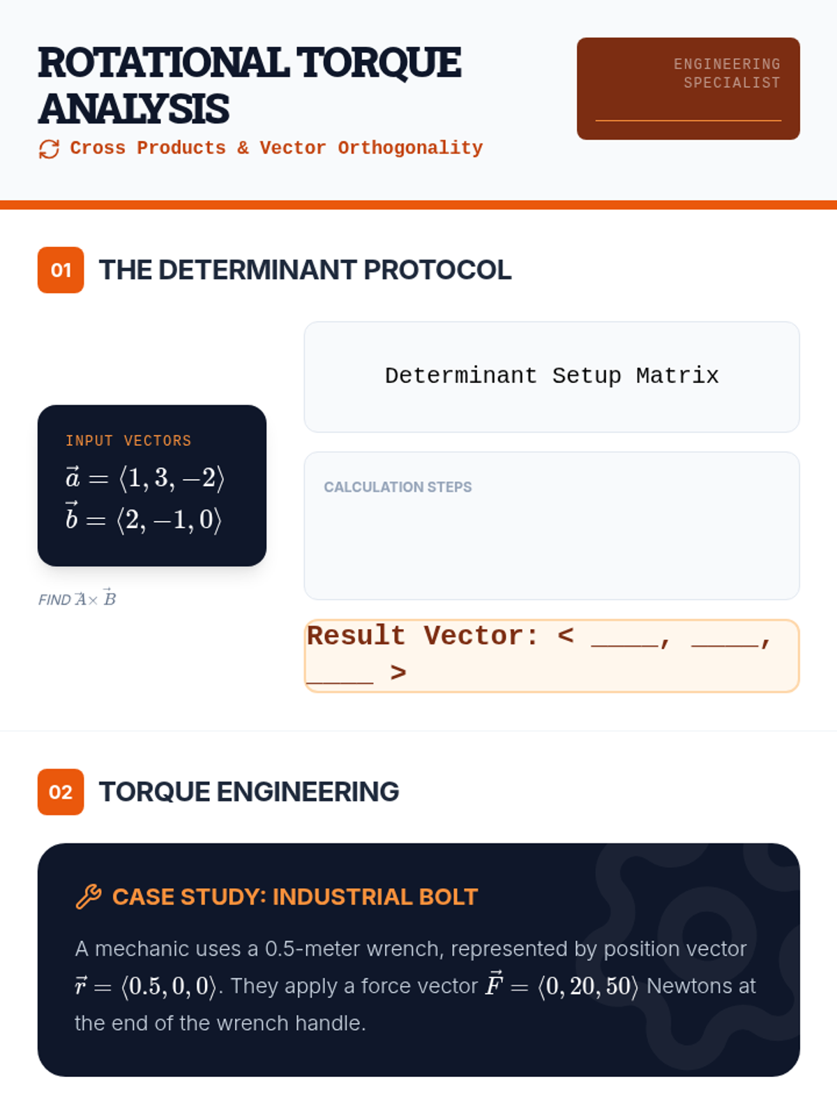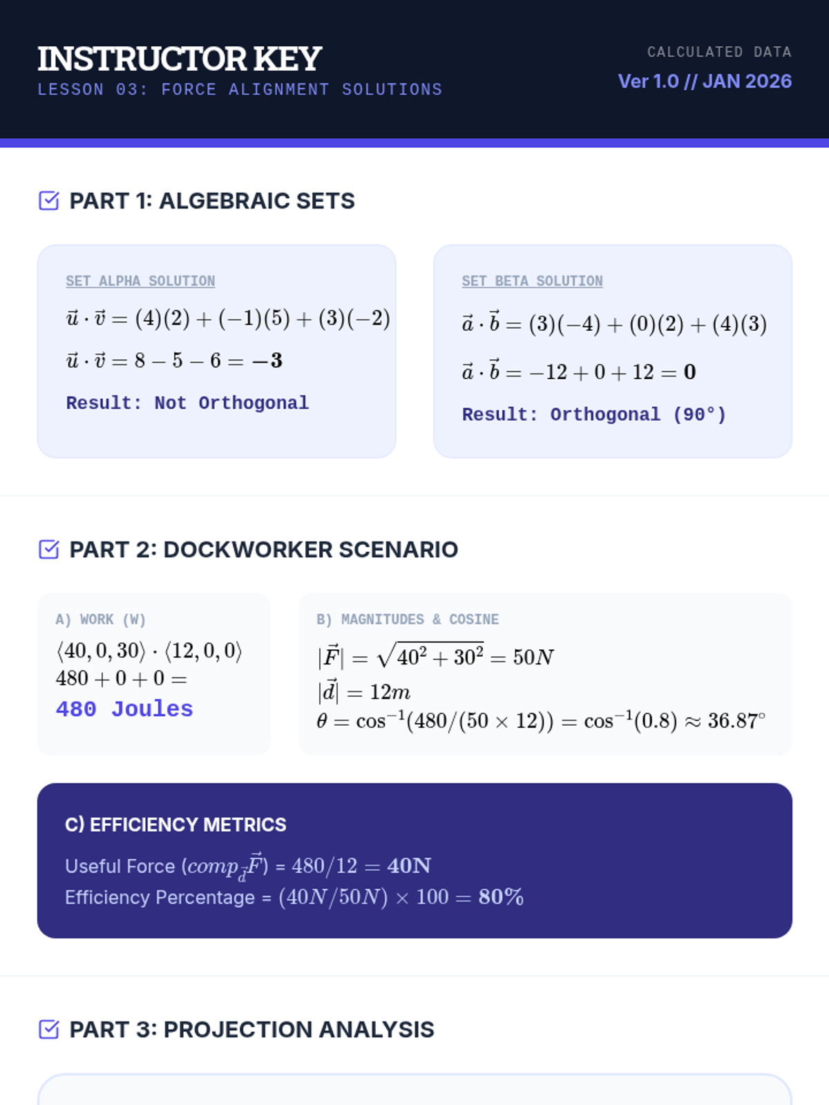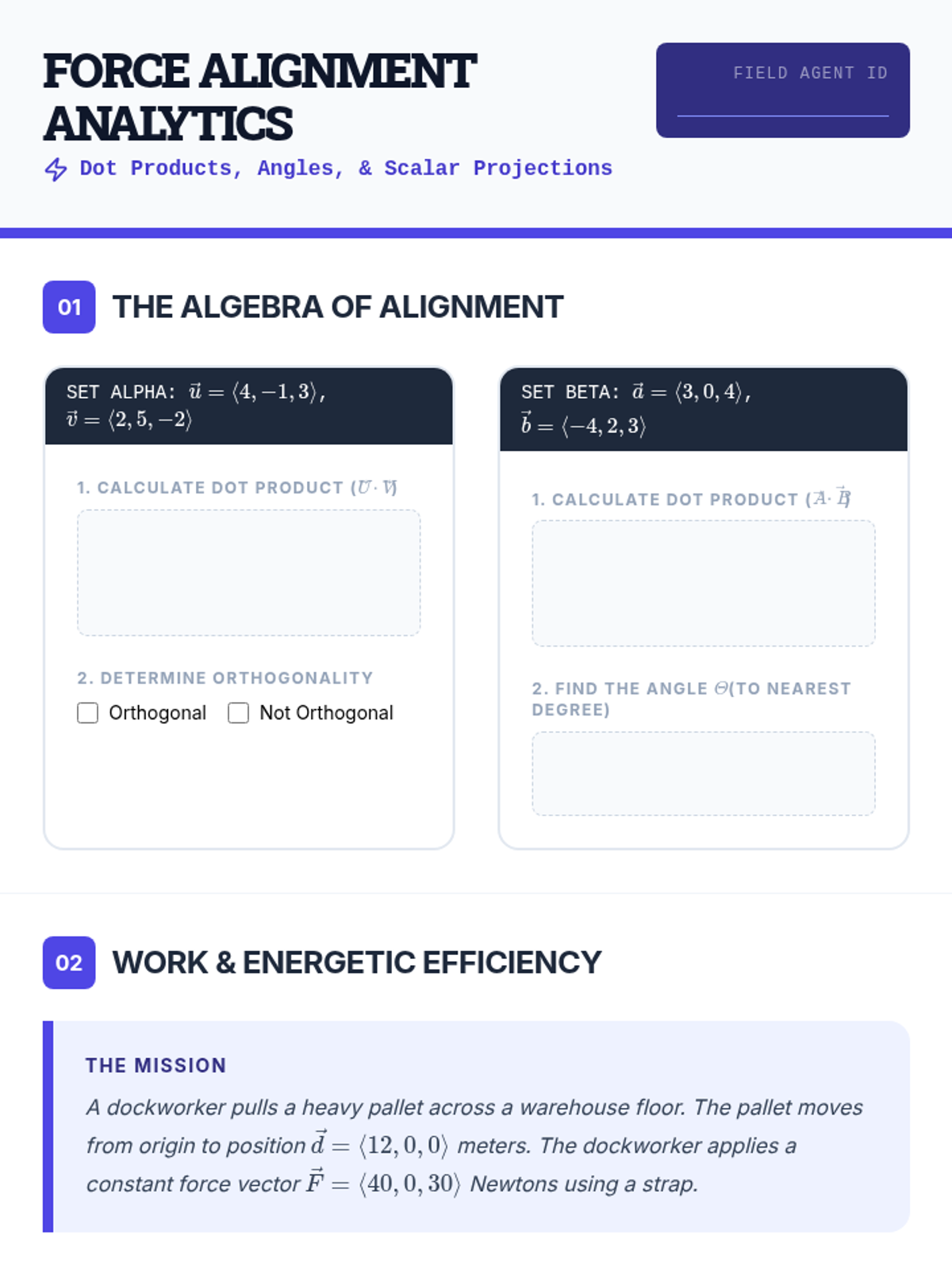 A comprehensive 12th-grade unit on vector operations, transitioning from 2D arithmetic to complex 3D applications including dot products, cross products, and static equilibrium in engineering contexts.