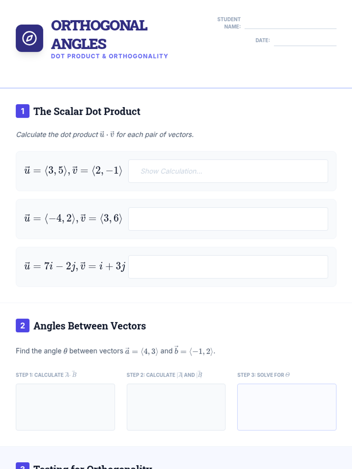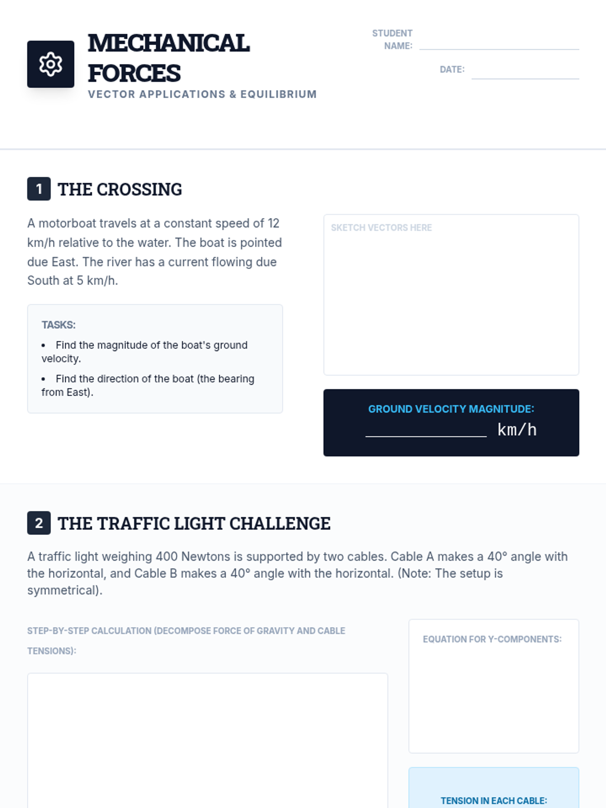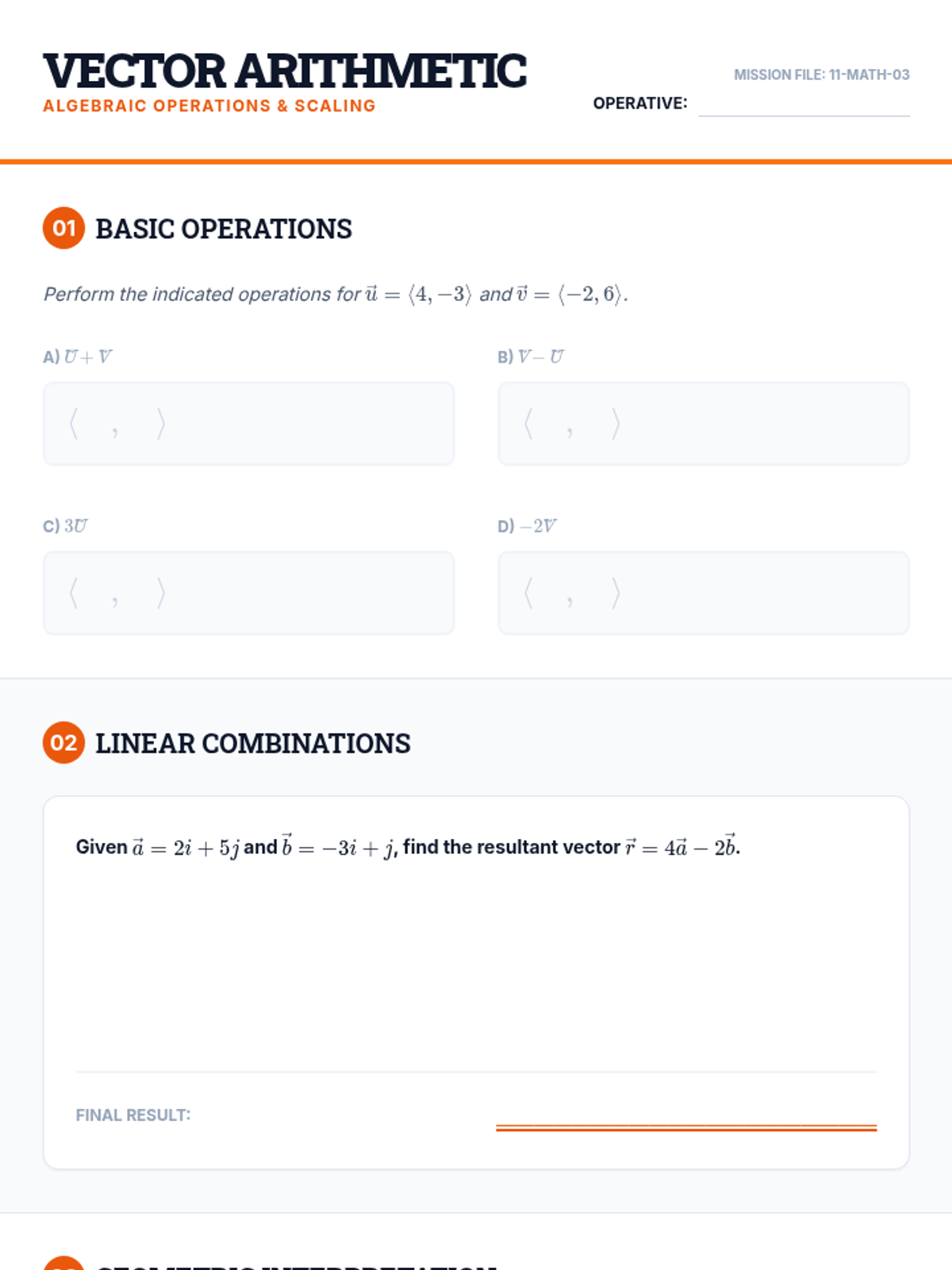 A comprehensive introduction to vector analysis for 11th-grade students, moving from geometric representations to algebraic components and real-world mechanical applications. Students master vector addition, scalar multiplication, the dot product, and force decomposition.