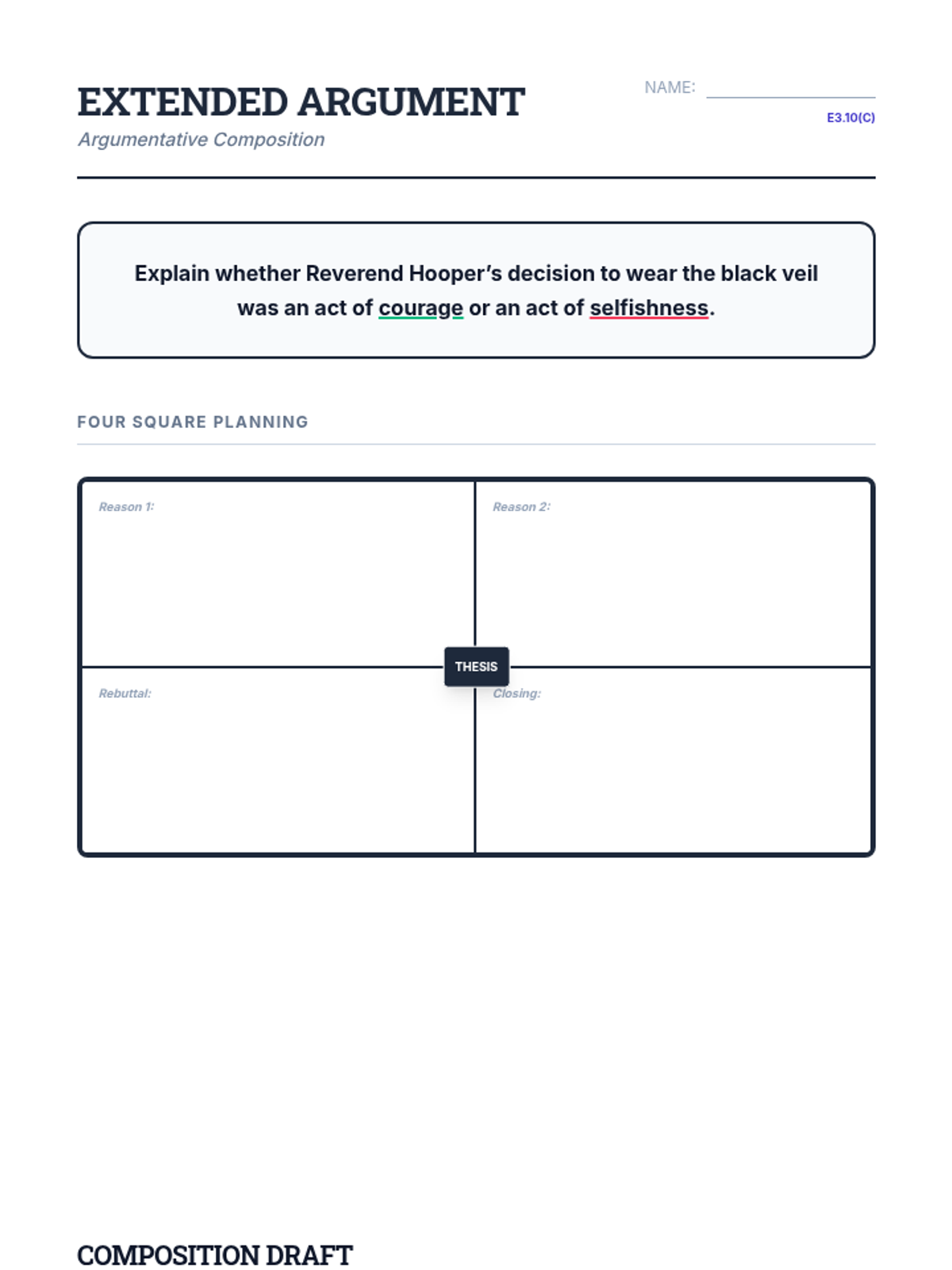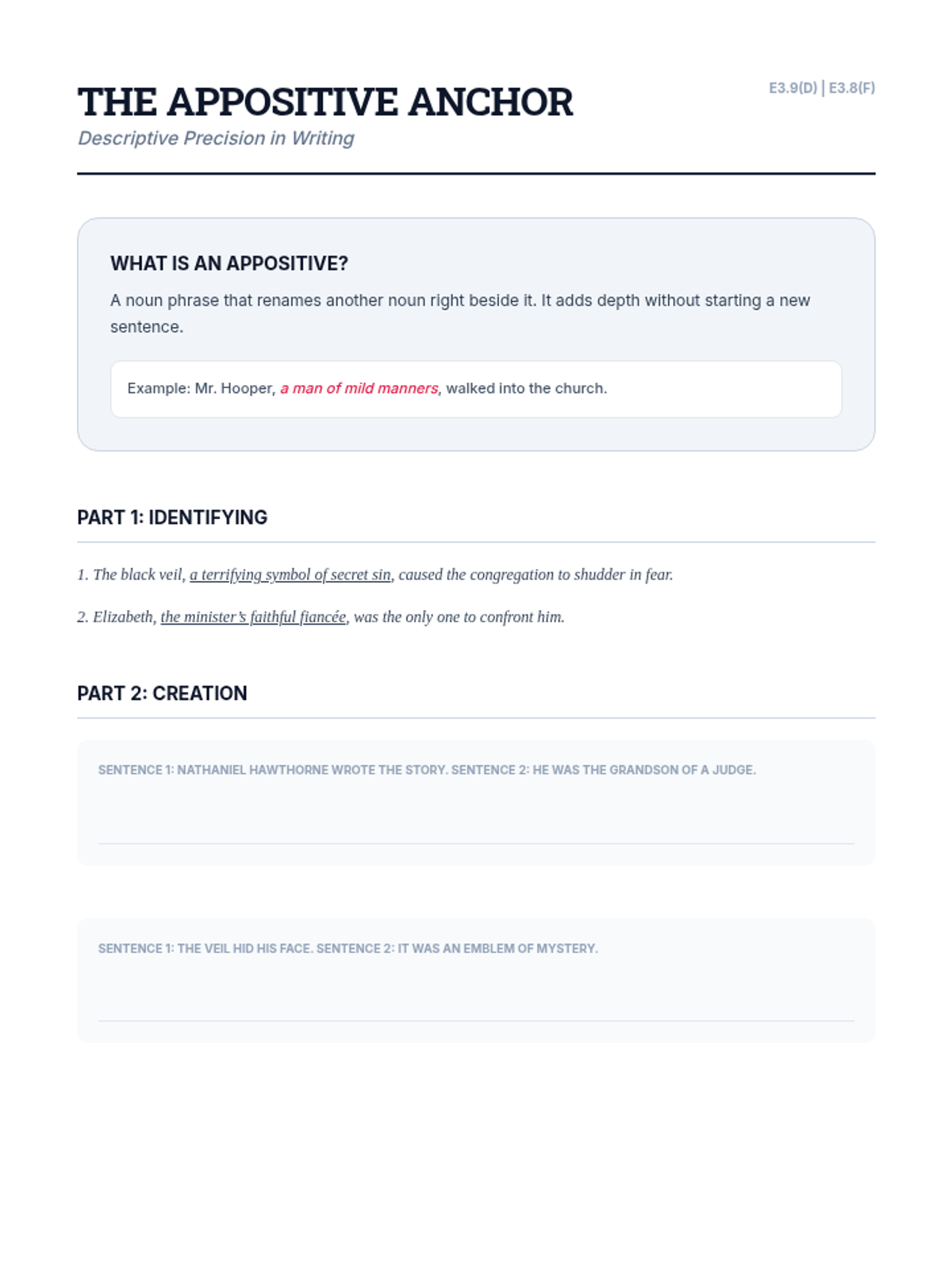 A 4-day intensive study of Nathaniel Hawthorne's 'The Minister's Black Veil,' focusing on literary analysis, theme development, and argumentative writing through the lens of Dark Romanticism and Puritan values. Students explore the ambiguity of symbols and the complexities of human guilt while mastering appositive phrases and constructing high-quality academic responses.