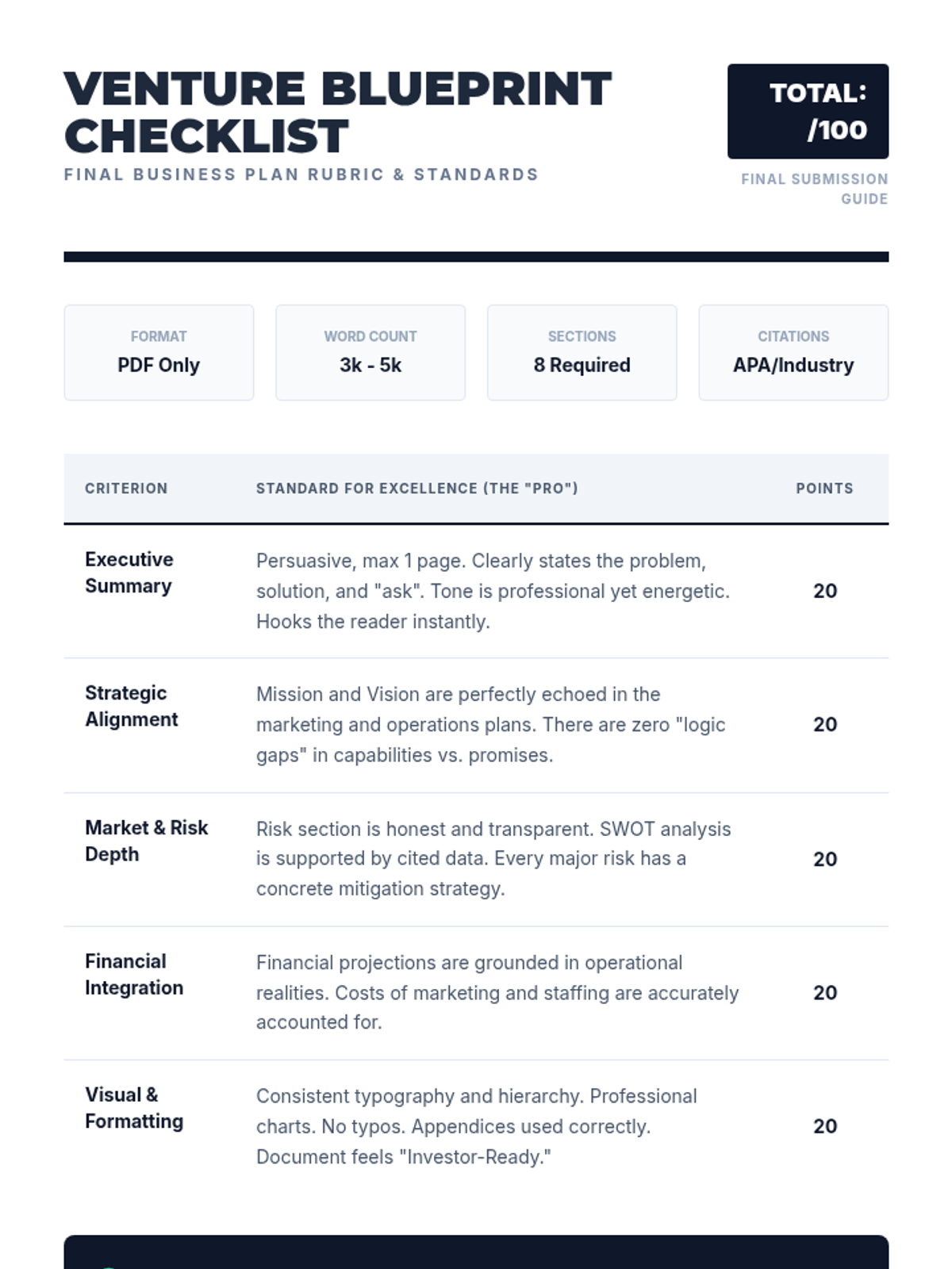 A comprehensive guide to building a professional business plan, from the first hook to the final polish. Students will master the art of persuasive business writing, structural integrity, and risk assessment to create a document ready for academic or professional review.