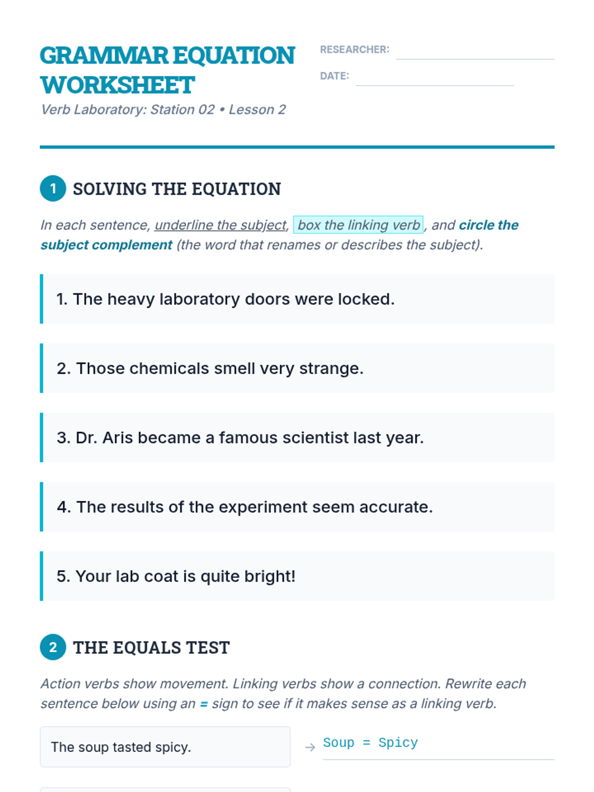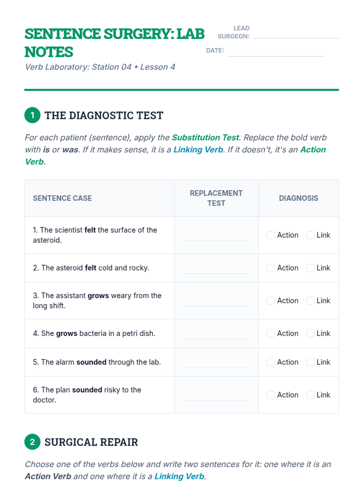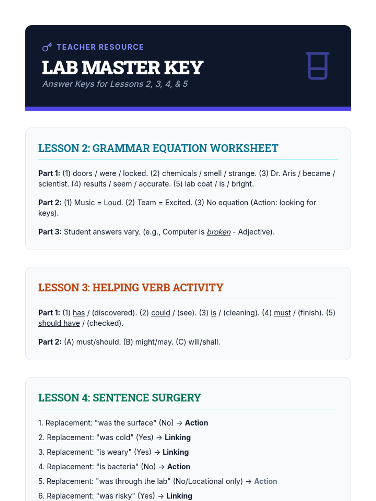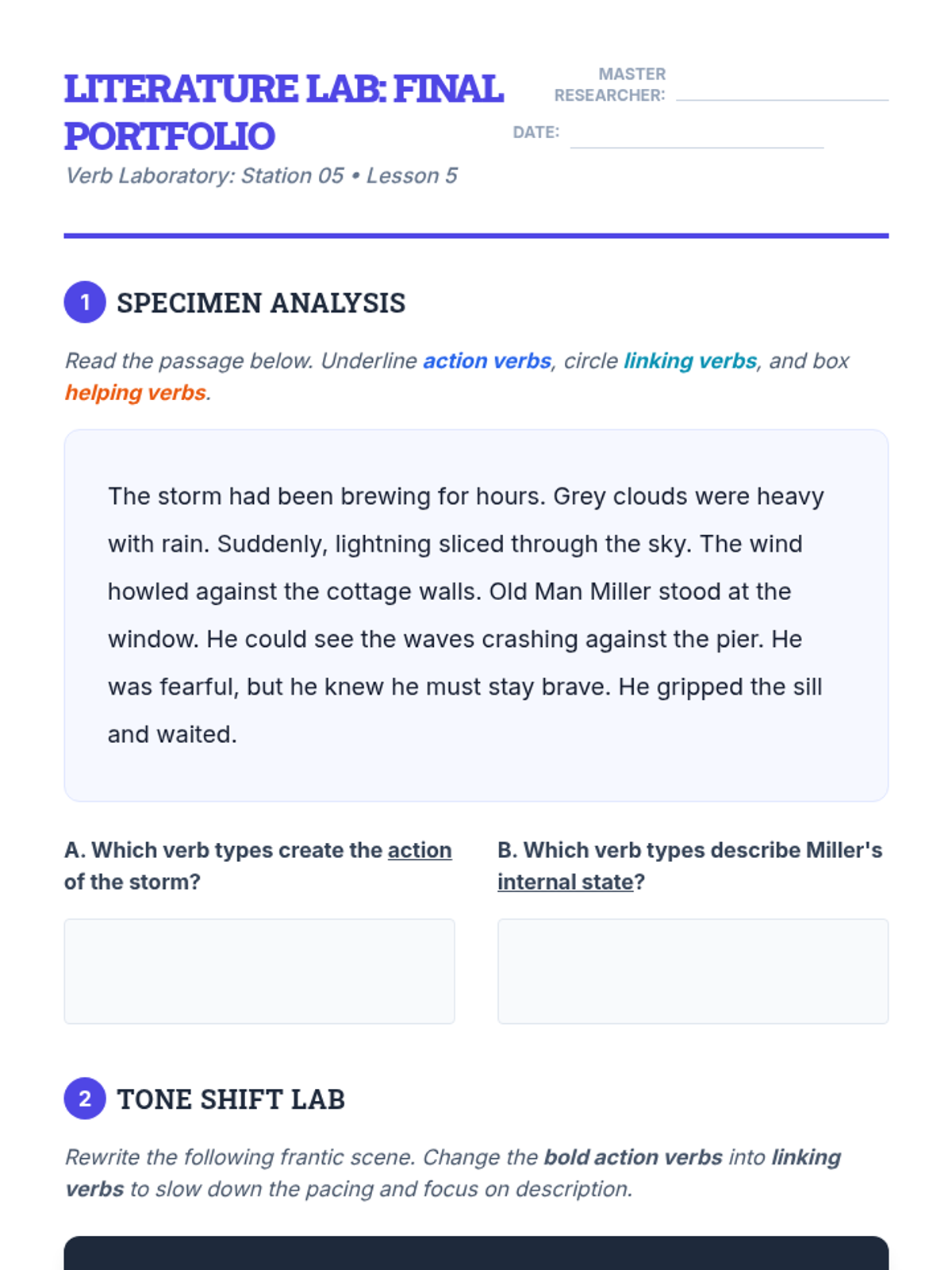 A comprehensive 6th-grade ELA sequence focused on the functions and categories of verbs. Students move from basic action identification to the sophisticated use of linking and helping verbs to enhance their writing.