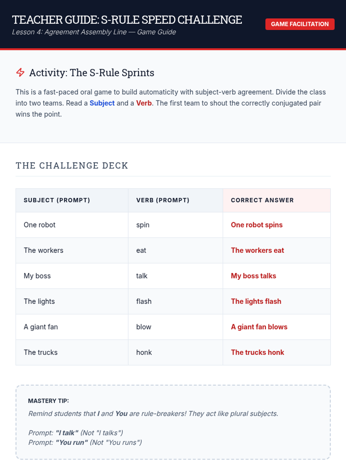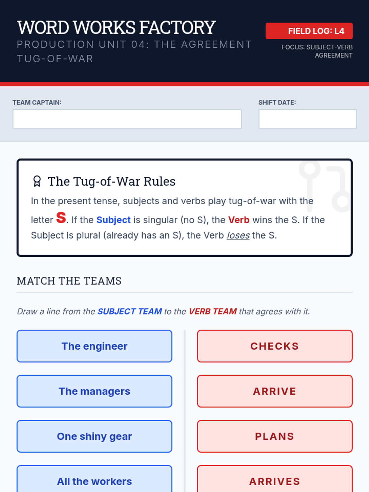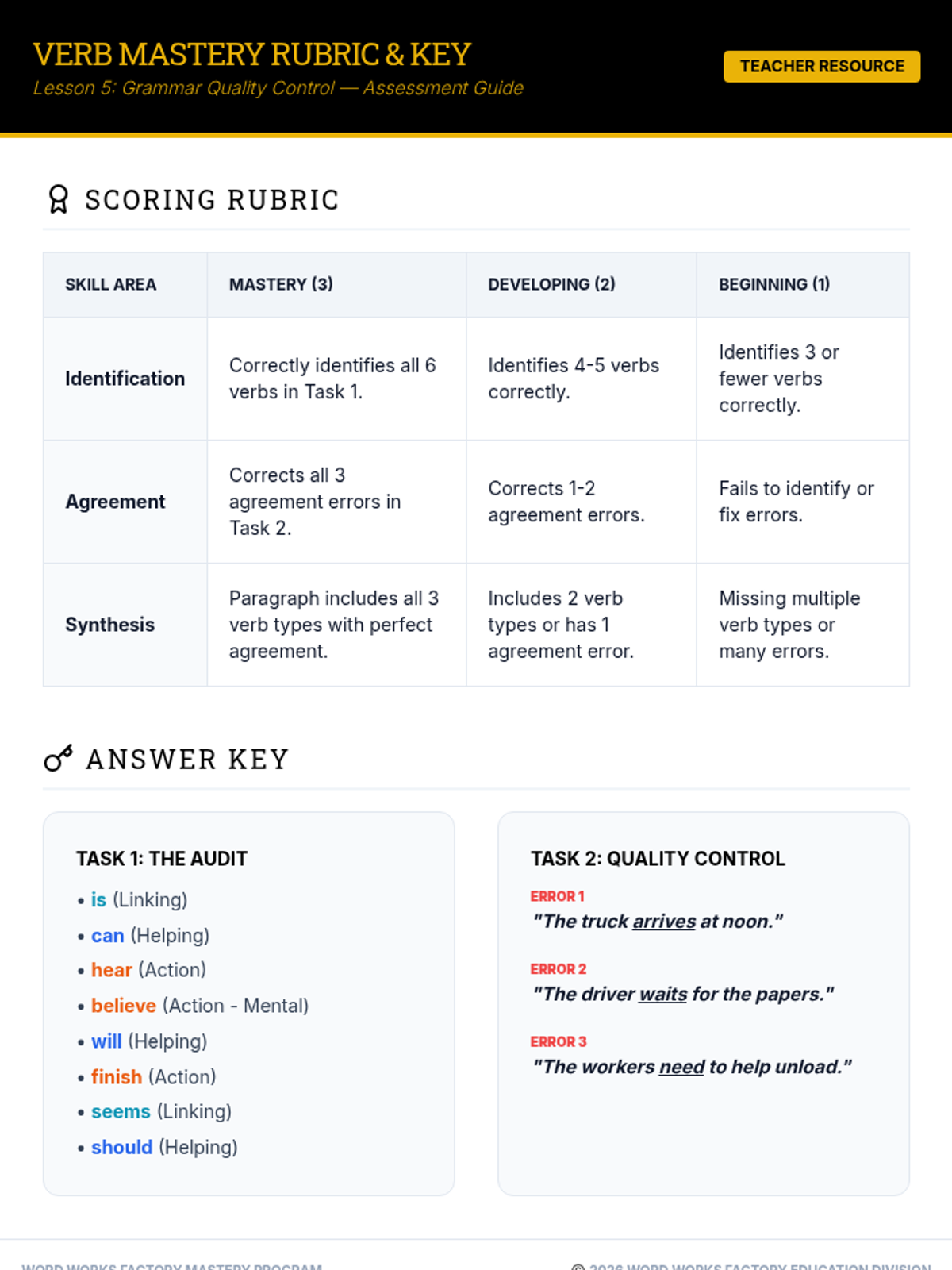 A comprehensive sequence for 4th-grade students to master action, linking, and helping verbs, culminating in applying subject-verb agreement rules through a factory-themed learning journey.