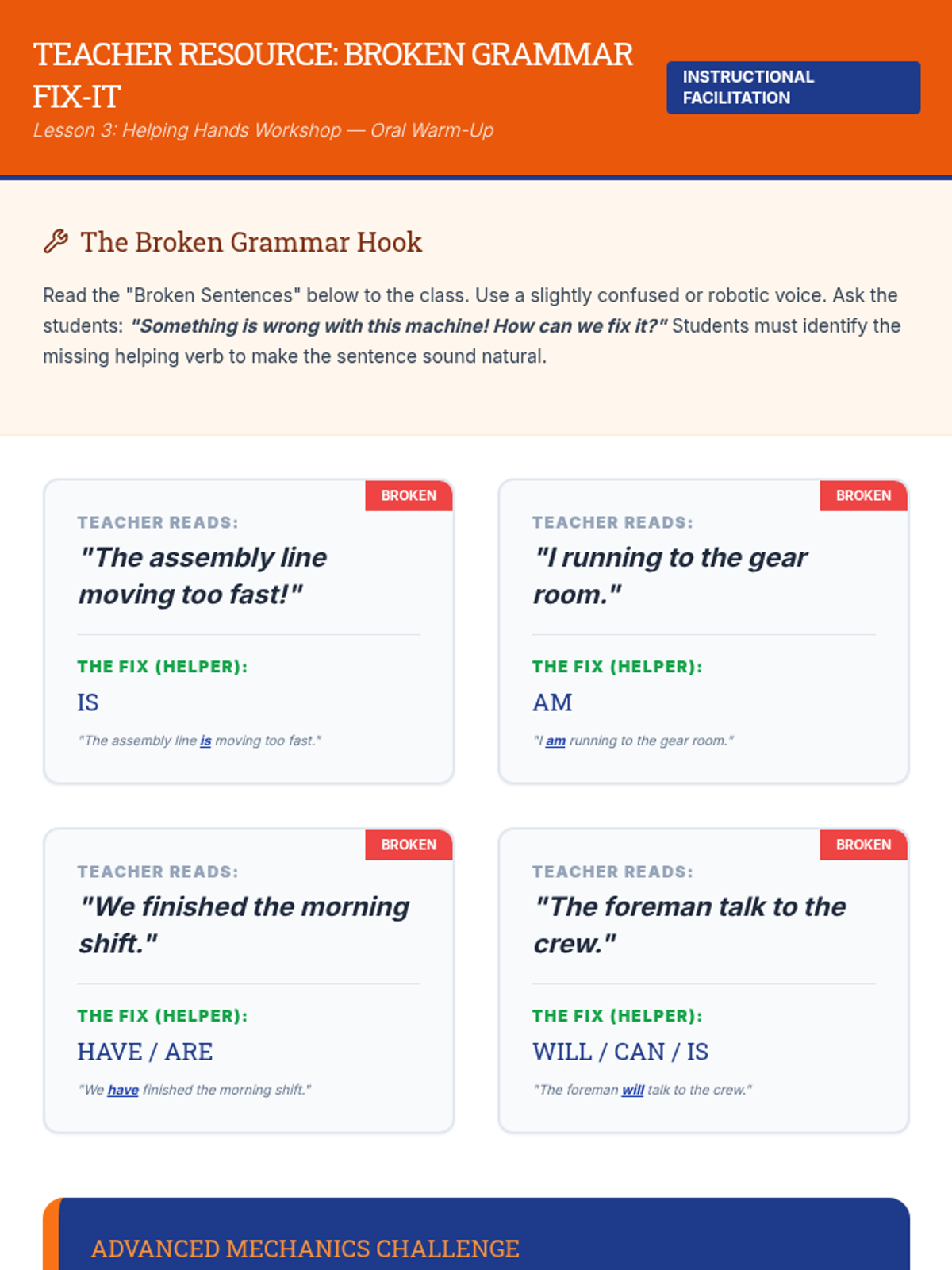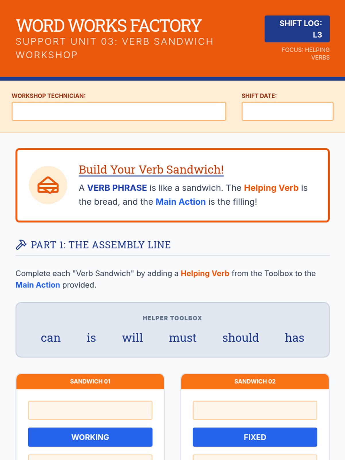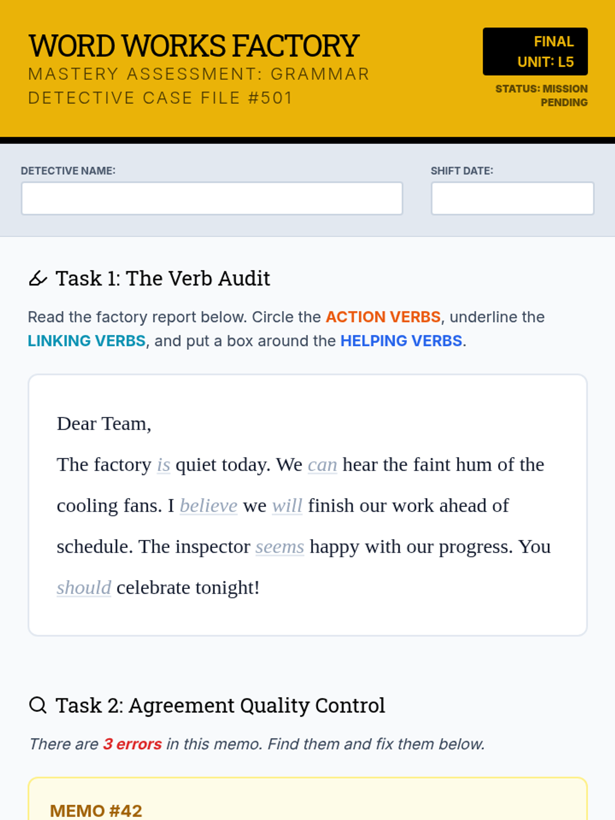 A comprehensive sequence for 4th-grade students to master action, linking, and helping verbs, culminating in applying subject-verb agreement rules through a factory-themed learning journey.