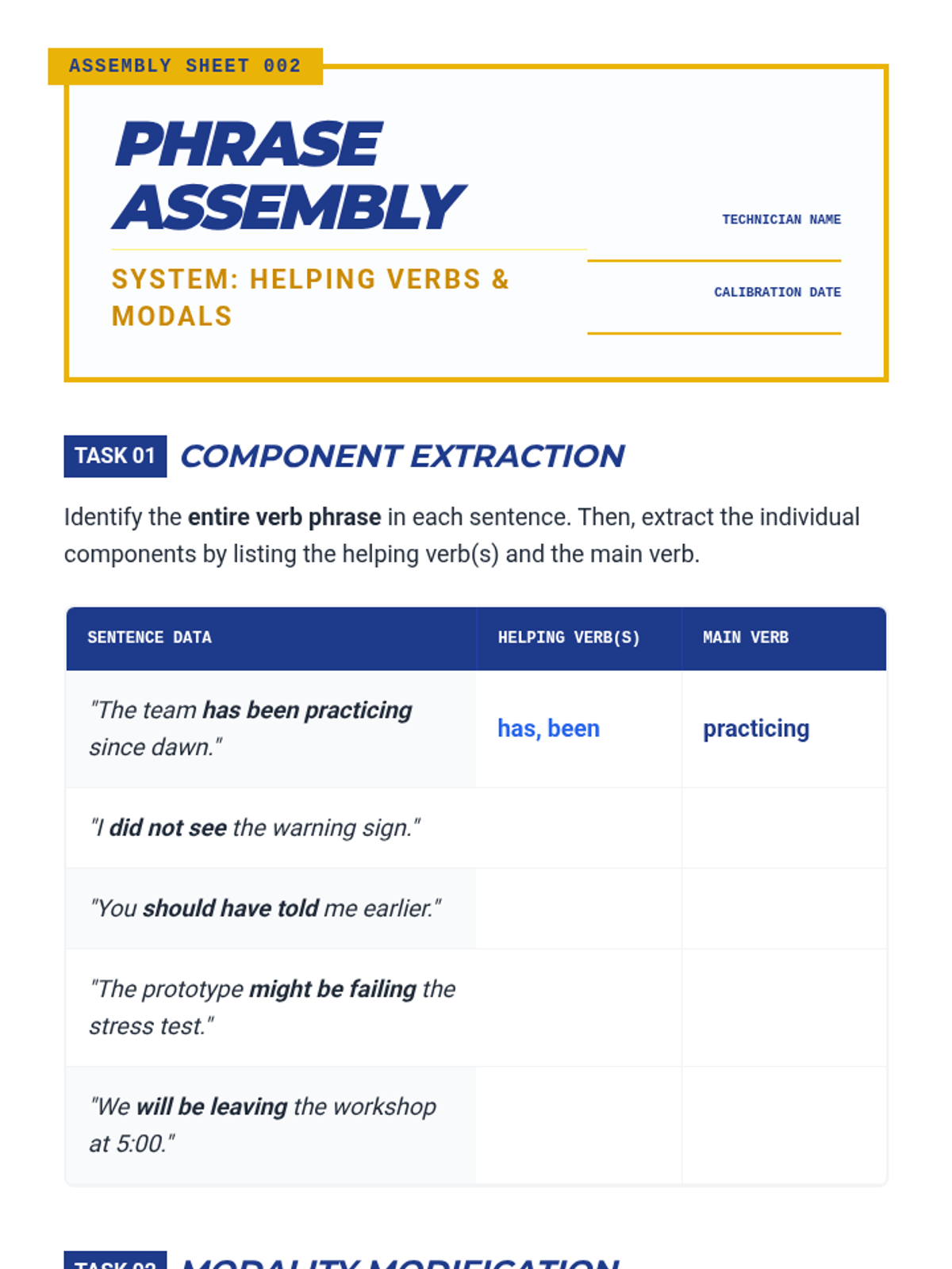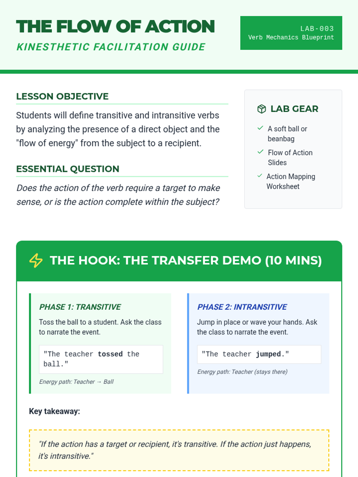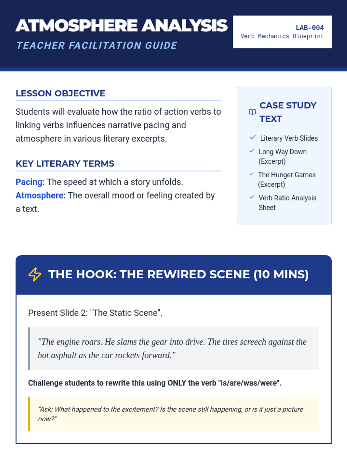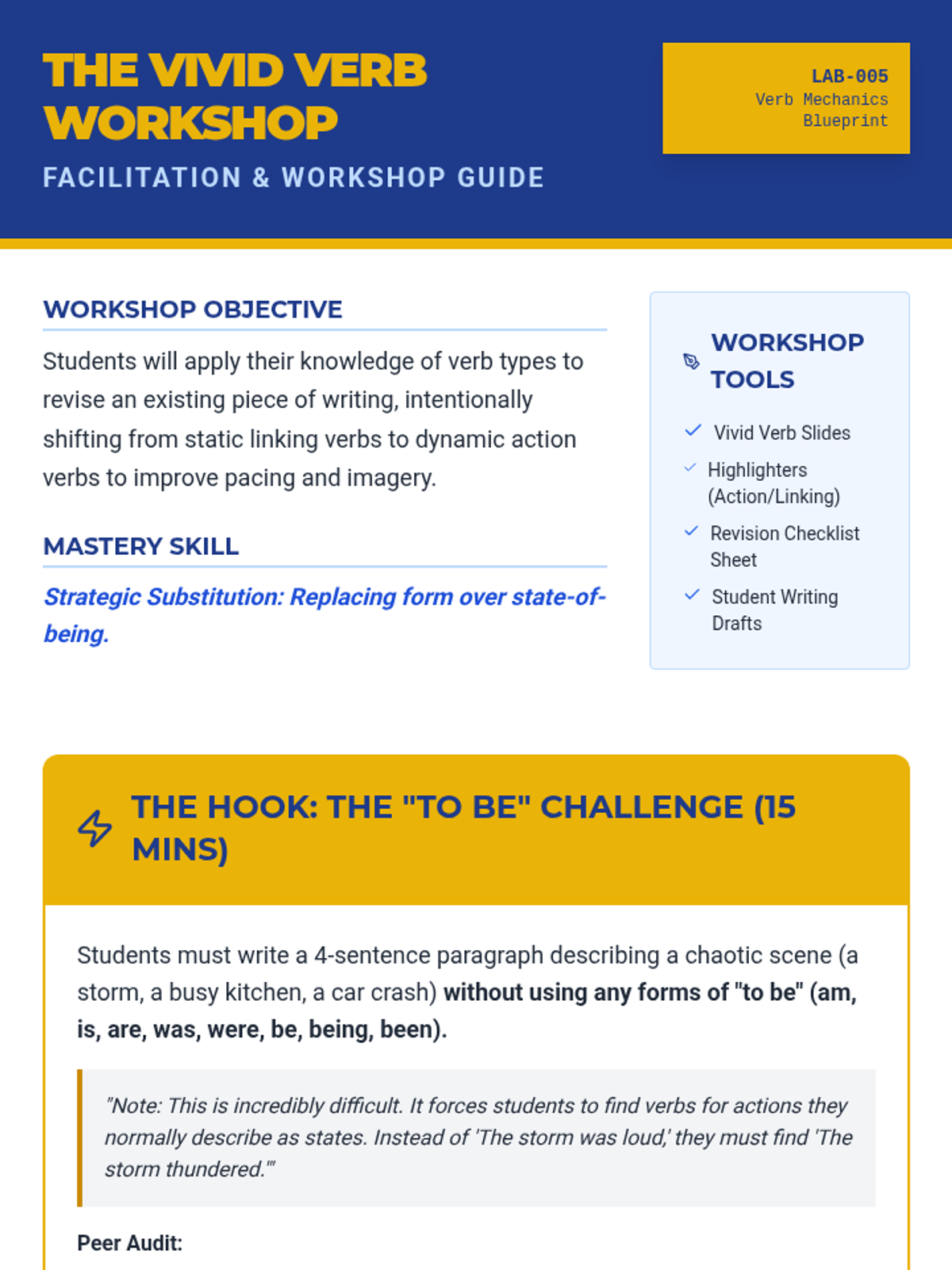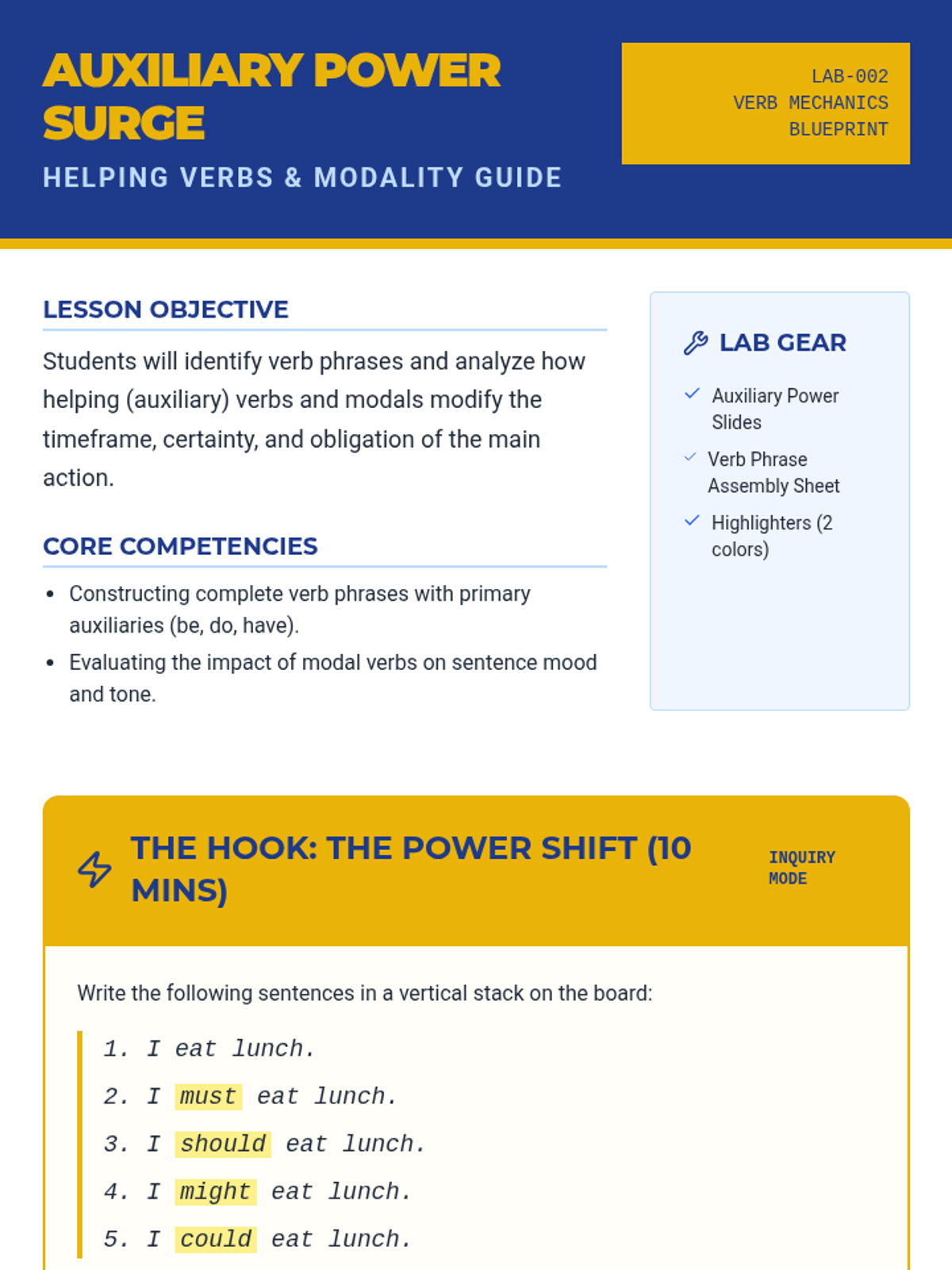 This 9th-grade grammar sequence explores the functional roles of action, linking, and helping verbs. Through inquiry and analysis, students learn to distinguish between verb types, understand the nuances of modality, and evaluate how verb choice impacts tone and pacing in literature.