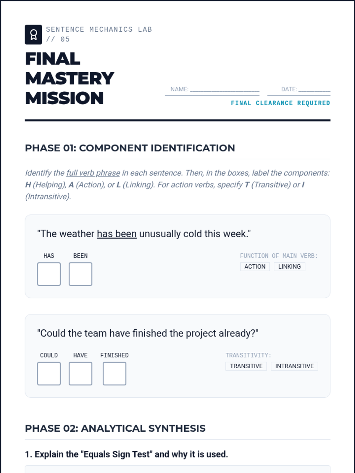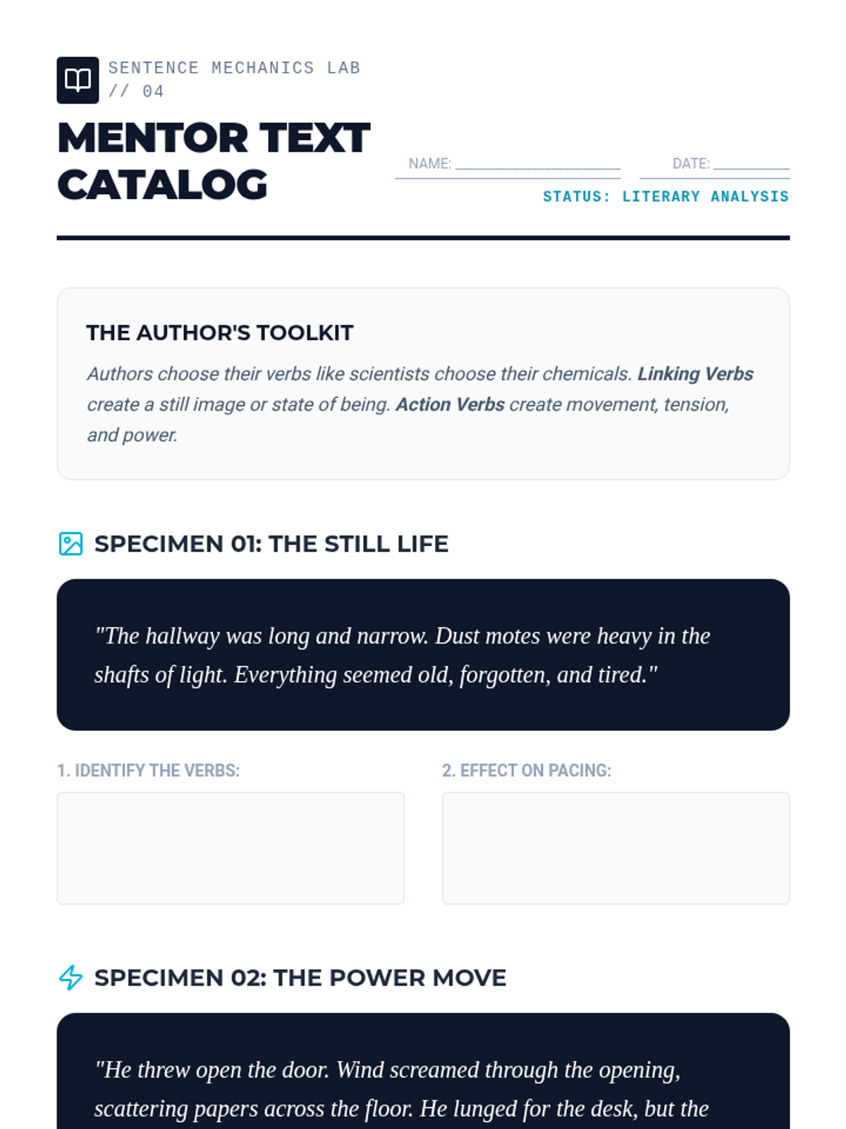 This inquiry-based sequence guides 8th-grade students through the categorization of verbs, moving beyond simple identification to understanding function. Students explore action, linking, helping, transitive, and intransitive verbs through sentence analysis, mentor texts, and creative application.