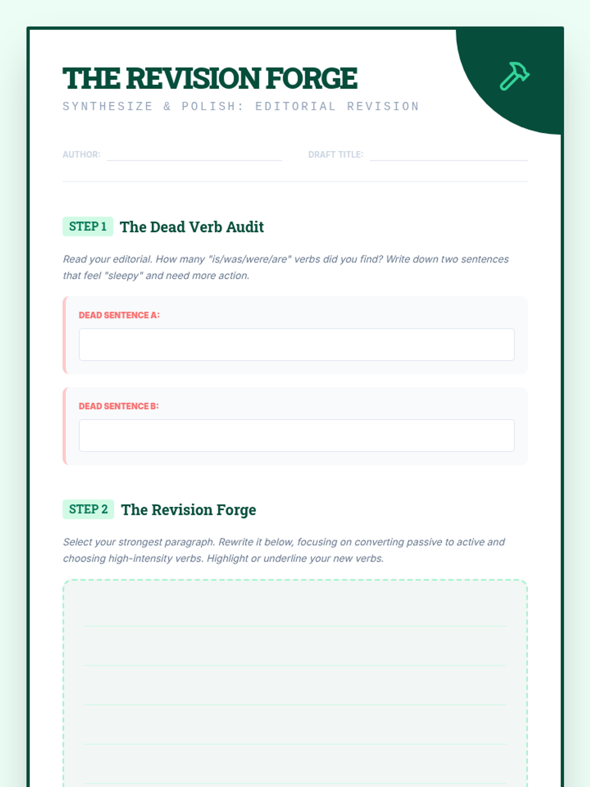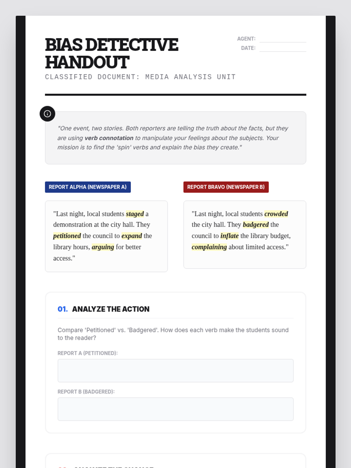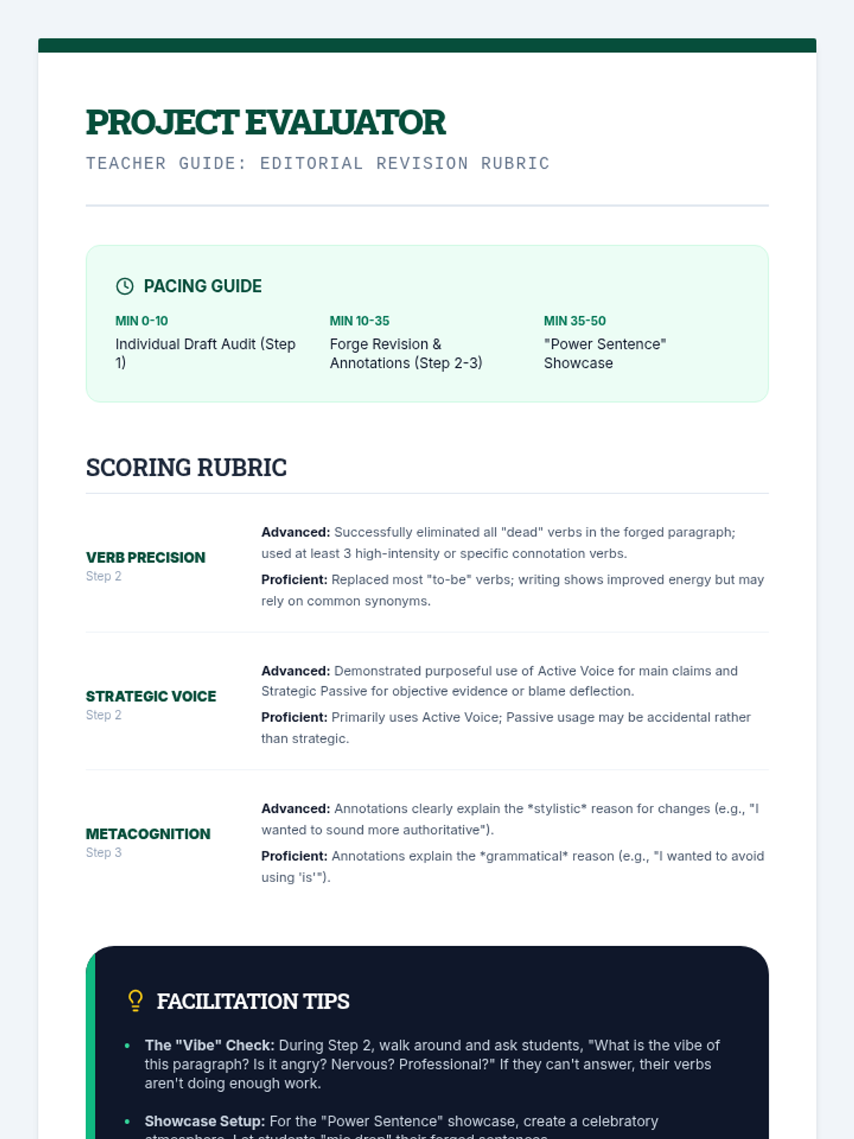 A project-based grammar sequence for 8th graders focusing on verb precision, active/passive voice, and the impact of verb connotation on tone and persuasion.