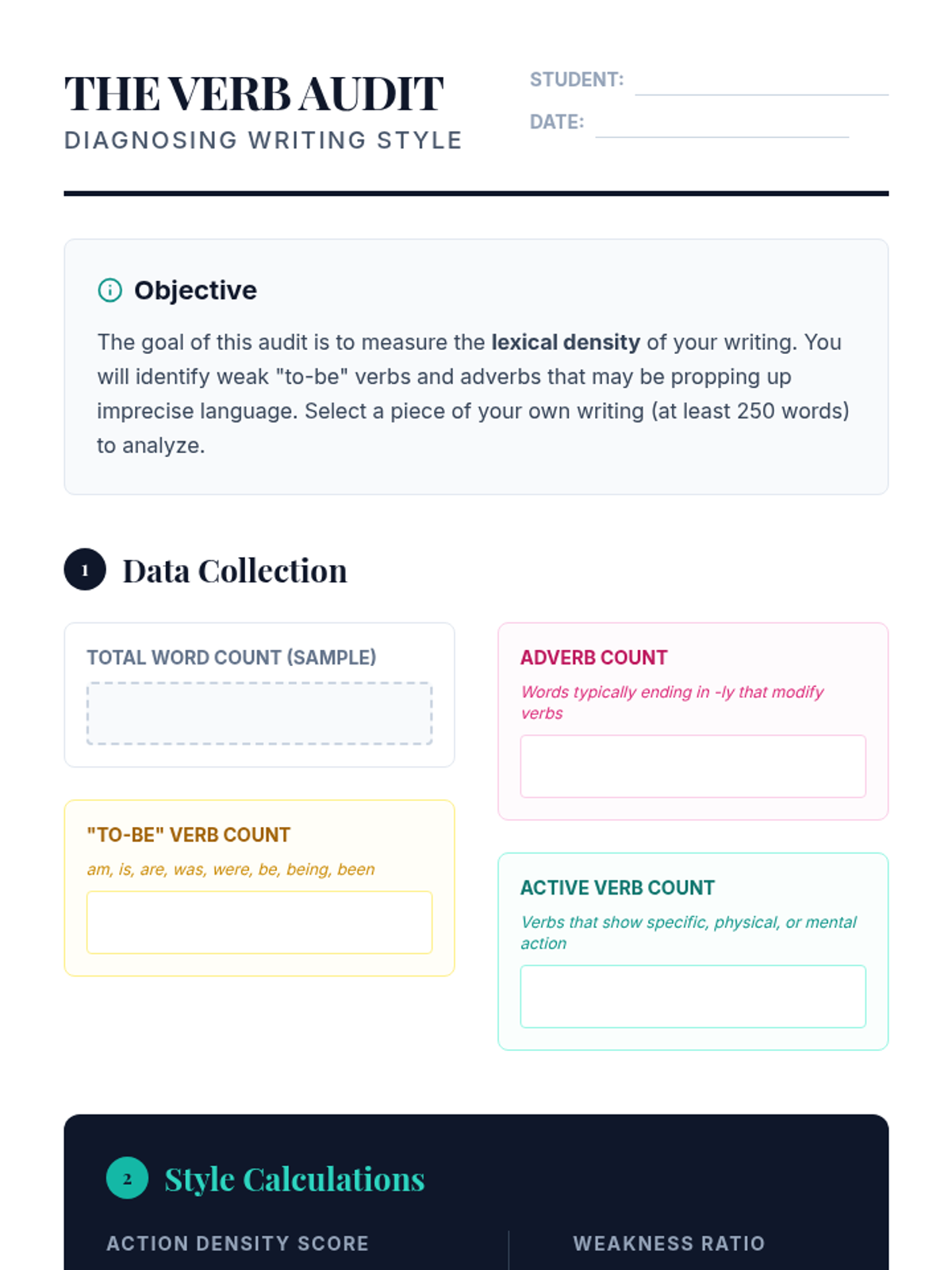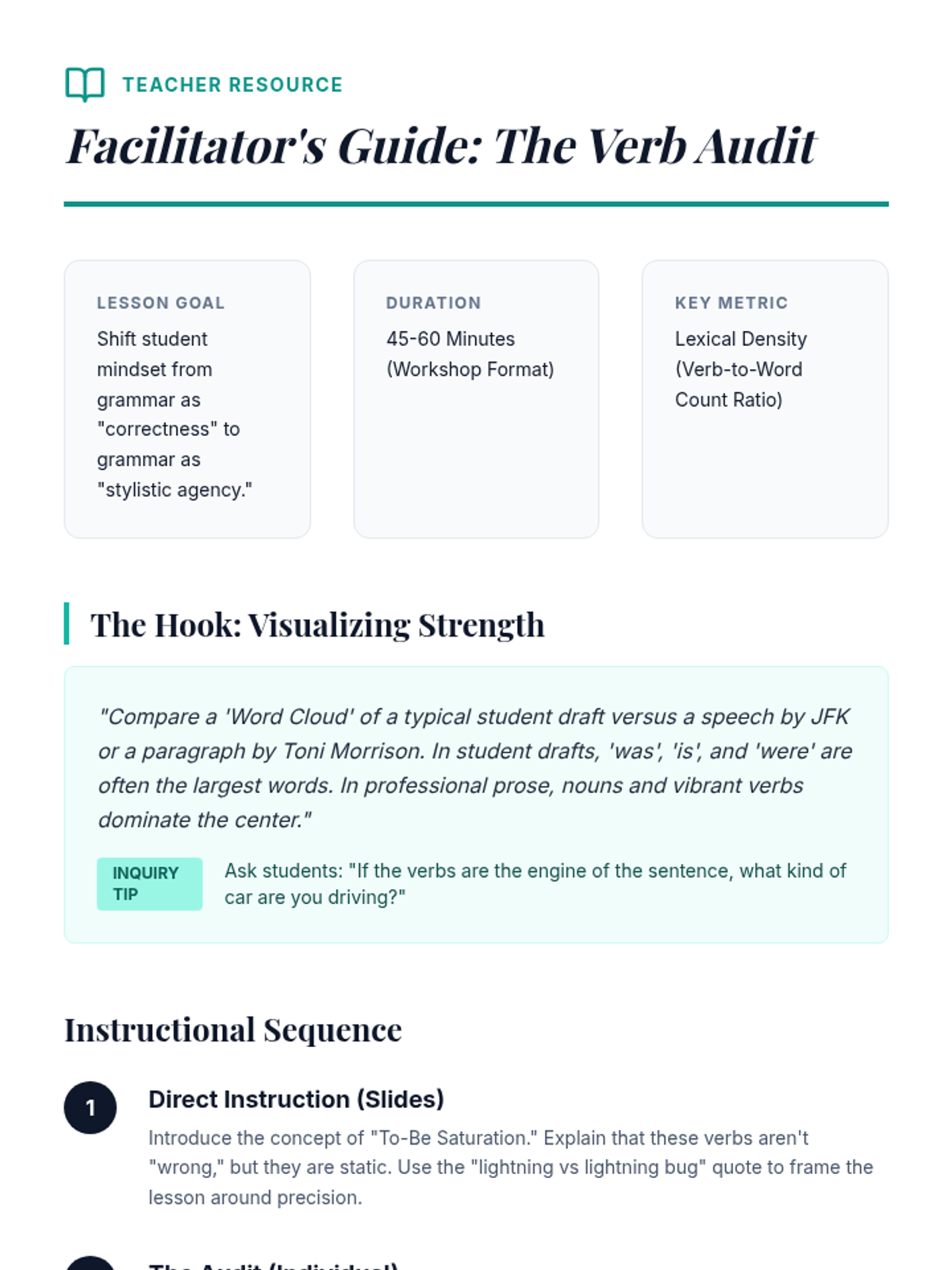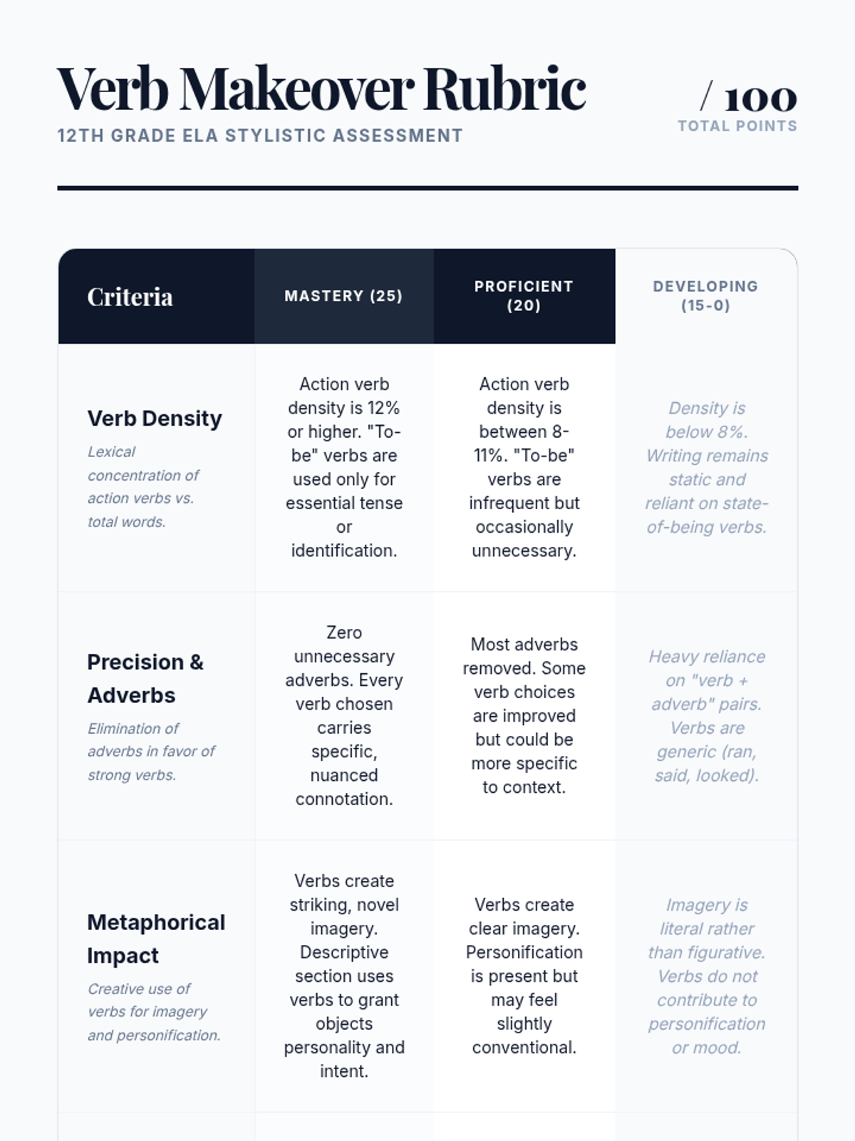 A 12th-grade ELA sequence focused on the stylistic power of verbs. Students move from auditing their own writing for weak verbs to mastering the use of precise, metaphorical, and academic verbs to enhance clarity and tone.
