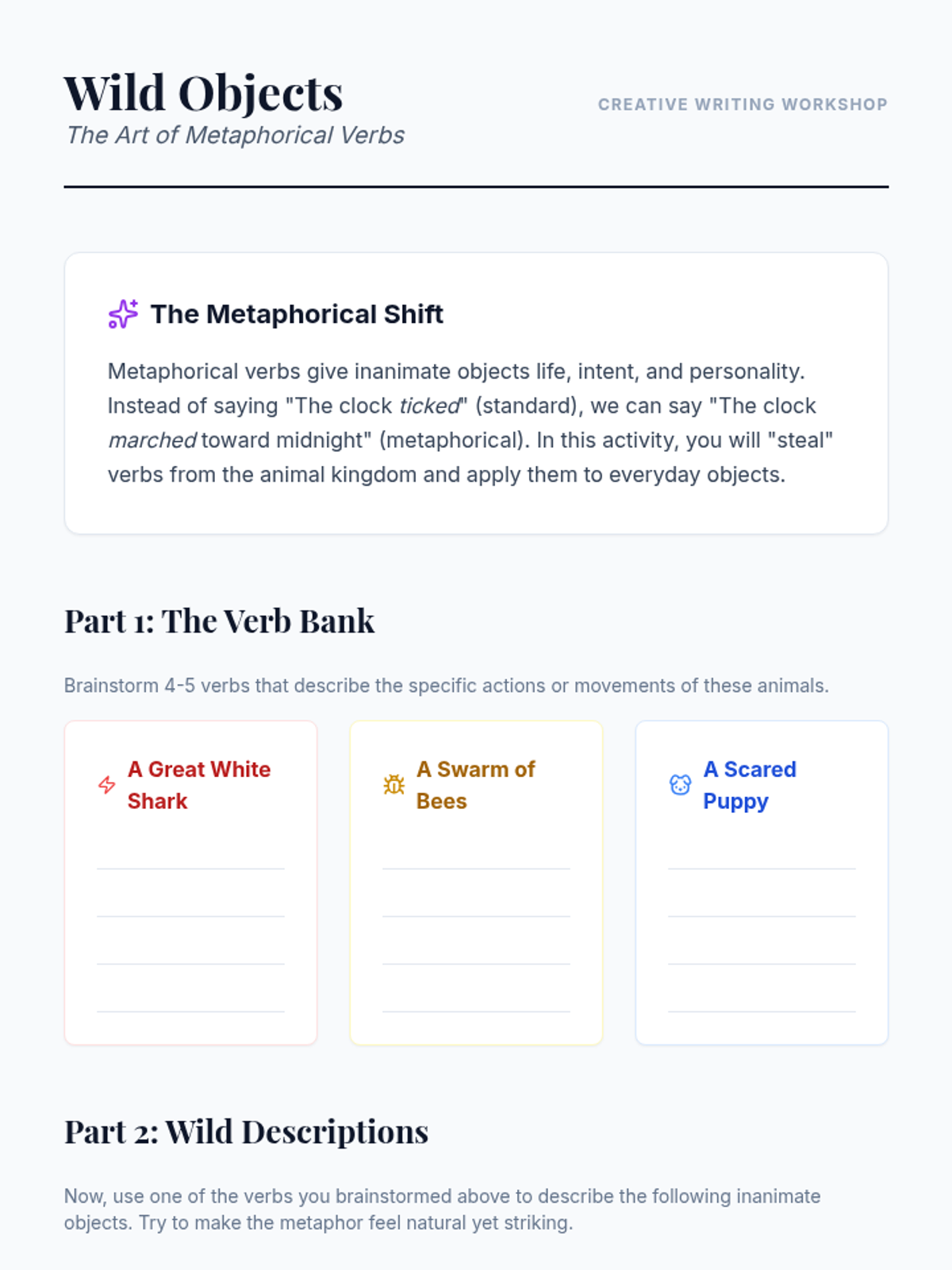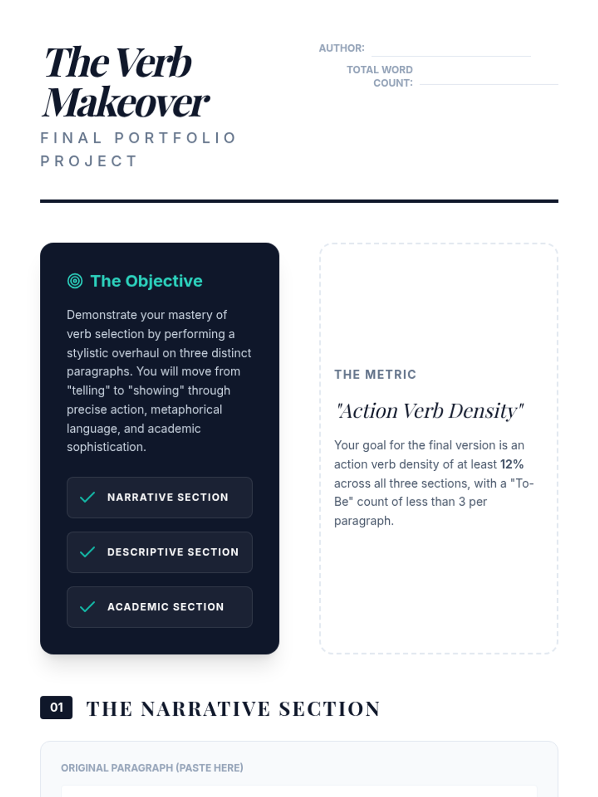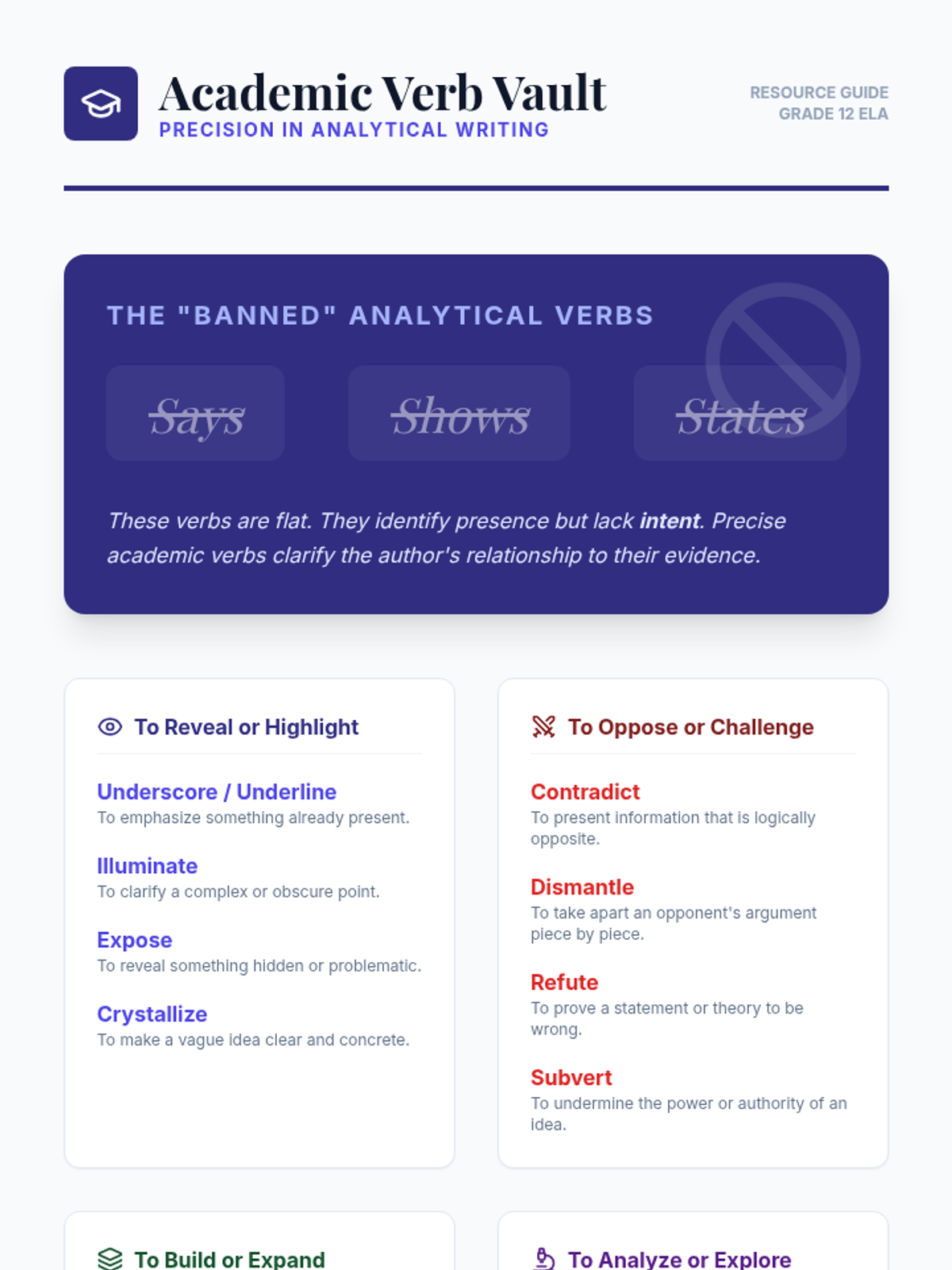 A 12th-grade ELA sequence focused on the stylistic power of verbs. Students move from auditing their own writing for weak verbs to mastering the use of precise, metaphorical, and academic verbs to enhance clarity and tone.