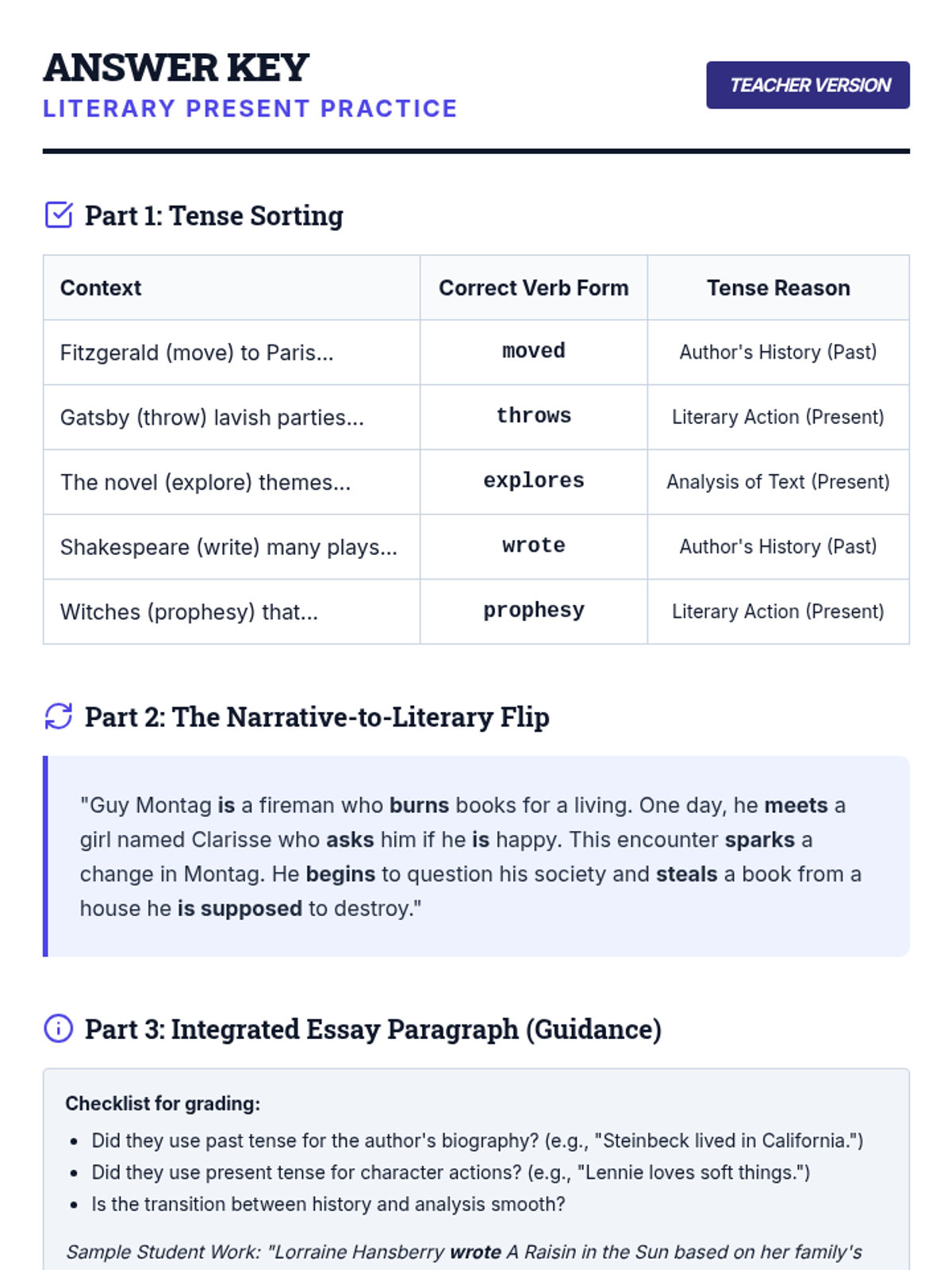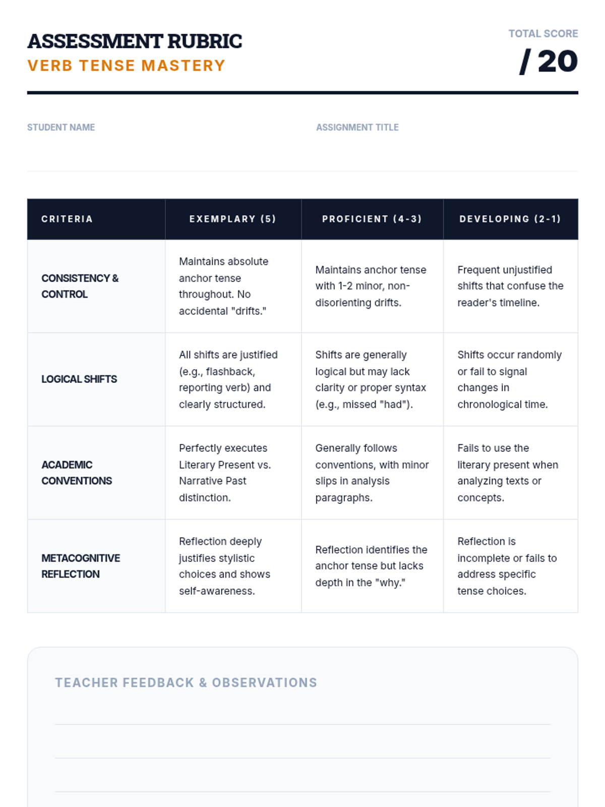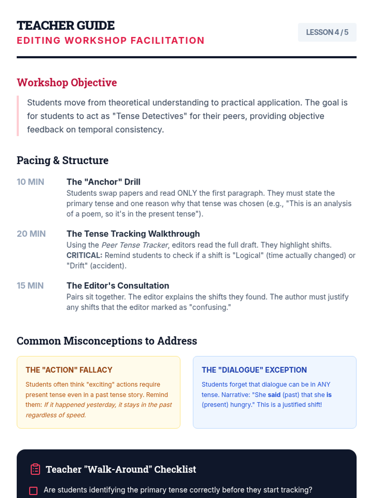 A 10th-grade English Language Arts sequence focused on the mastery of verb tense consistency. Students will learn to identify unnecessary shifts, understand academic conventions like the literary present, and apply logical time shifts in complex writing.
