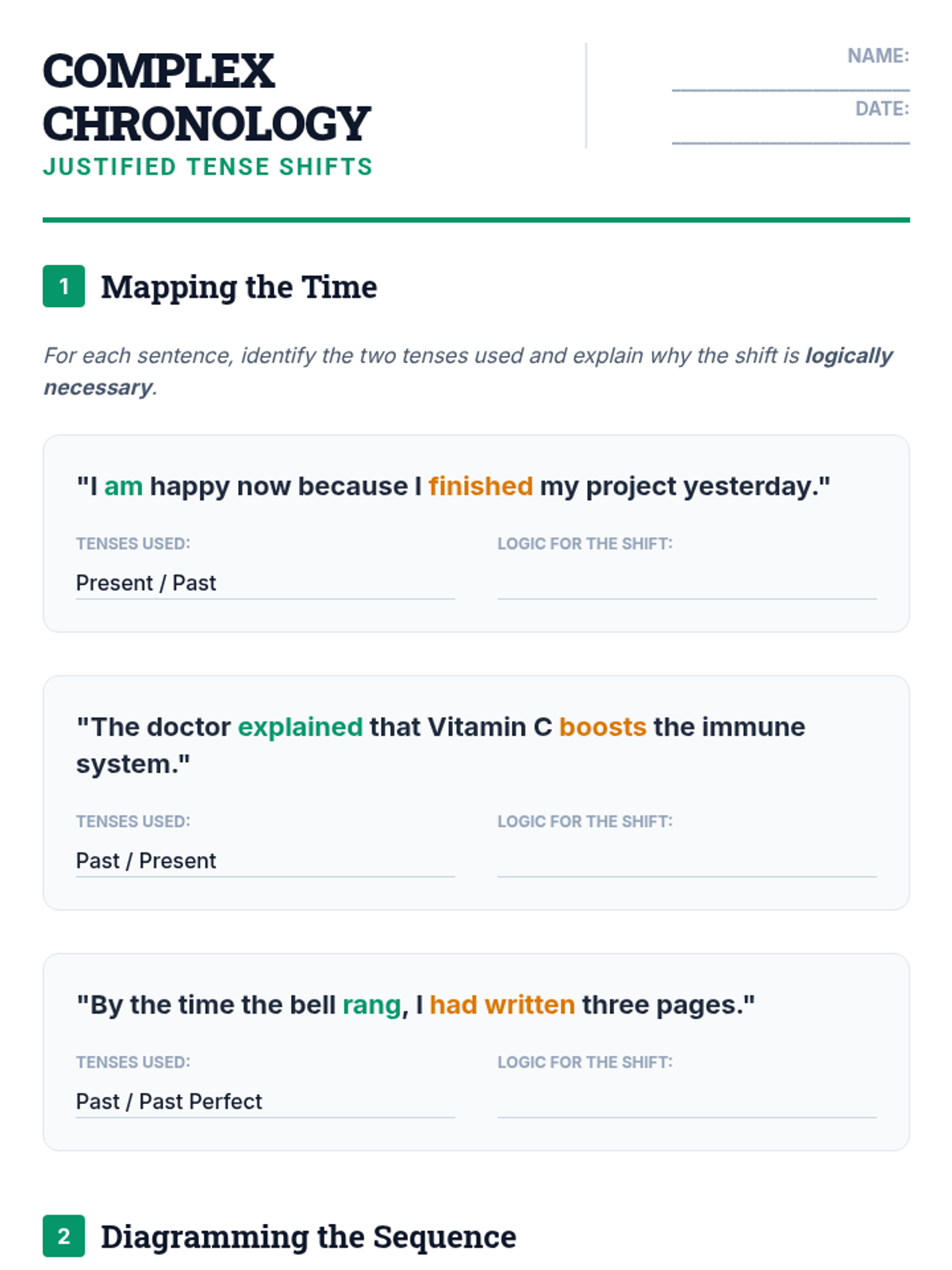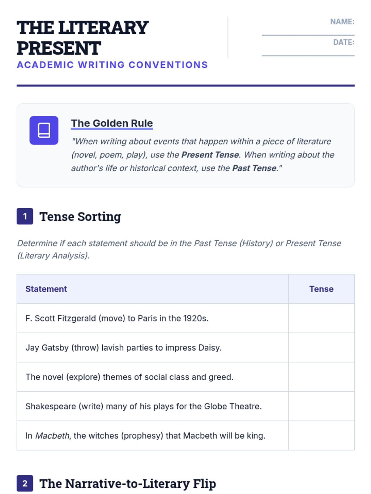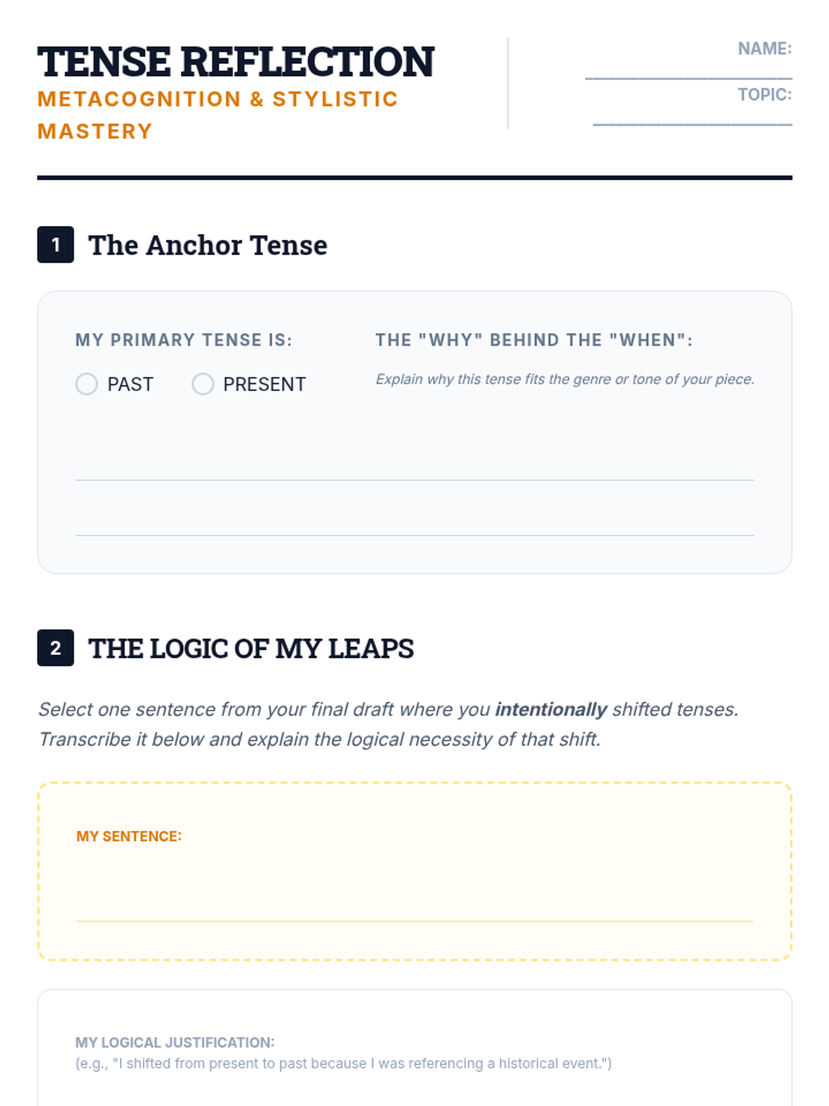 A 10th-grade English Language Arts sequence focused on the mastery of verb tense consistency. Students will learn to identify unnecessary shifts, understand academic conventions like the literary present, and apply logical time shifts in complex writing.