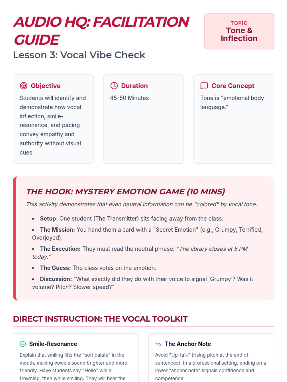 A 5-day communication and emotional intelligence unit for 8th graders. Using the metaphor of radio signals, students learn to identify emotional "static," regulate their "frequency," and broadcast "clear signals" in collaborative environments.