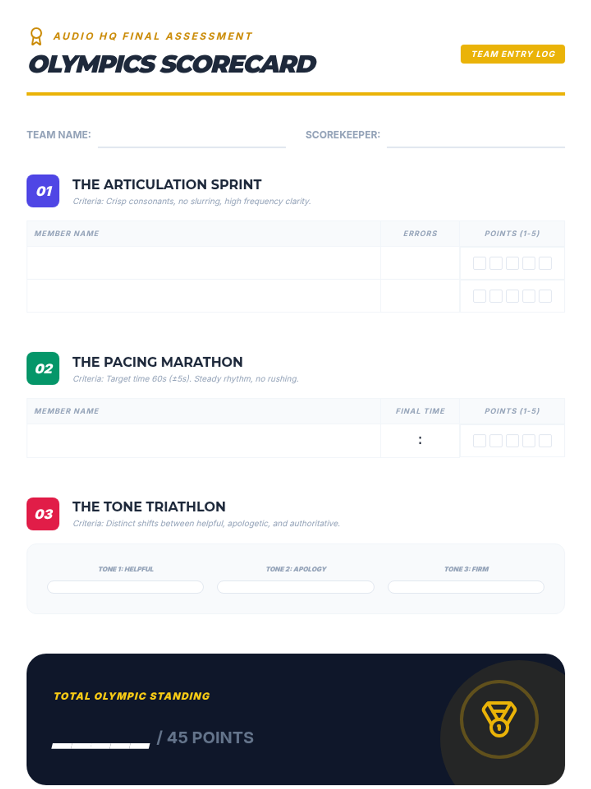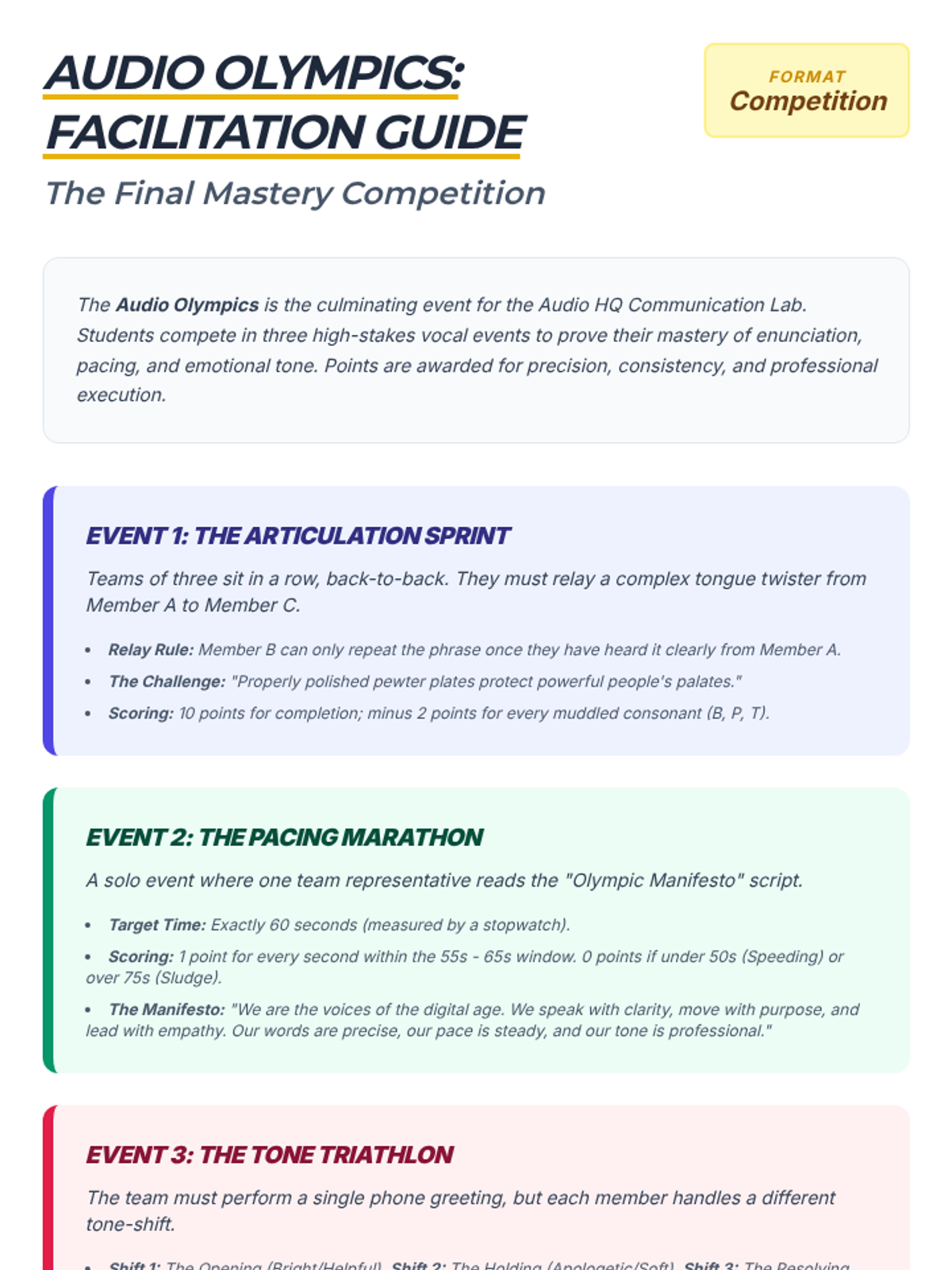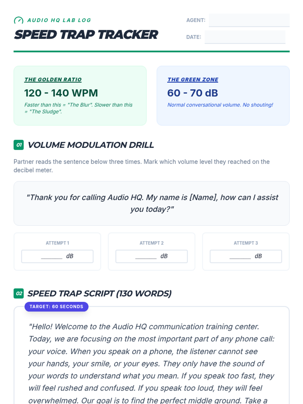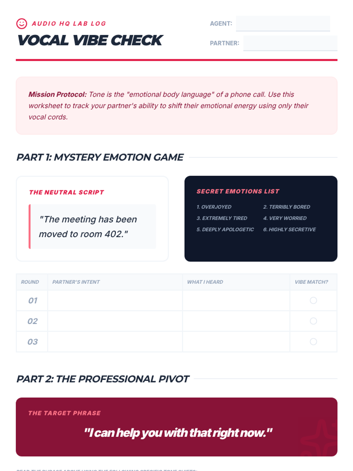 A game-based sequence focusing on the vocal mechanics of phone communication, including enunciation, pacing, volume, and emotional tone. Students build professional audio communication skills through interactive drills and simulations.