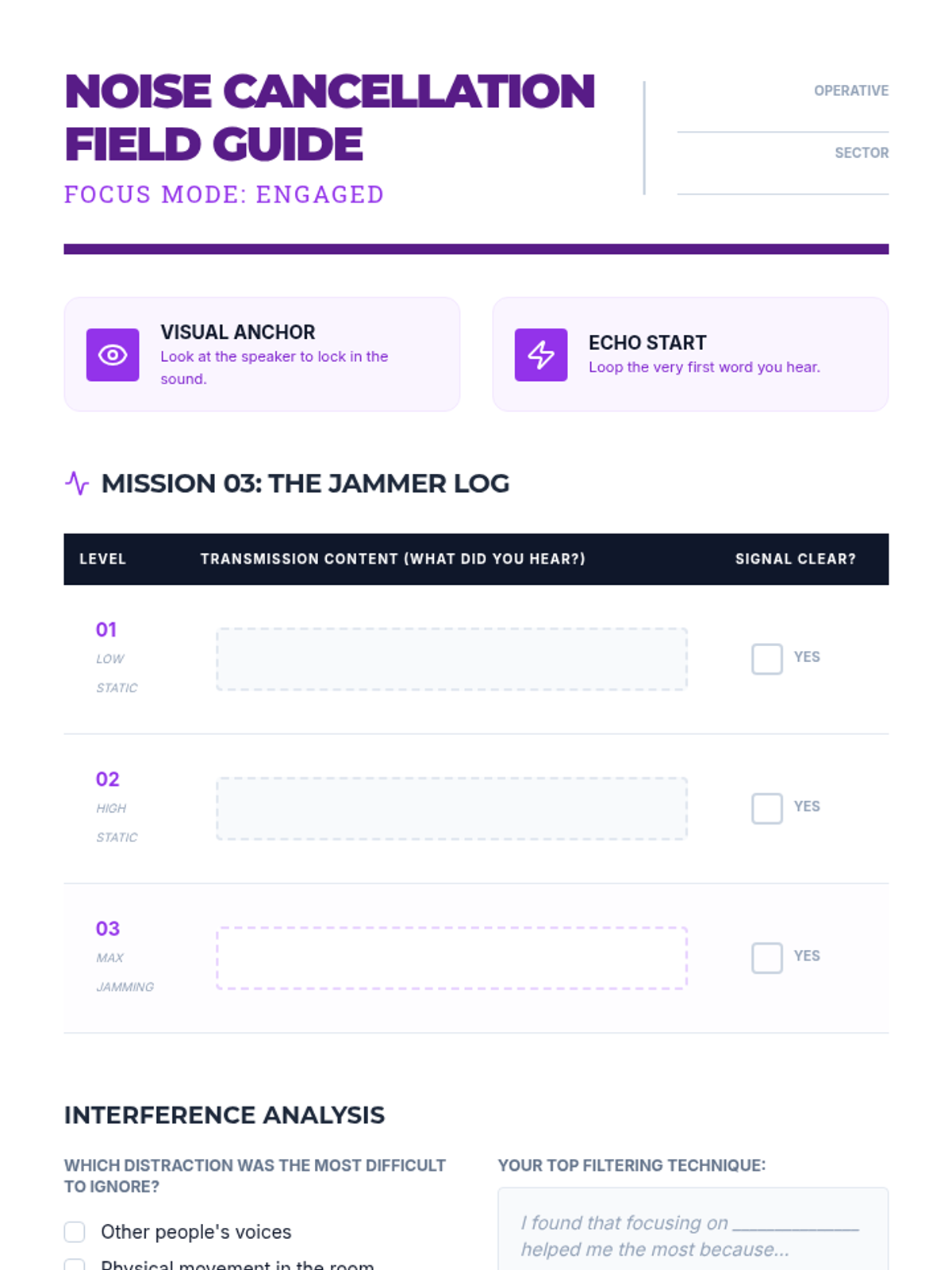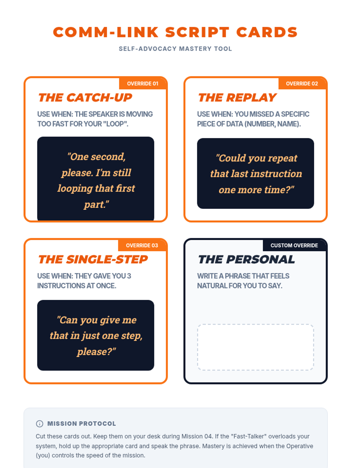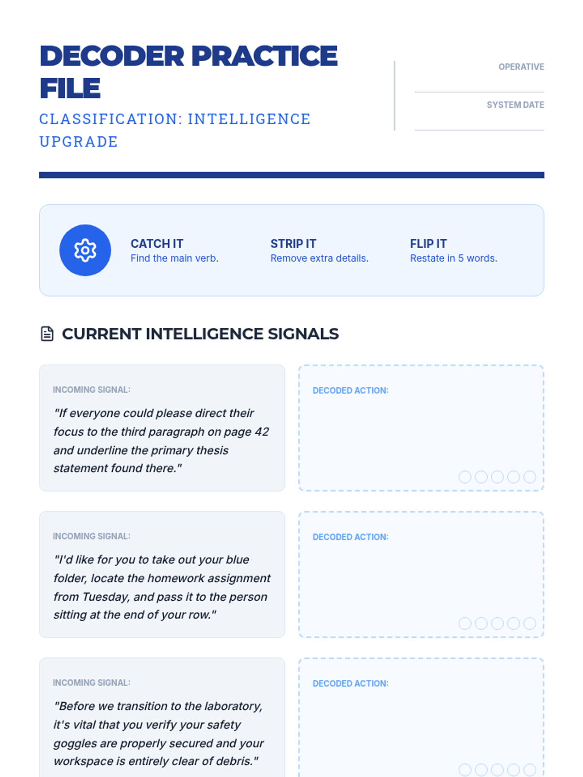 A specialized sequence for 10th-grade students focusing on auditory working memory. Through five gamified lessons, students master verbal rehearsal, paraphrasing, and self-advocacy techniques to improve their ability to focus on and execute single-step oral directions.