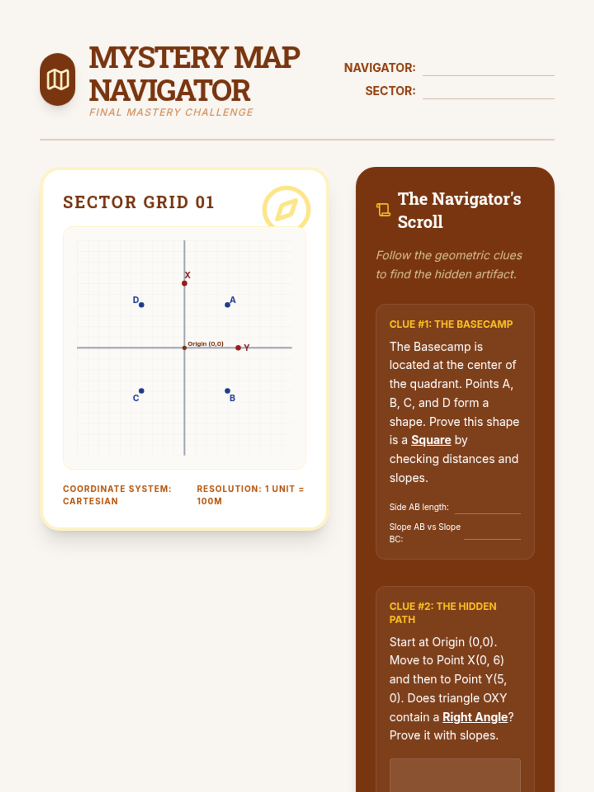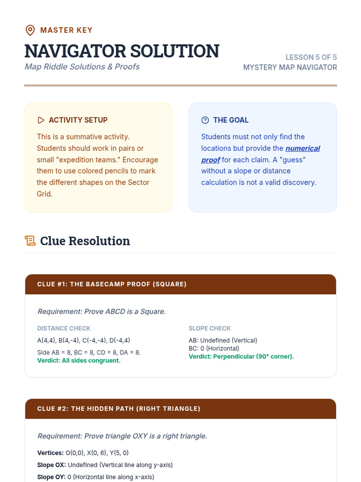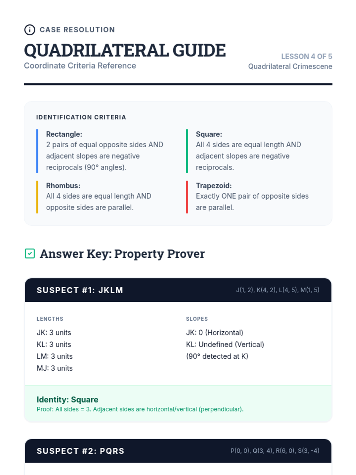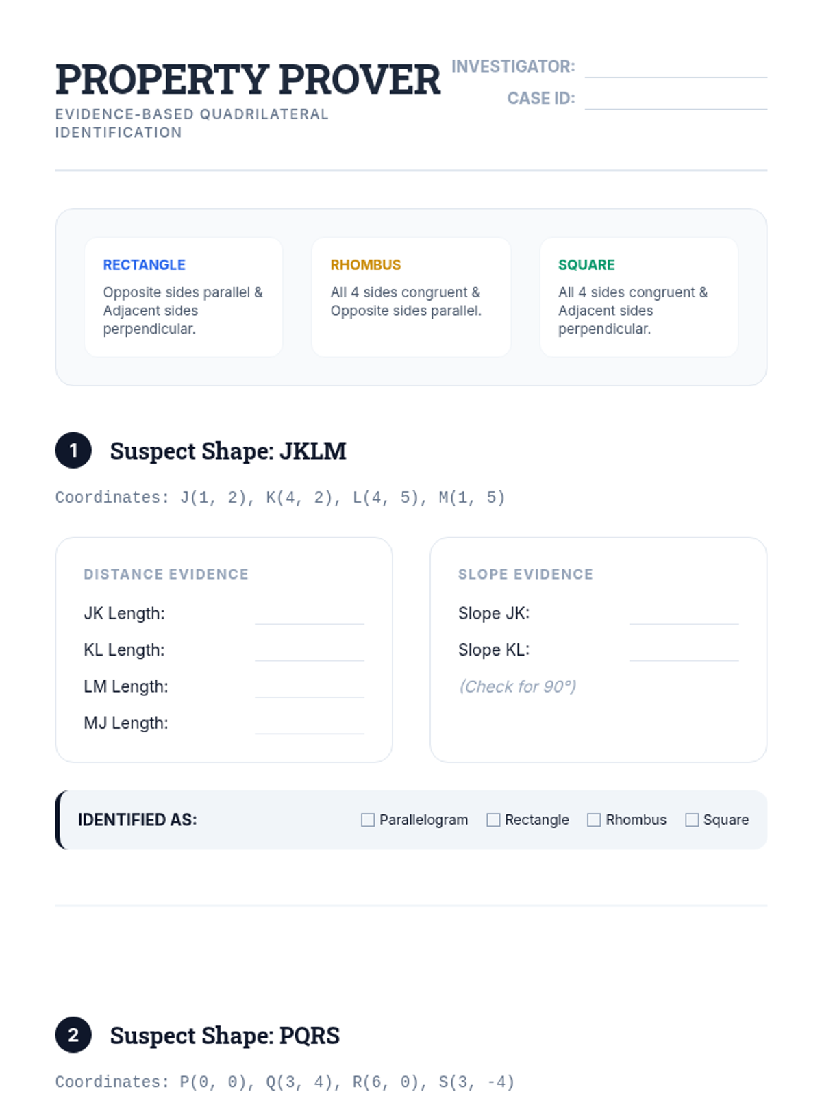 This sequence integrates algebra and geometry by using the coordinate plane to verify shape attributes. Students move beyond visual estimation to rigorous verification using the distance formula (Pythagorean Theorem) and slope.