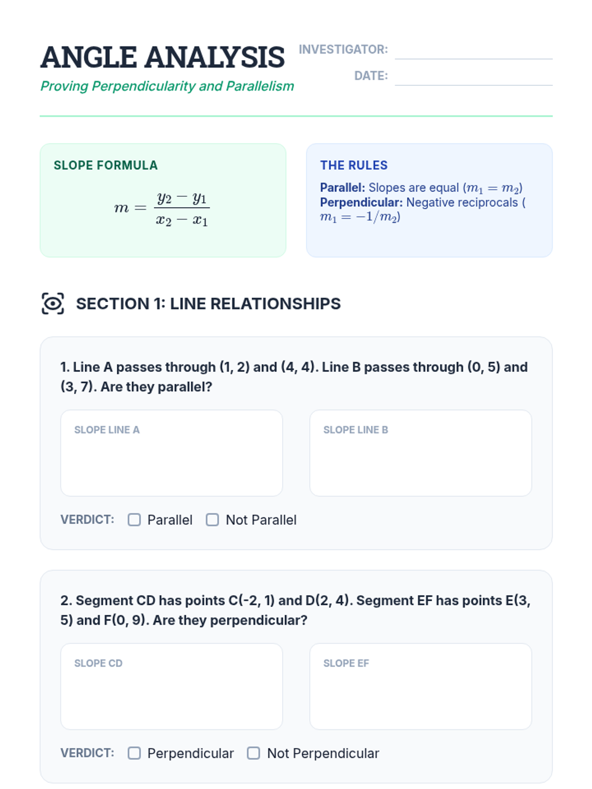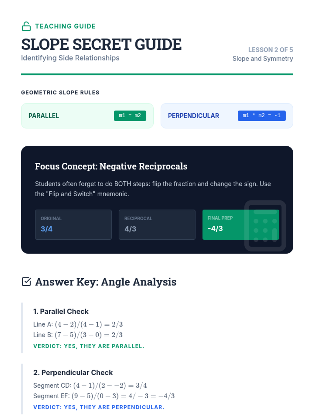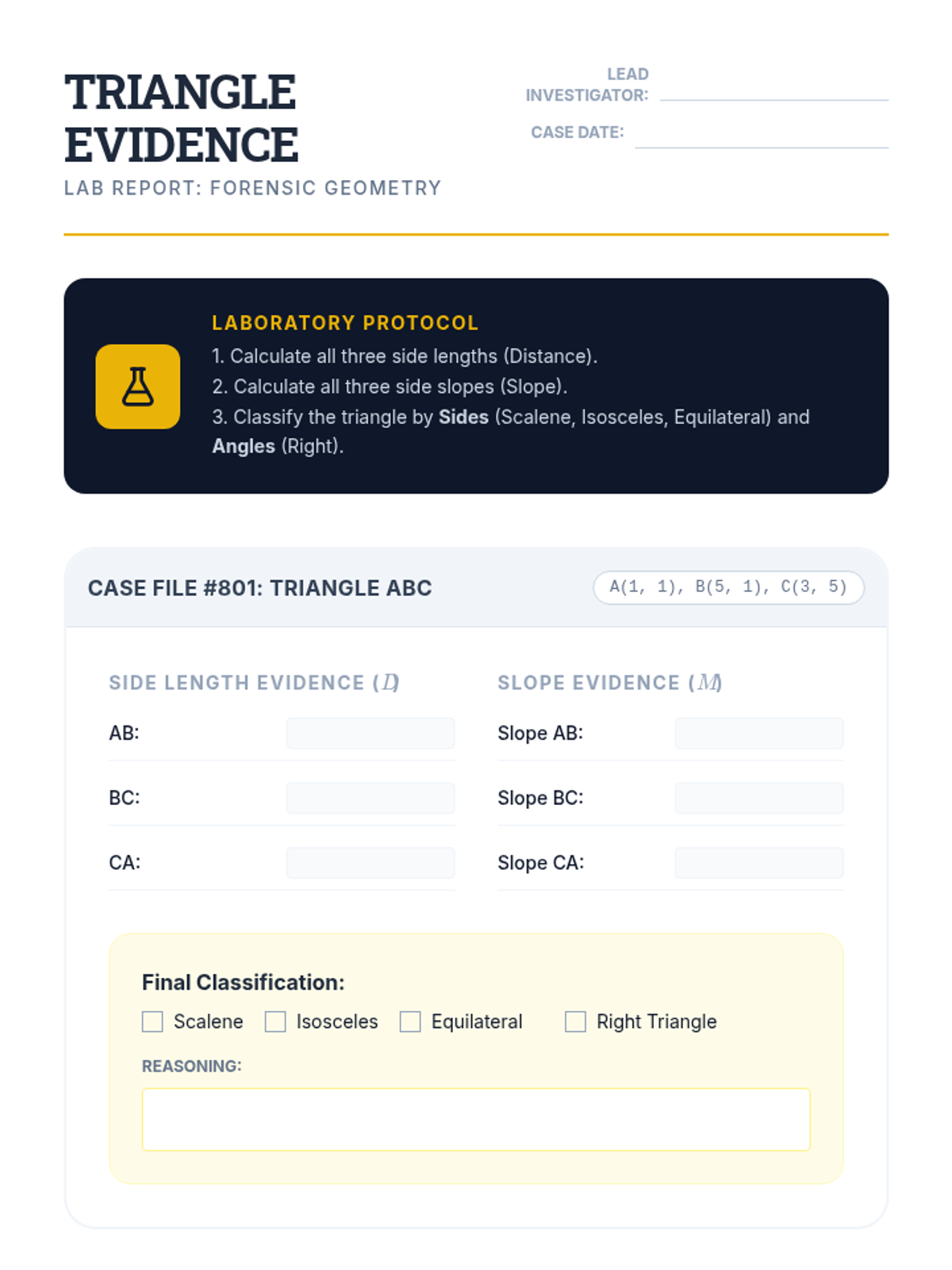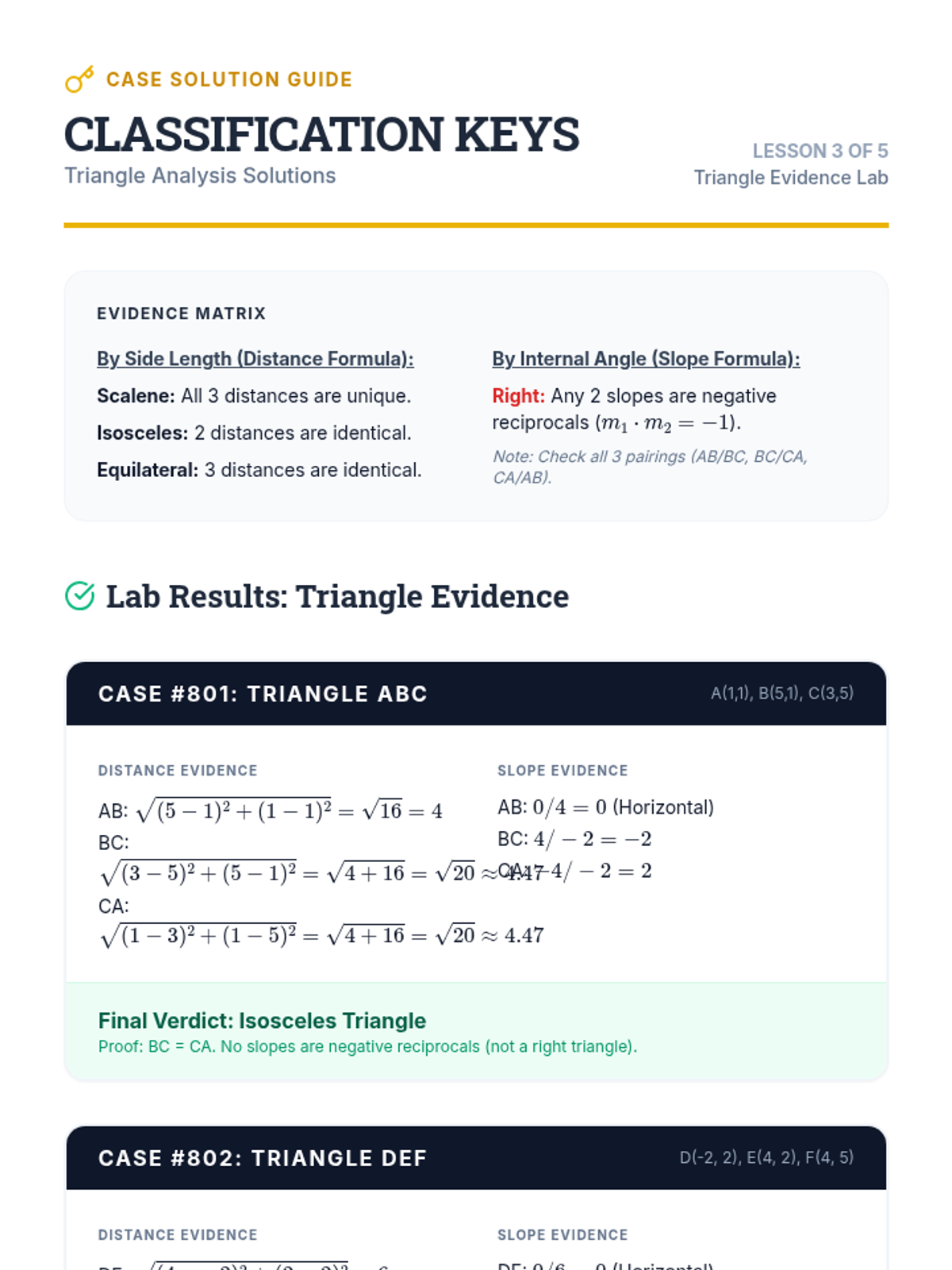 This sequence integrates algebra and geometry by using the coordinate plane to verify shape attributes. Students move beyond visual estimation to rigorous verification using the distance formula (Pythagorean Theorem) and slope.