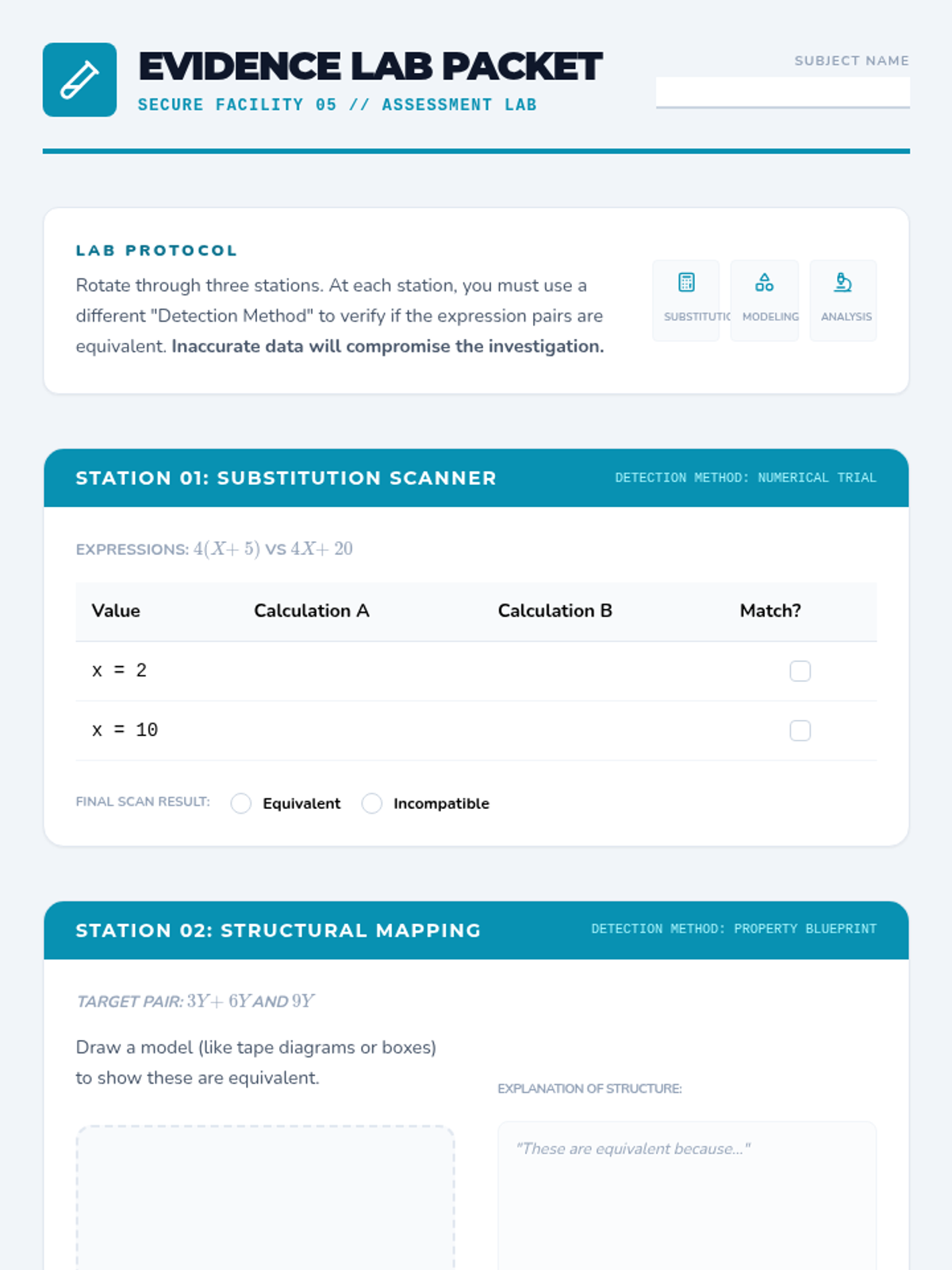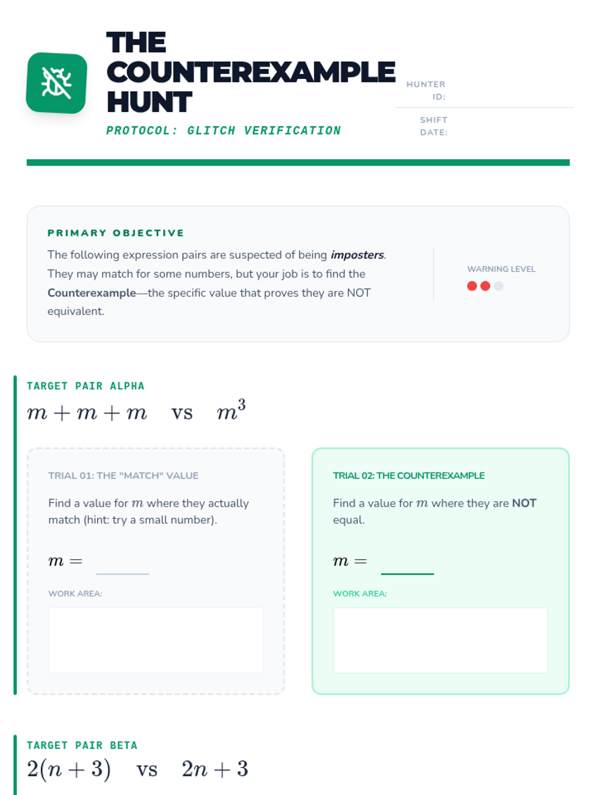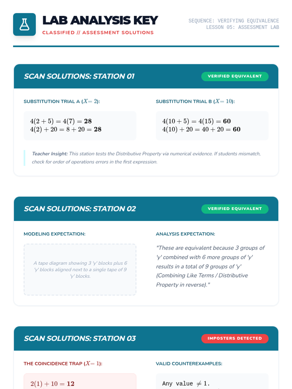 This sequence guides 6th-grade students through the process of verifying algebraic equivalence. Moving beyond rote rules, students use substitution, identify counterexamples, and analyze structural properties to prove whether two expressions are truly identical in value across all possible inputs.