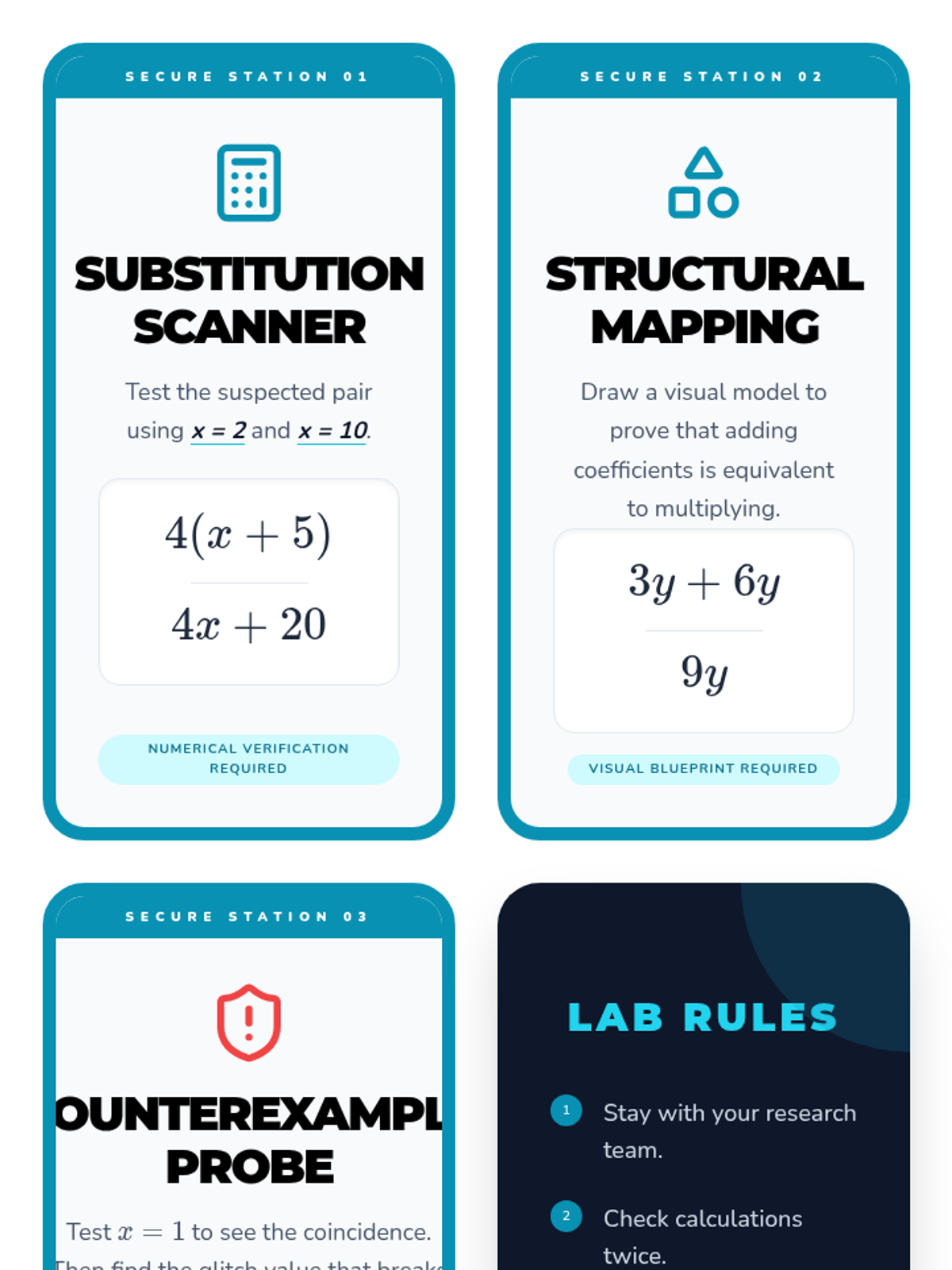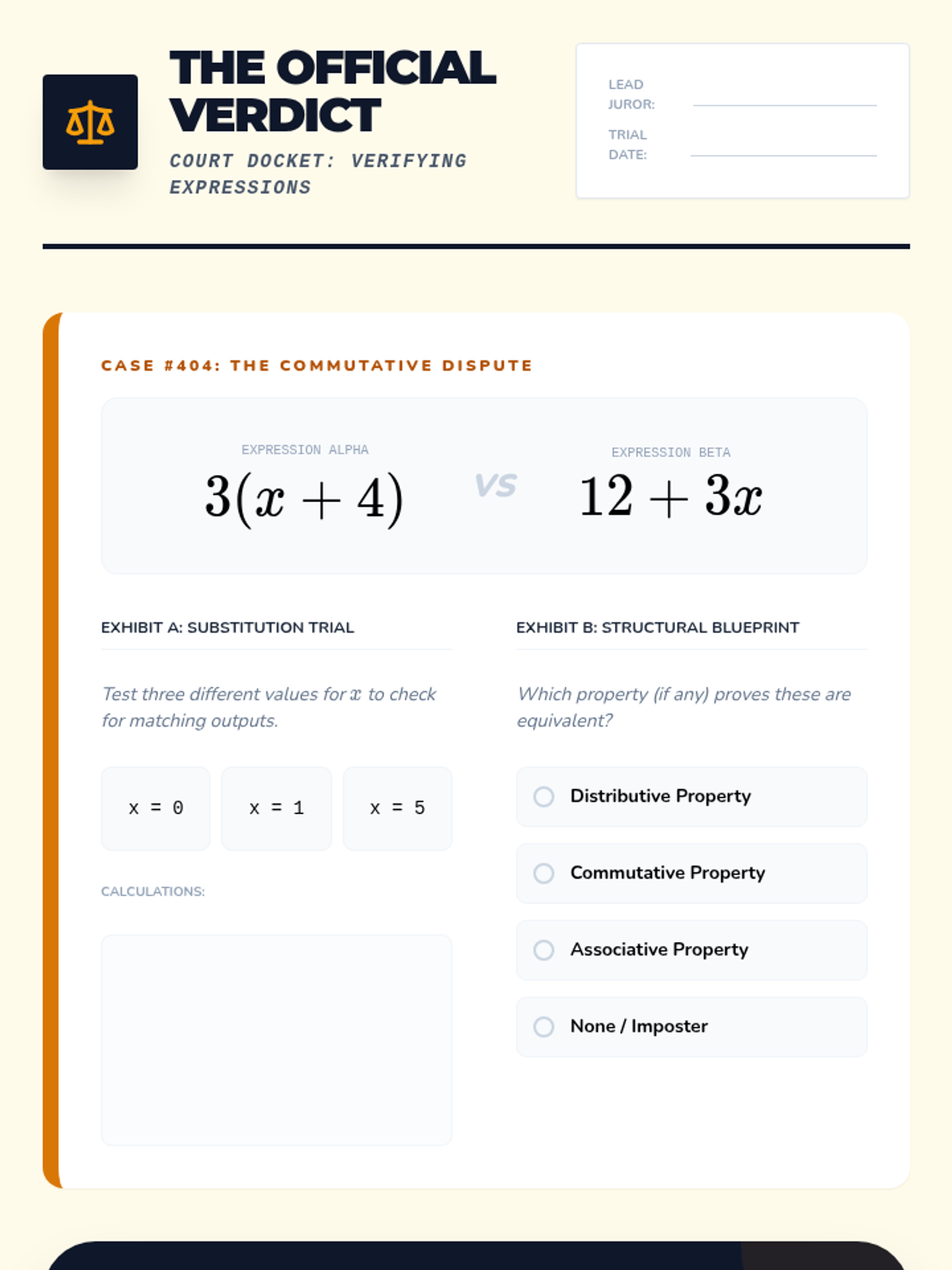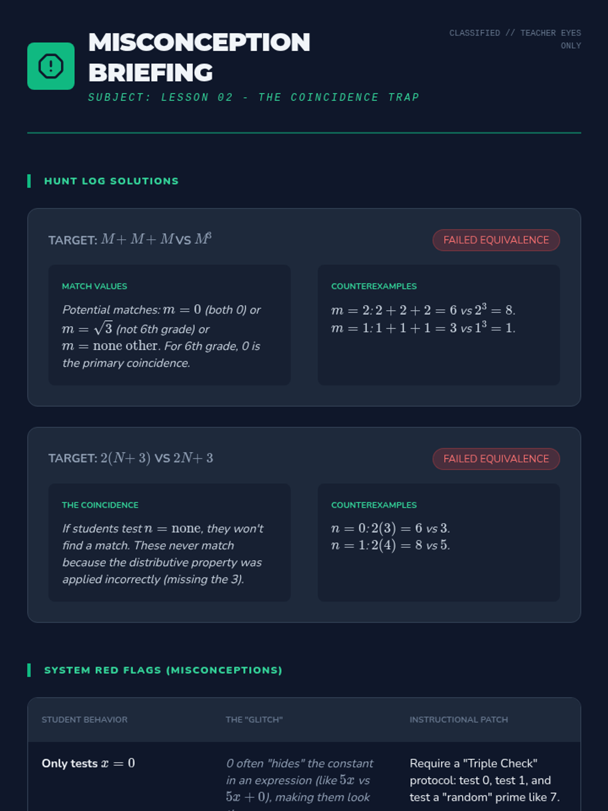 This sequence guides 6th-grade students through the process of verifying algebraic equivalence. Moving beyond rote rules, students use substitution, identify counterexamples, and analyze structural properties to prove whether two expressions are truly identical in value across all possible inputs.