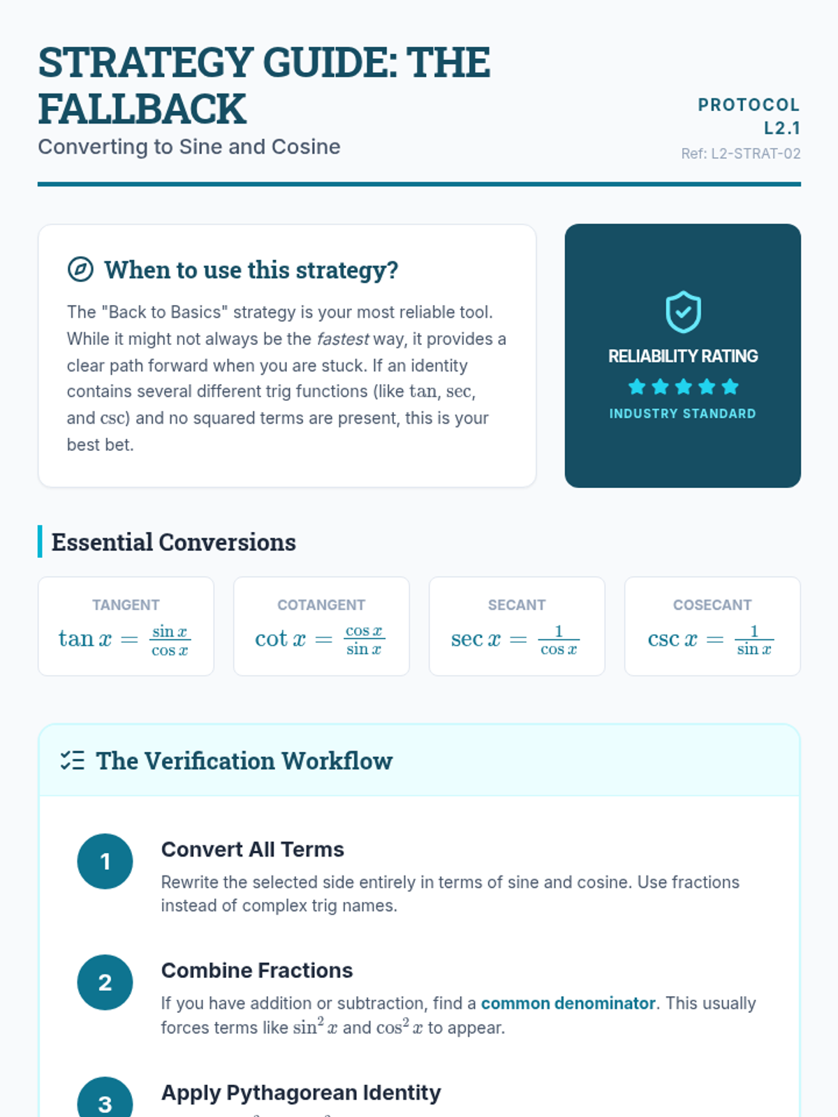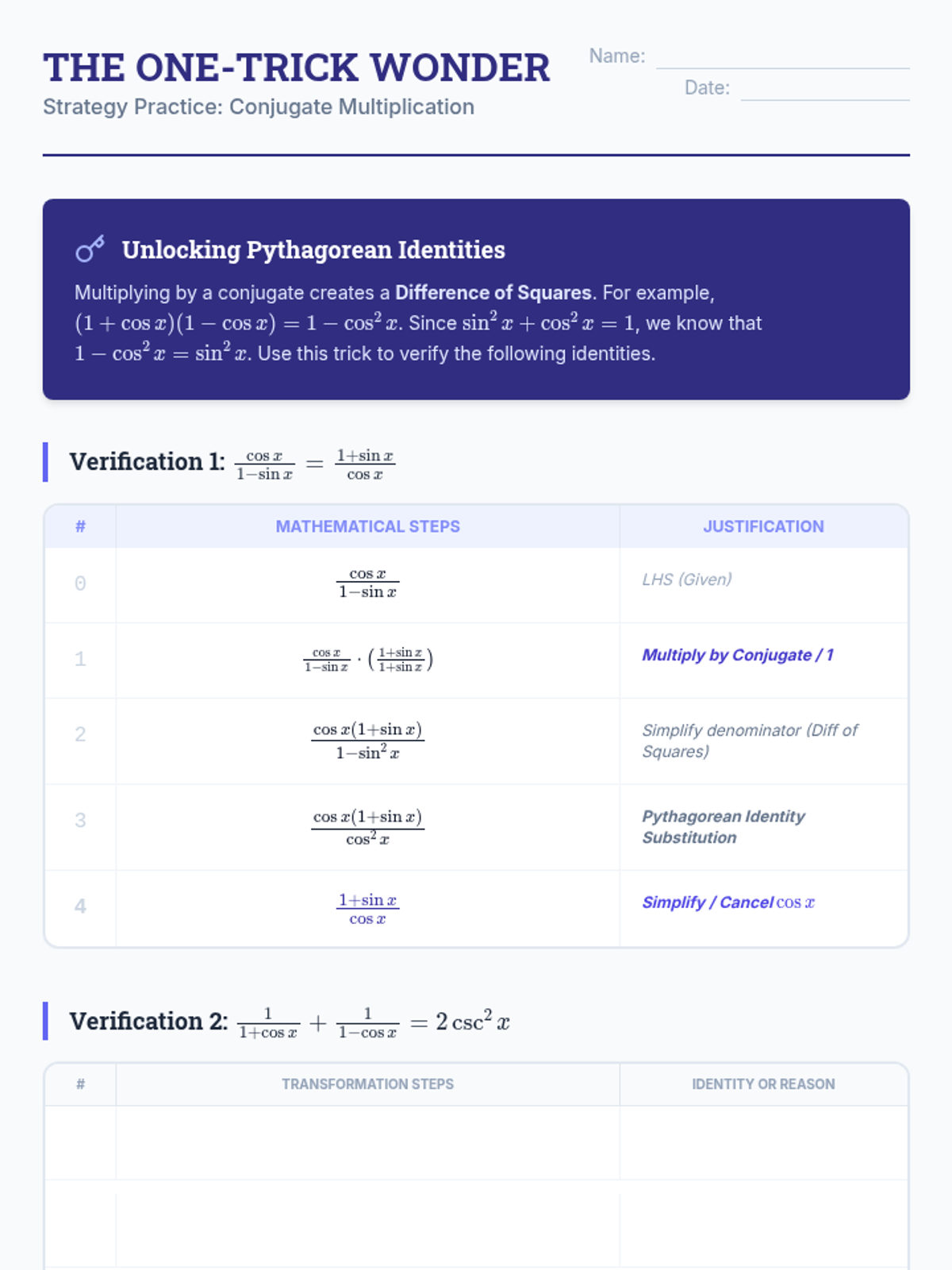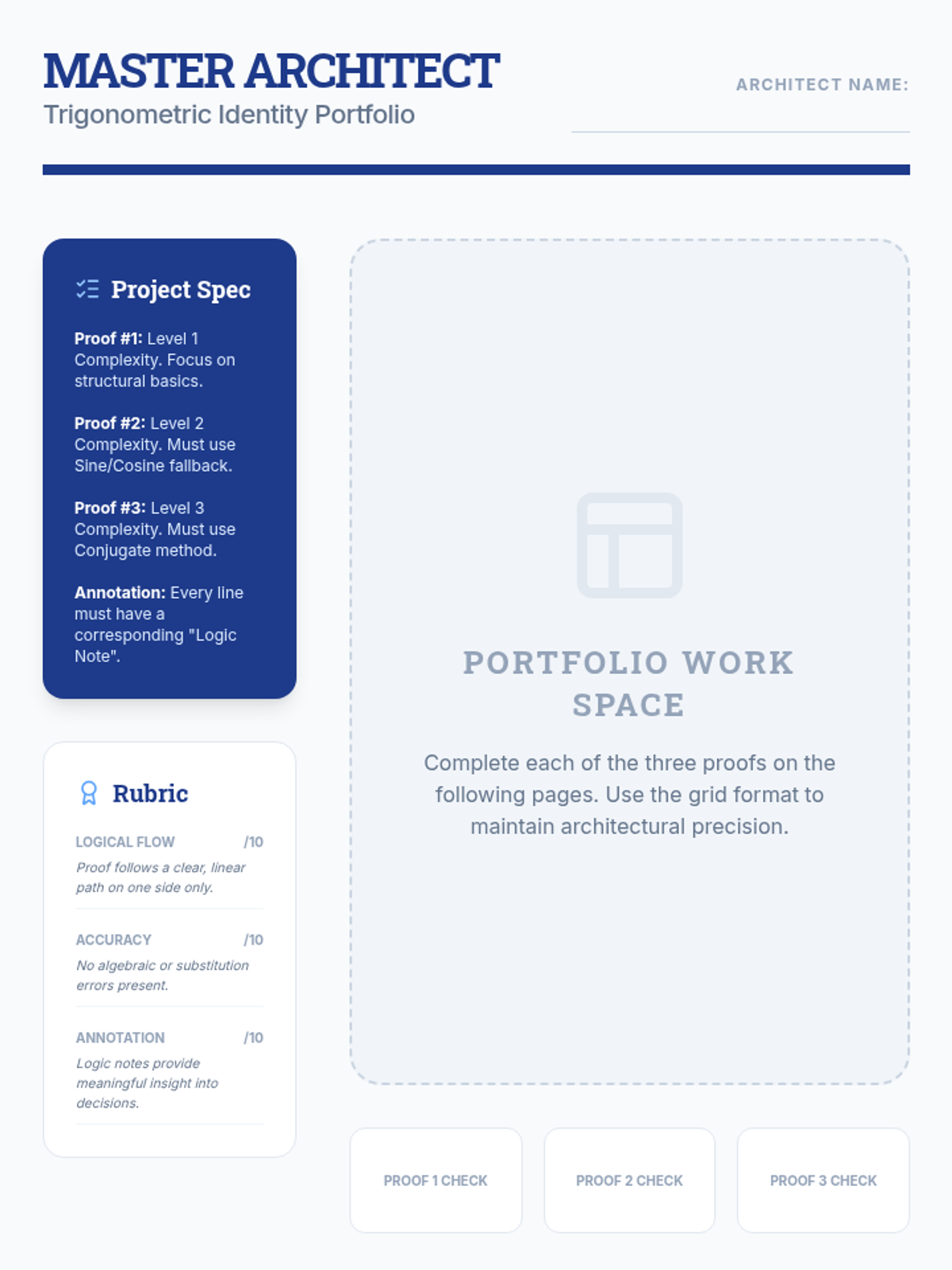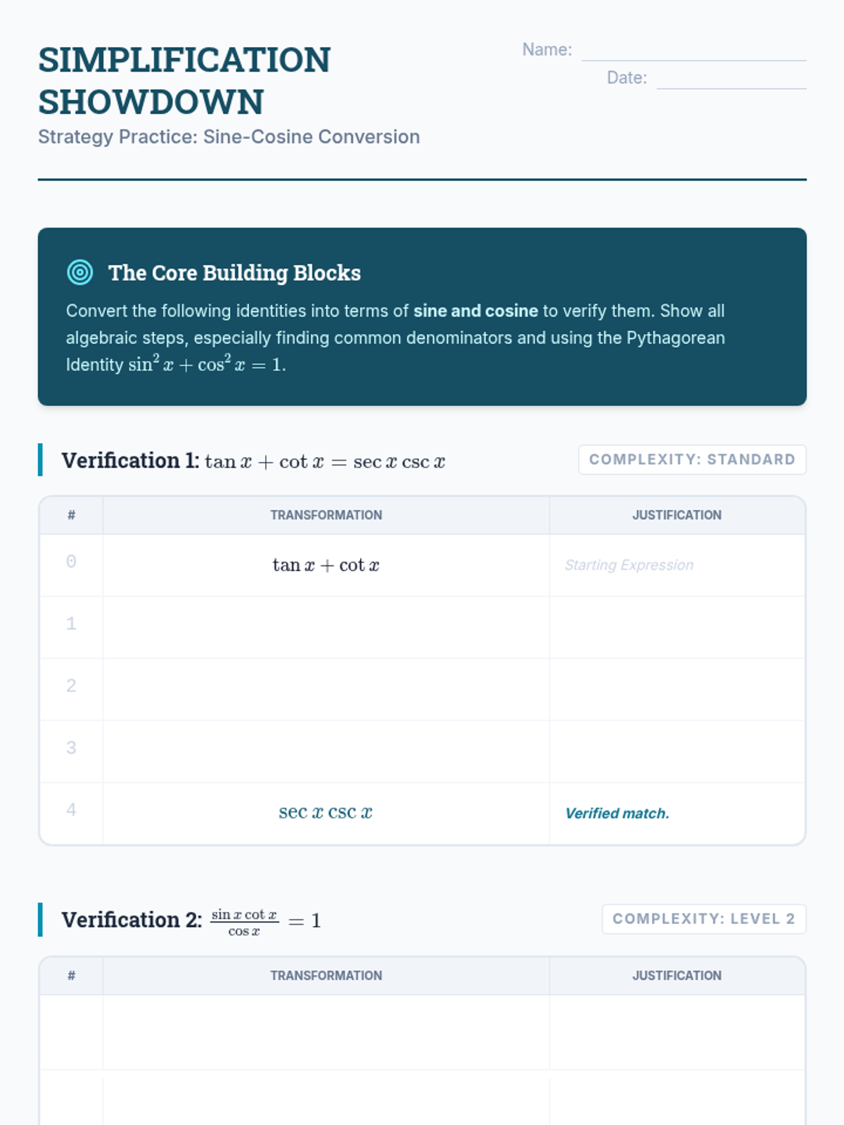 A comprehensive sequence for 10th-grade trigonometry focusing on the logical verification of identities. Students learn to navigate complex trigonometric expressions using specific strategies like sine-cosine conversion and conjugate multiplication, culminating in a formal proof portfolio.