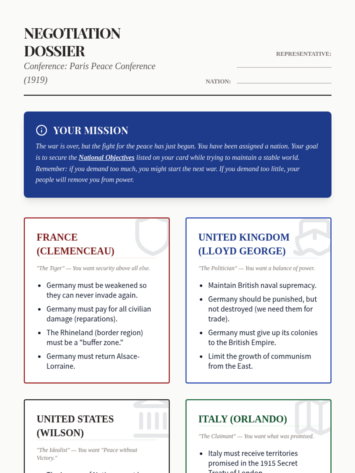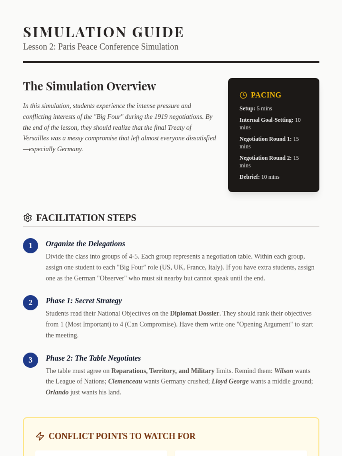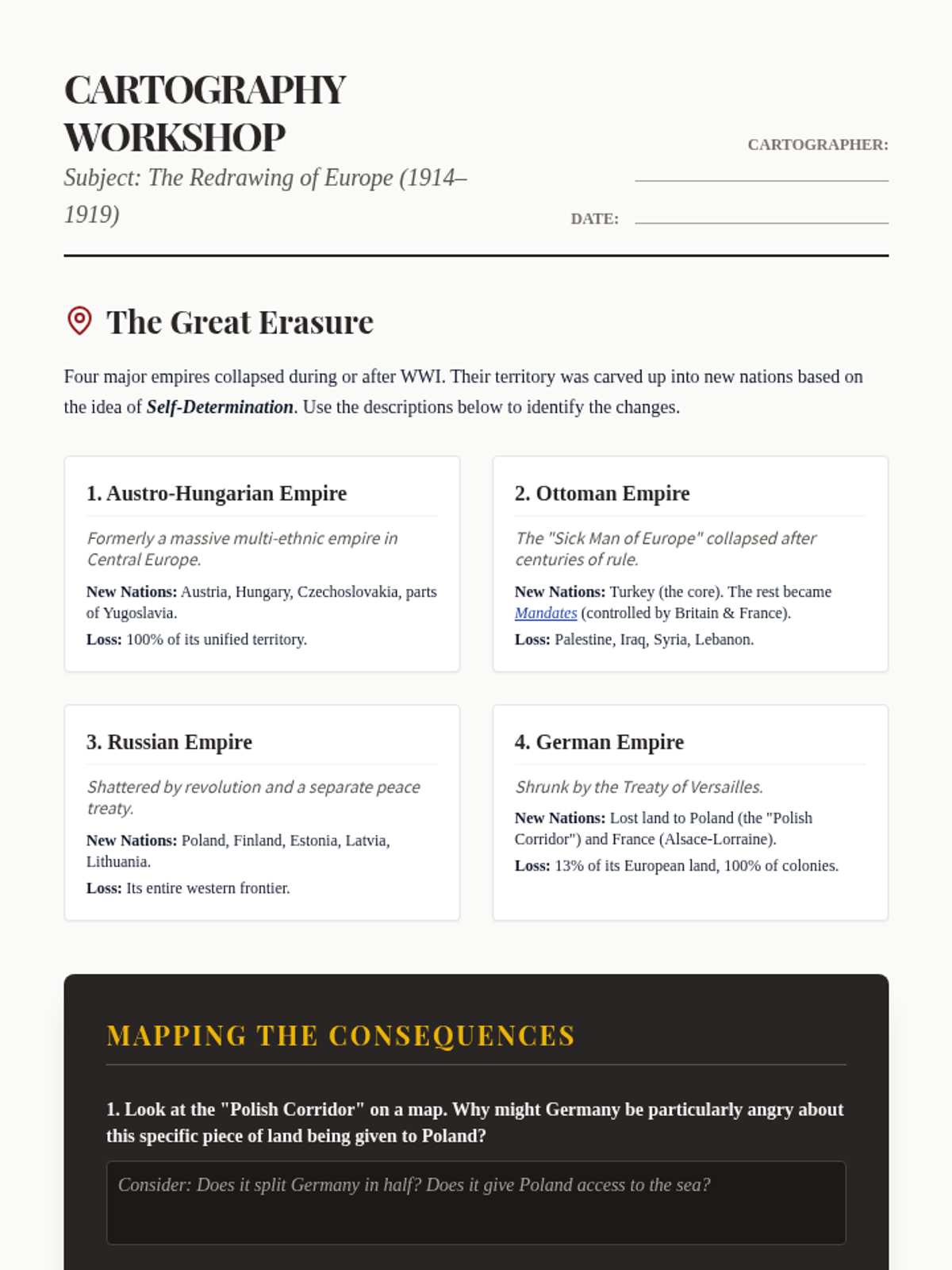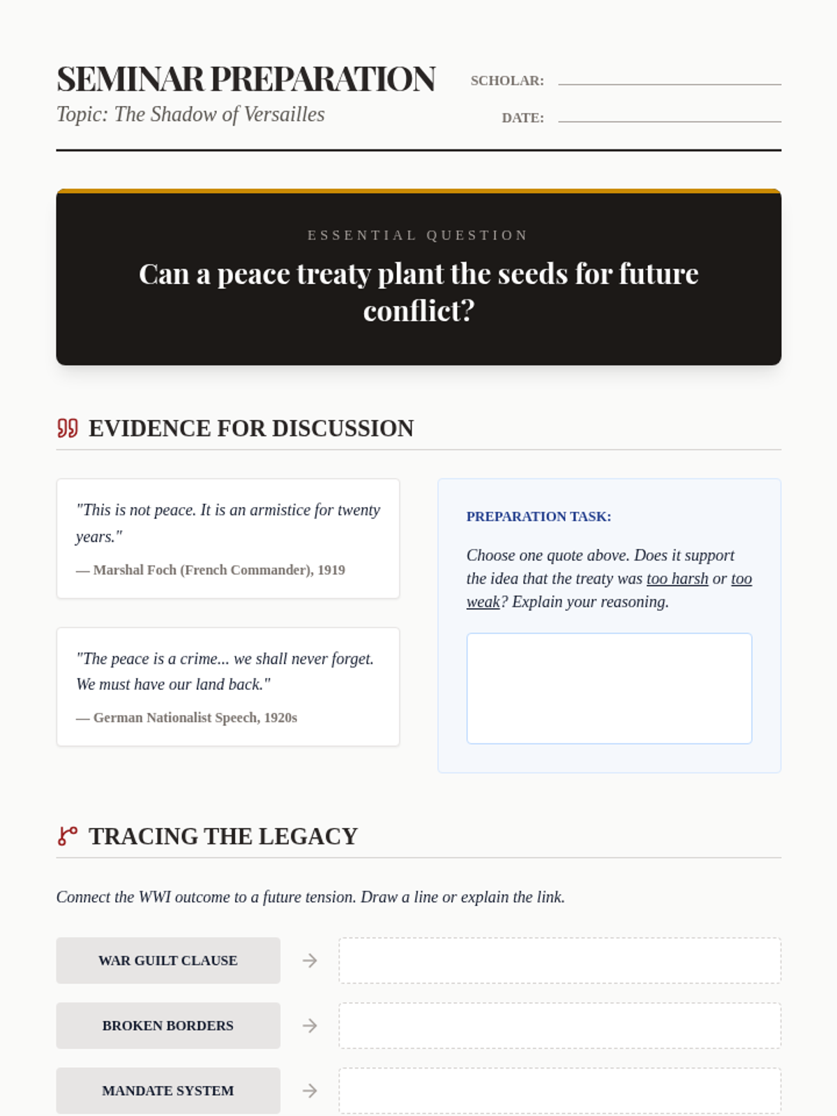 This sequence explores the complex peace process ending World War I, focusing on the Treaty of Versailles, the collapse of empires, and how the resulting geopolitical changes set the stage for future conflict. Students engage in simulations, map analysis, and primary source critique to understand the 'Big Four' interests and the treaty's long-term legacy.