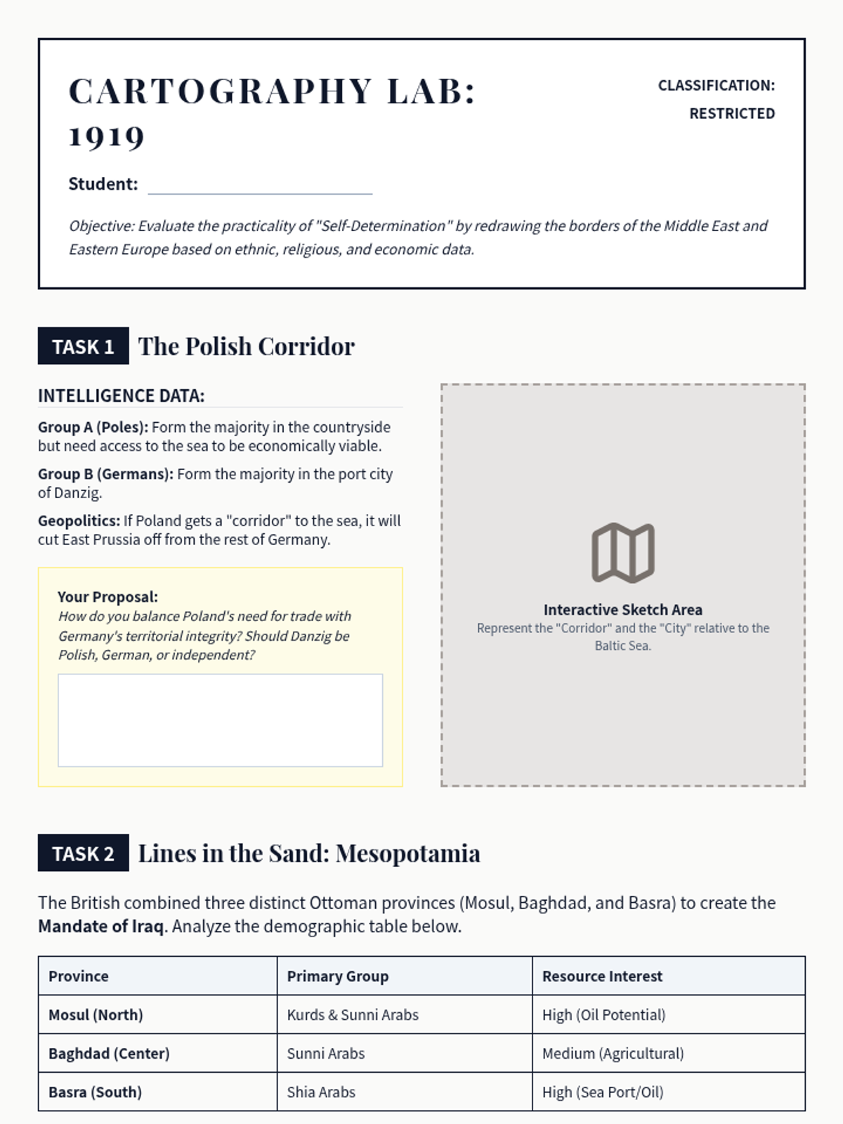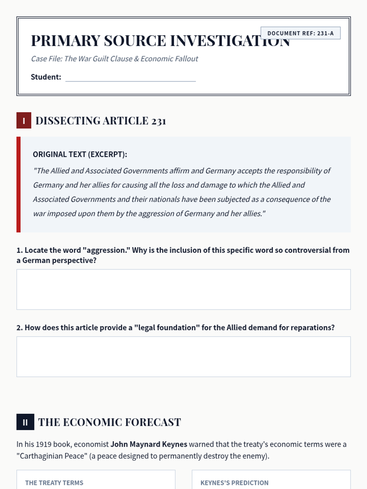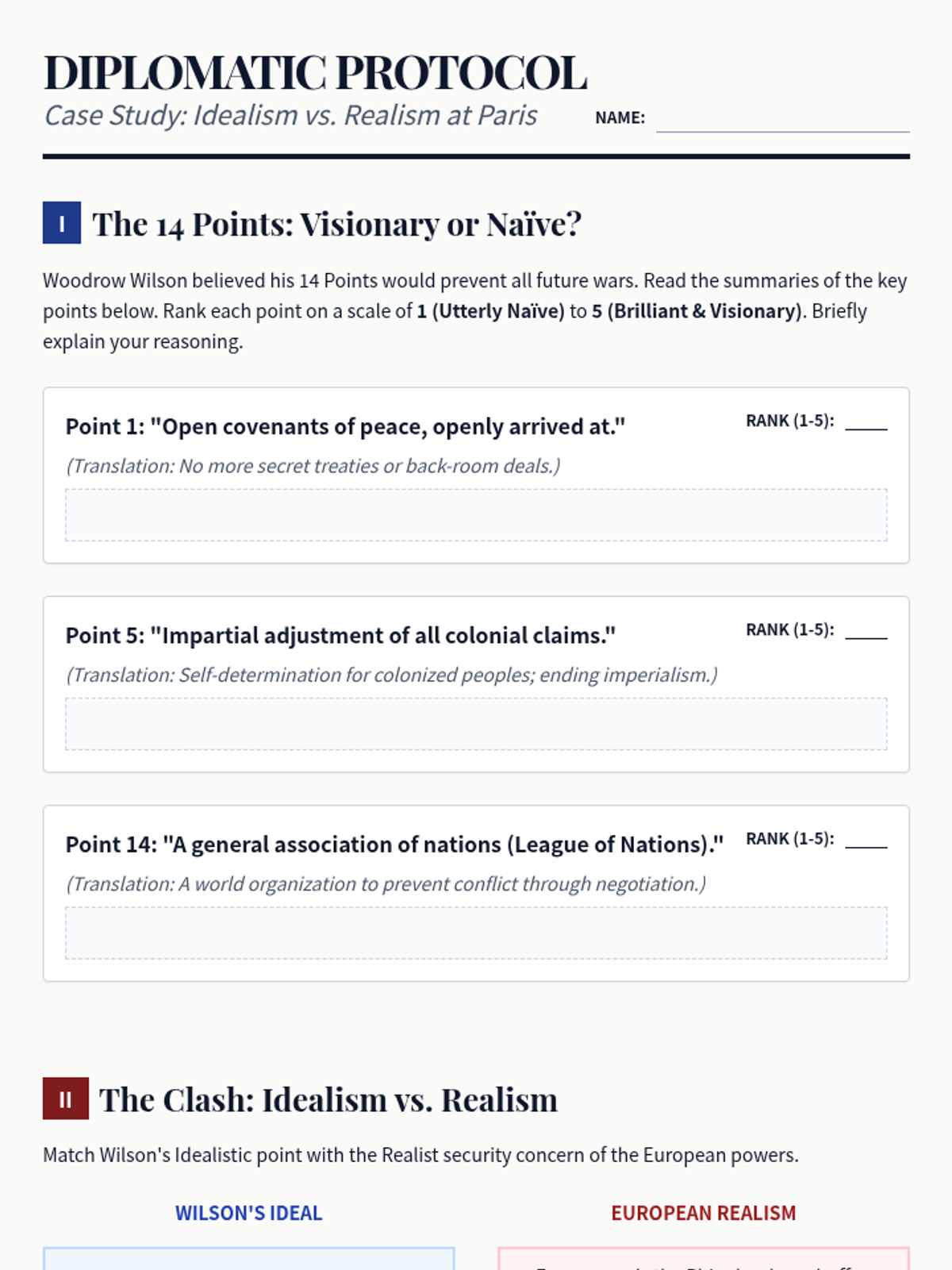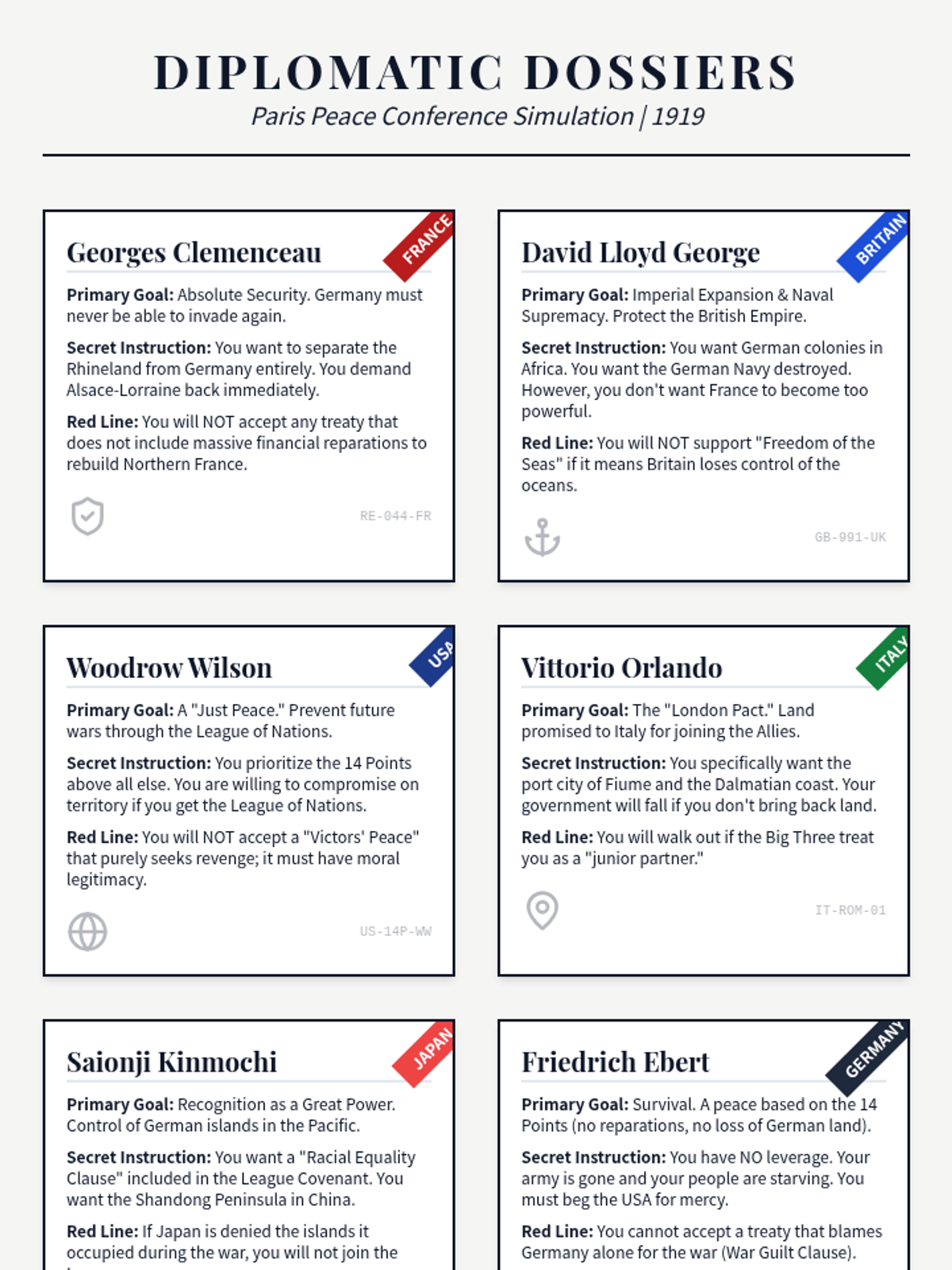 This high-stakes diplomacy sequence immerses 12th-grade students in the Paris Peace Conference. Students navigate the conflicting motivations of the 'Big Four', dissect the Treaty of Versailles, redraw global borders, and evaluate why the settlement ultimately failed to prevent further conflict.