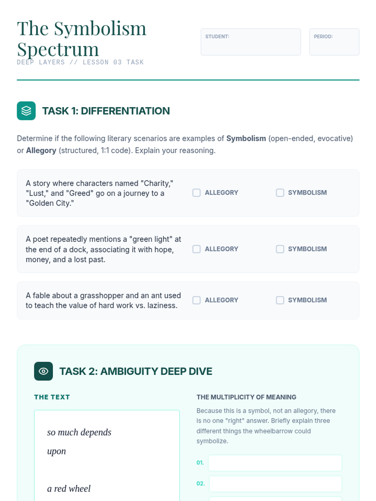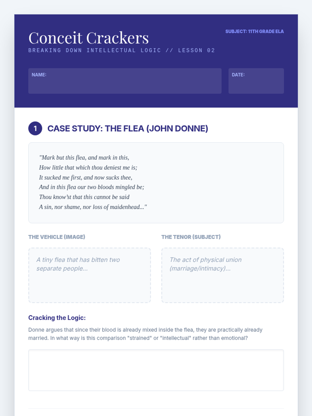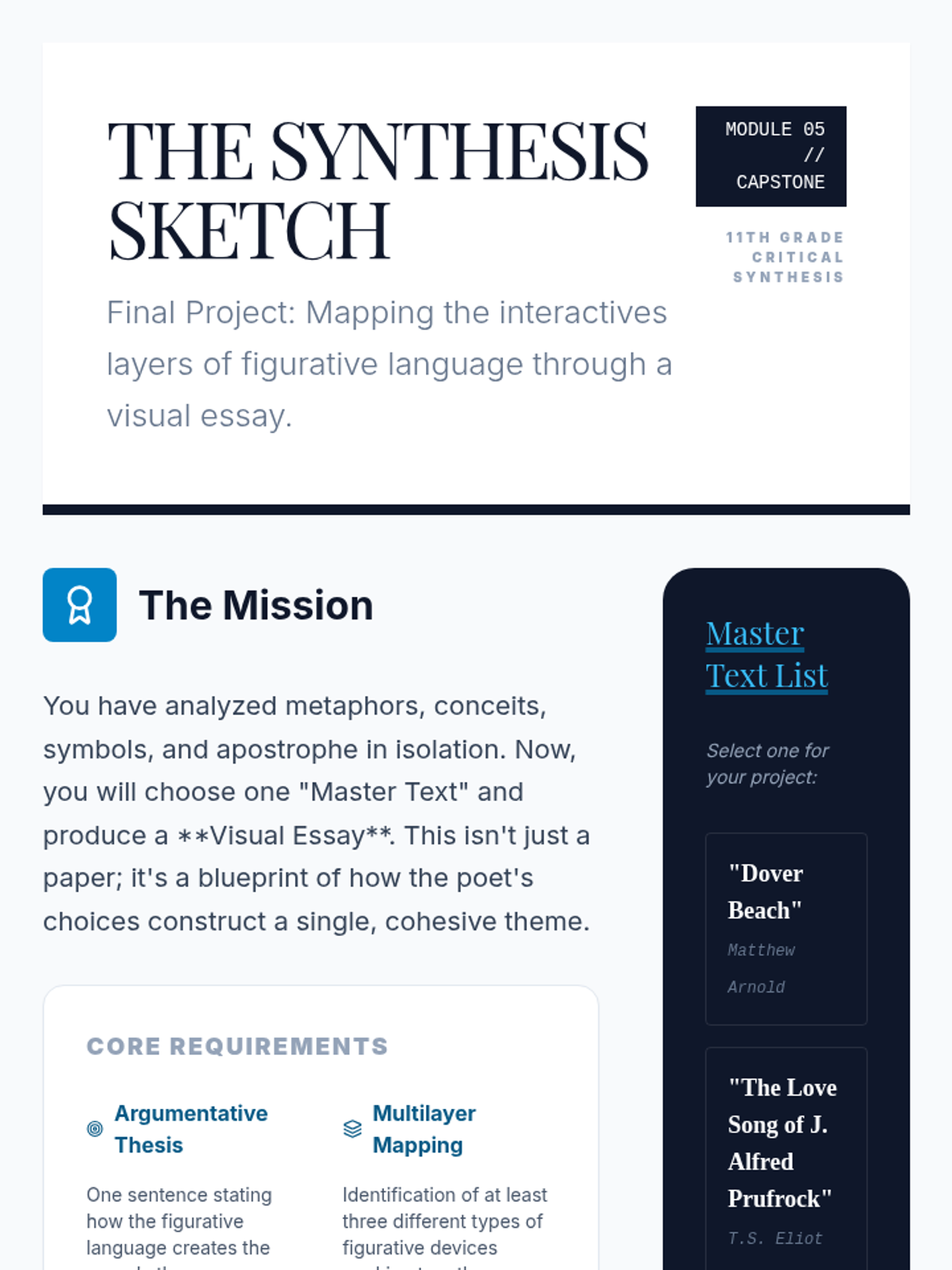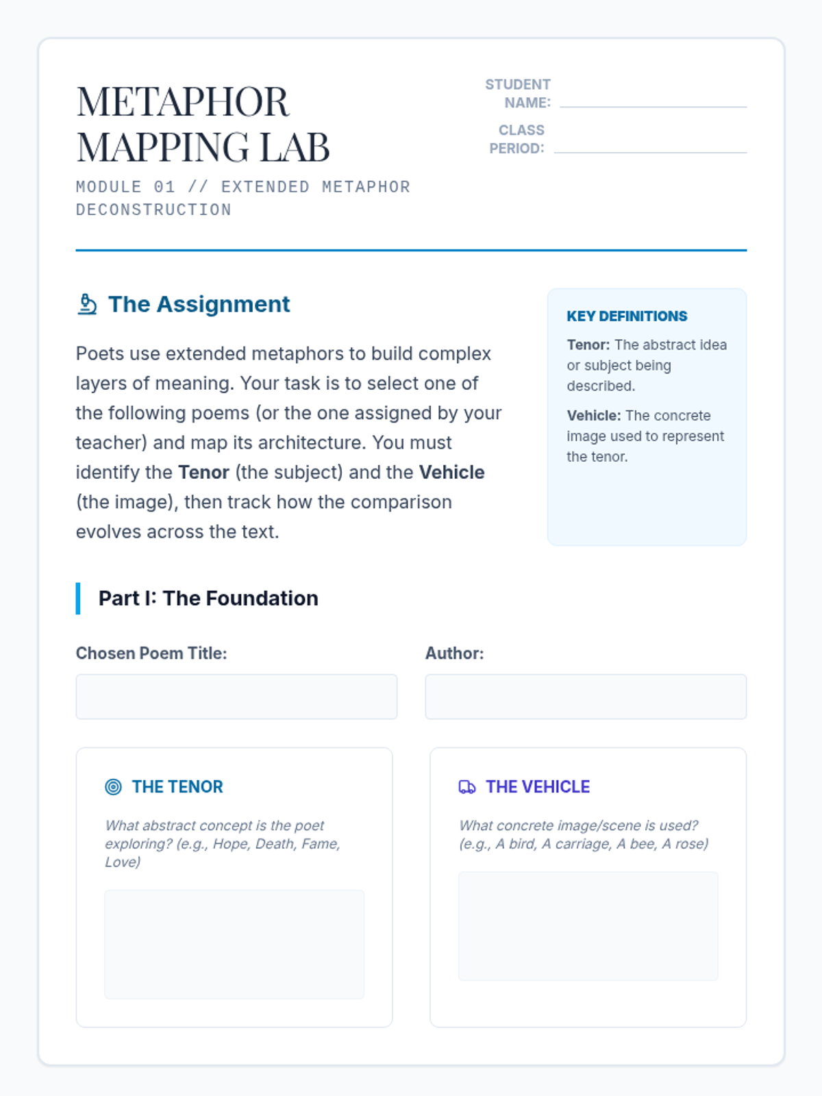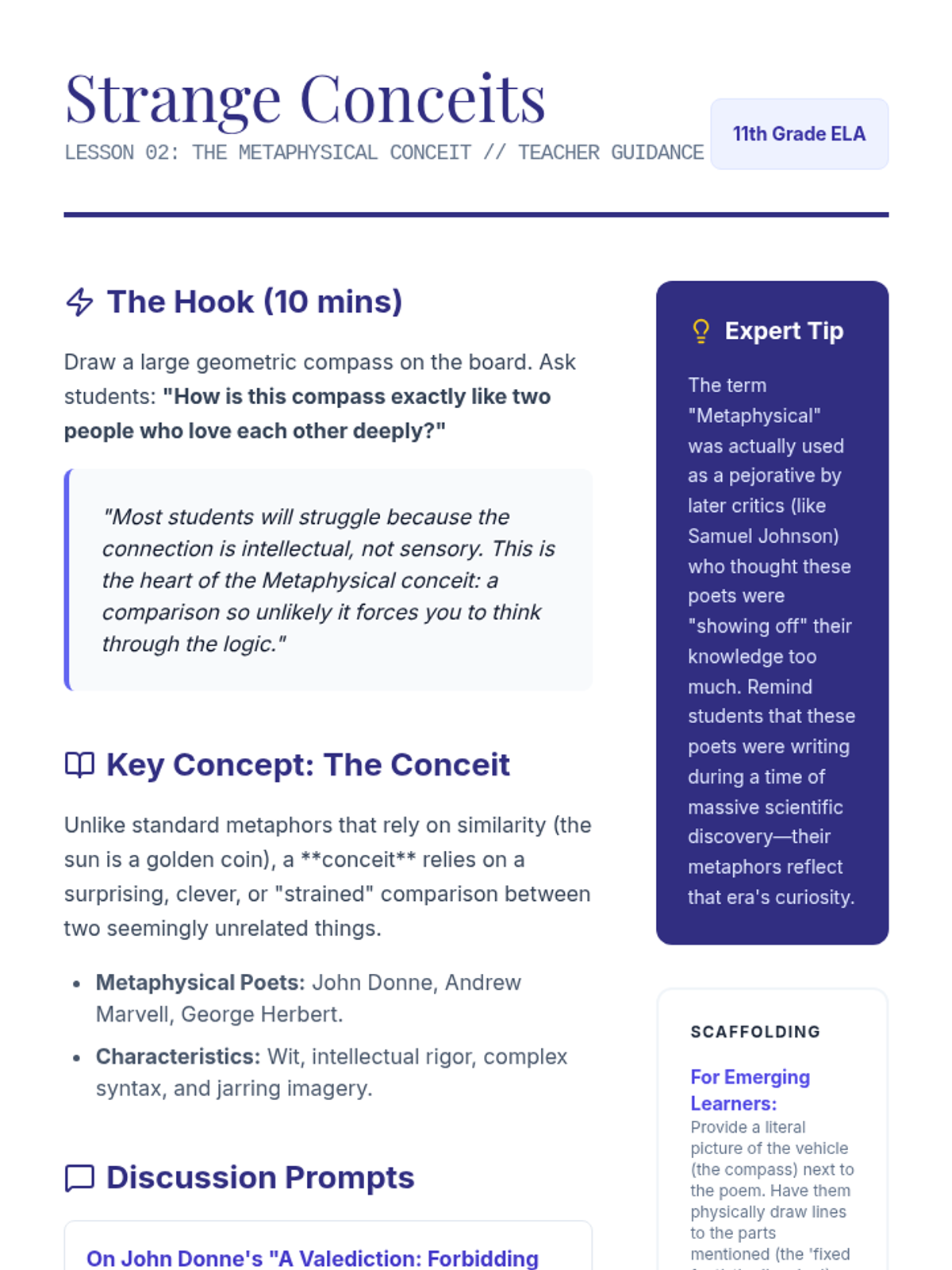 An advanced analysis sequence for 11th-grade students focusing on extended metaphors, metaphysical conceits, symbolism, and apostrophe. Students will move from basic identification to critical synthesis of how figurative language constructs abstract meaning.
