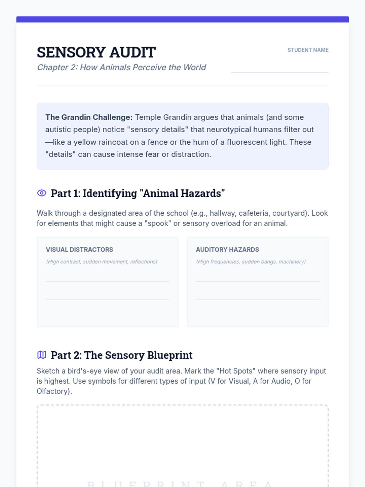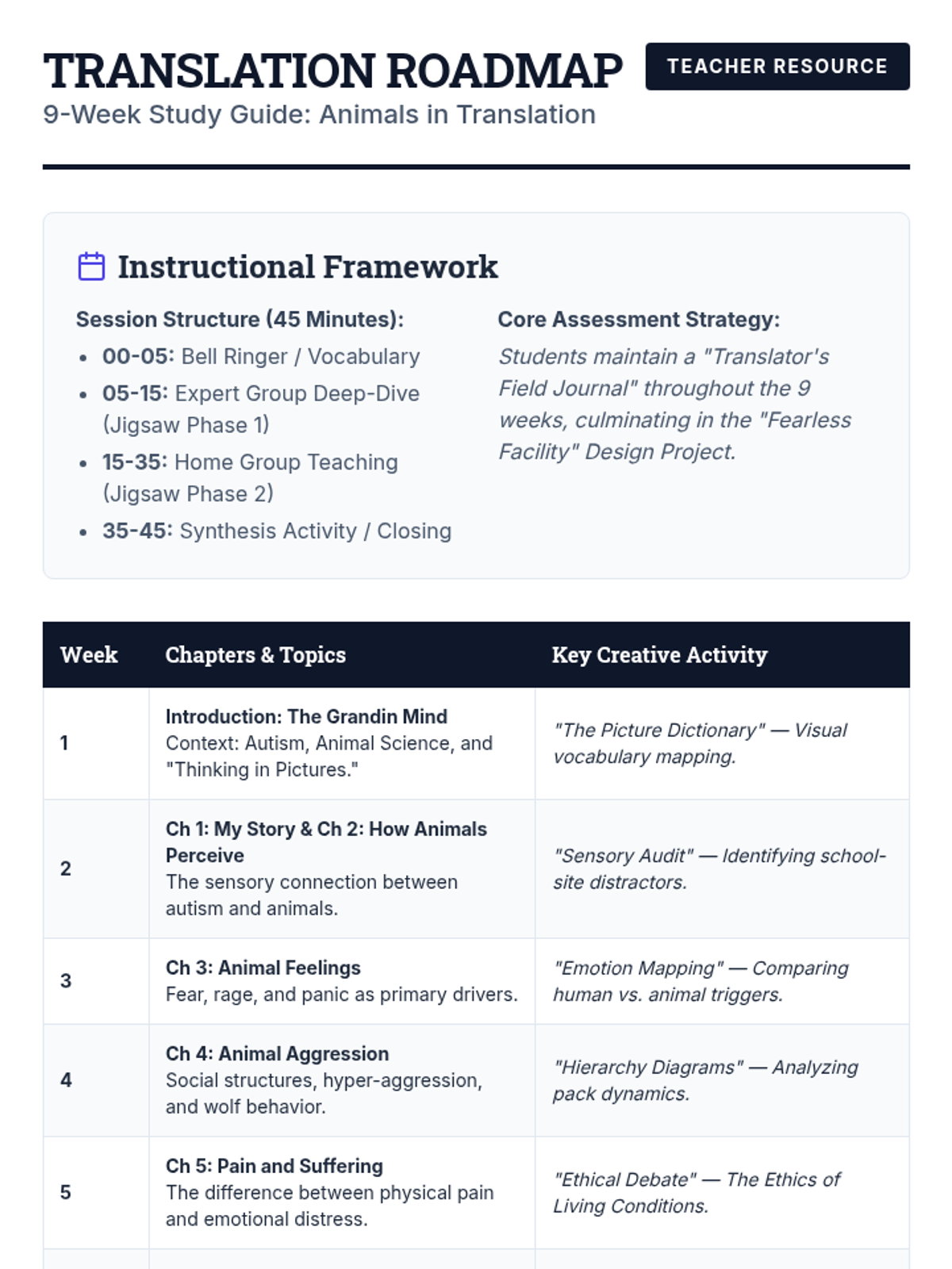 A comprehensive 9-week book study of Temple Grandin's 'Animals in Translation' for high school students, focusing on sensory perception, animal behavior, and inclusive design through jigsaw discussions and creative projects.