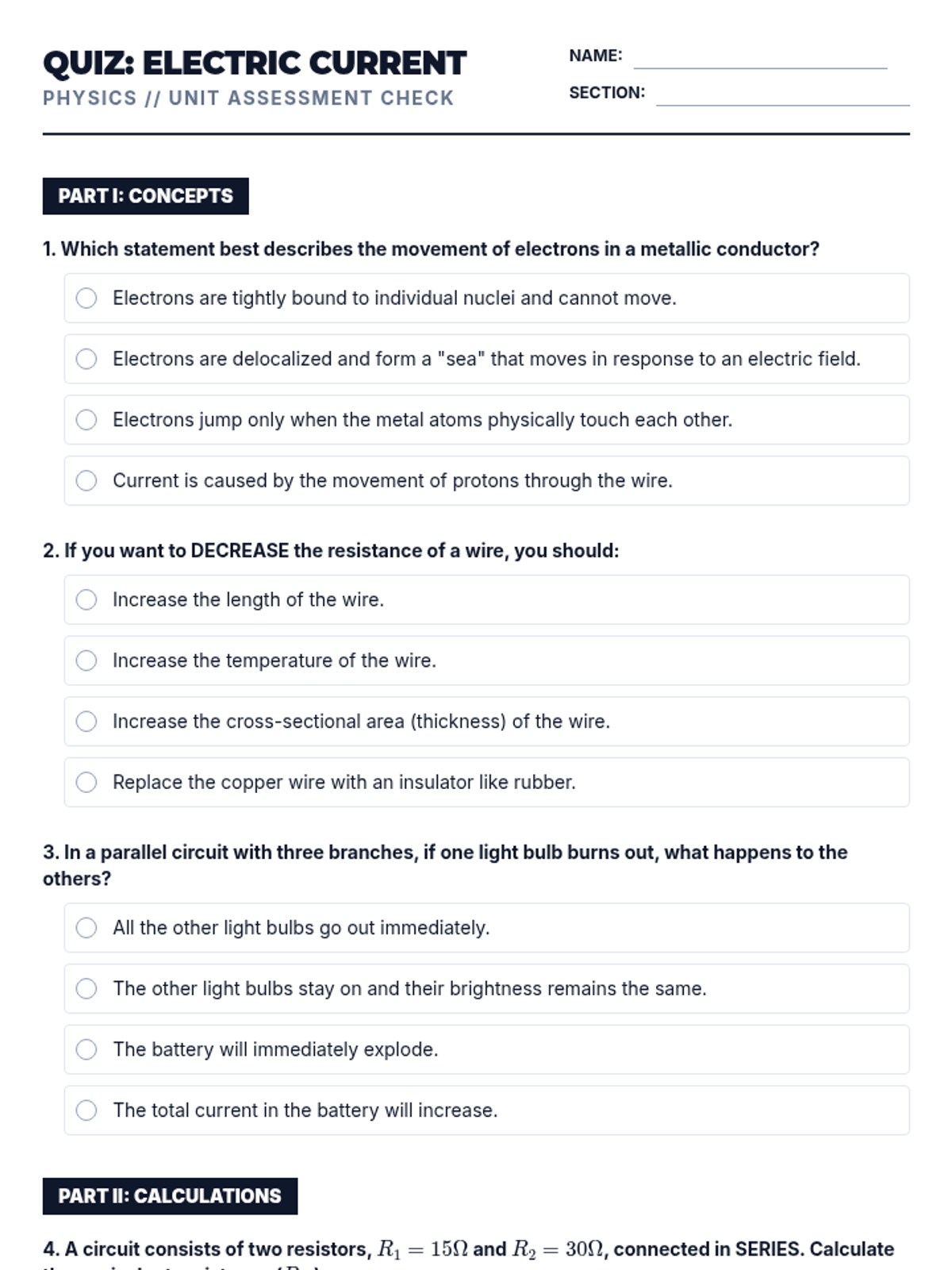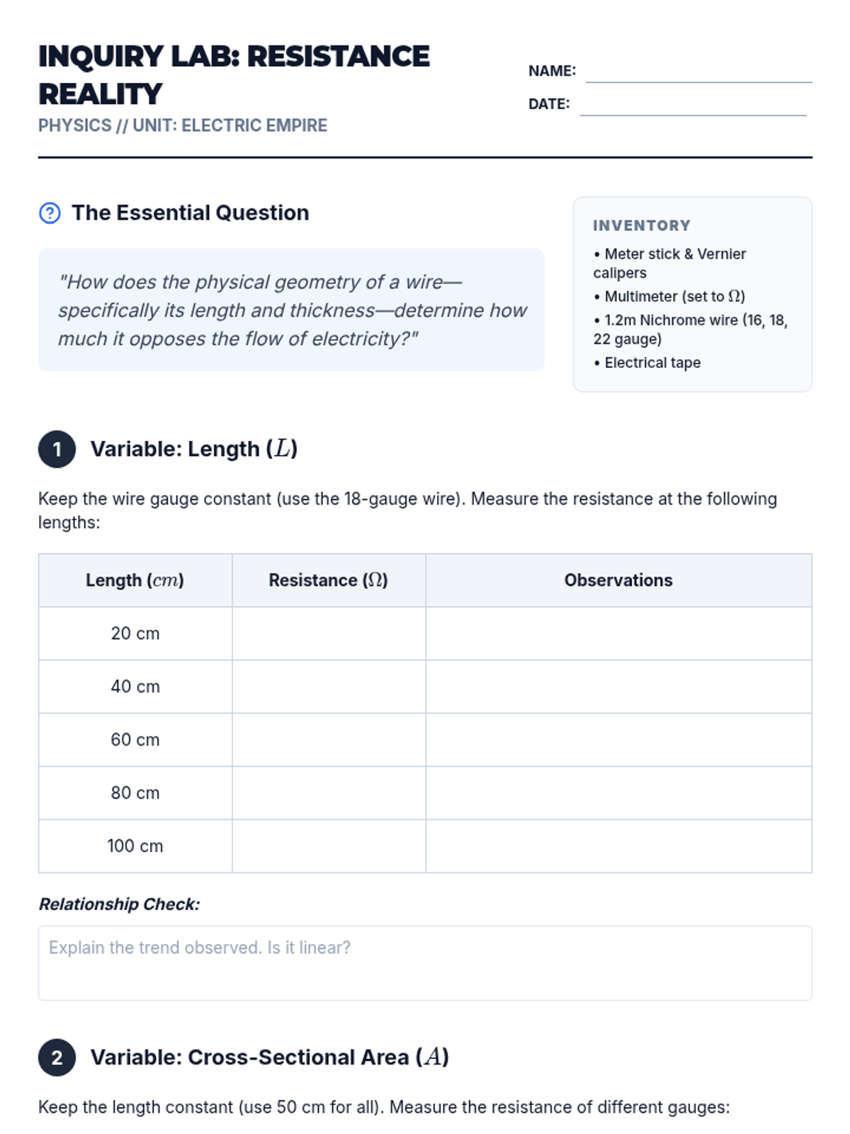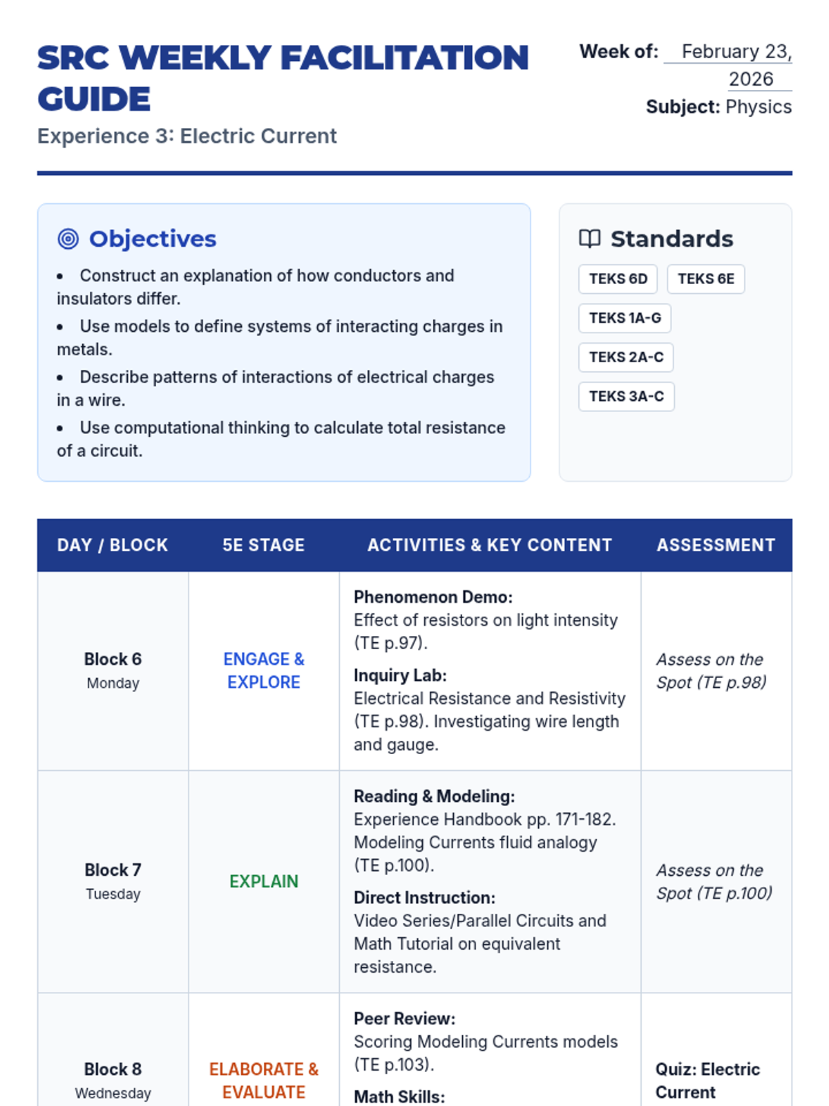 A comprehensive 5-day unit covering electric current, resistance, and circuit types. Students move from exploring the physical properties of conductors to mathematically modeling series and parallel circuits, culminating in a summative district assessment.