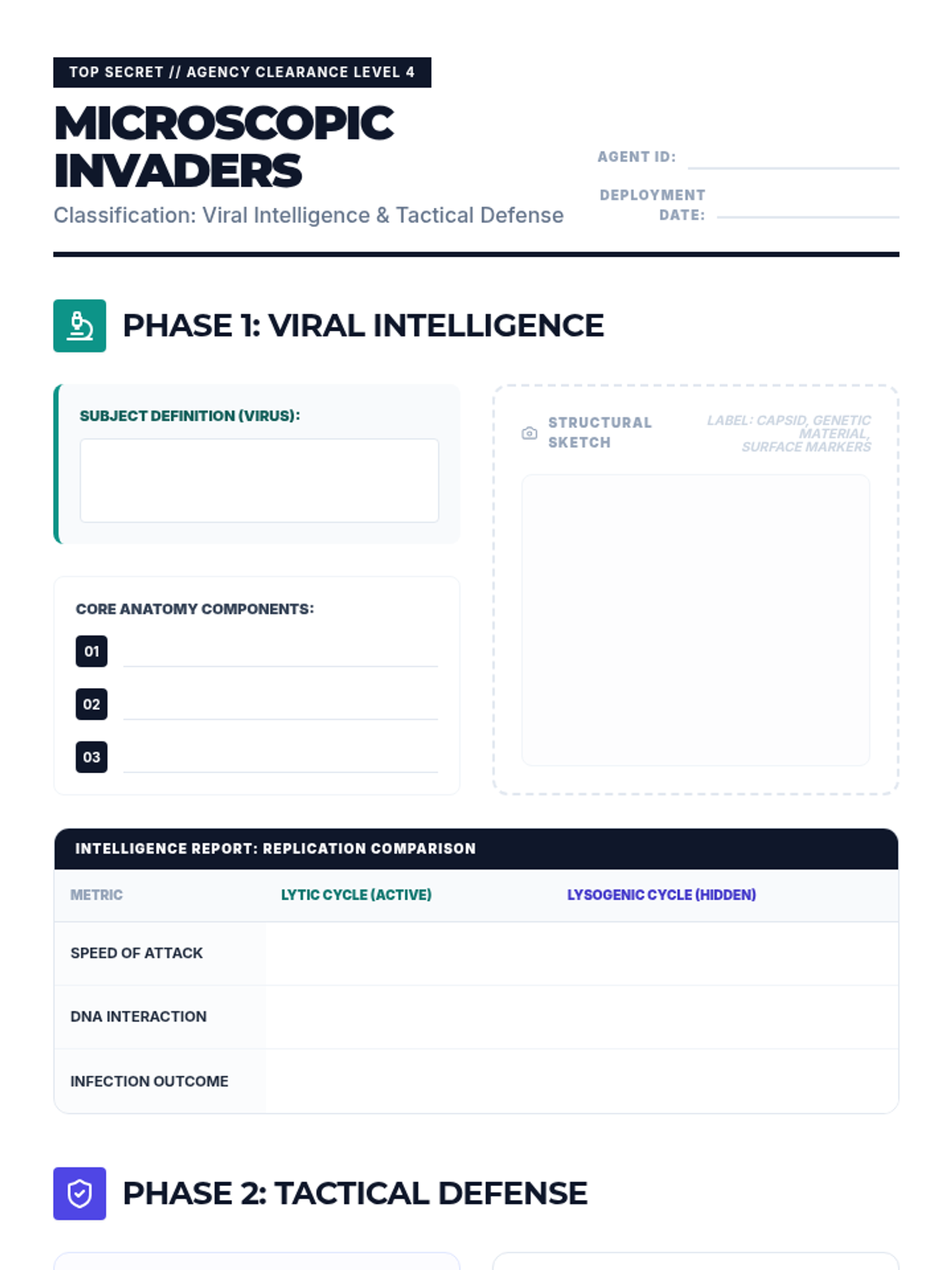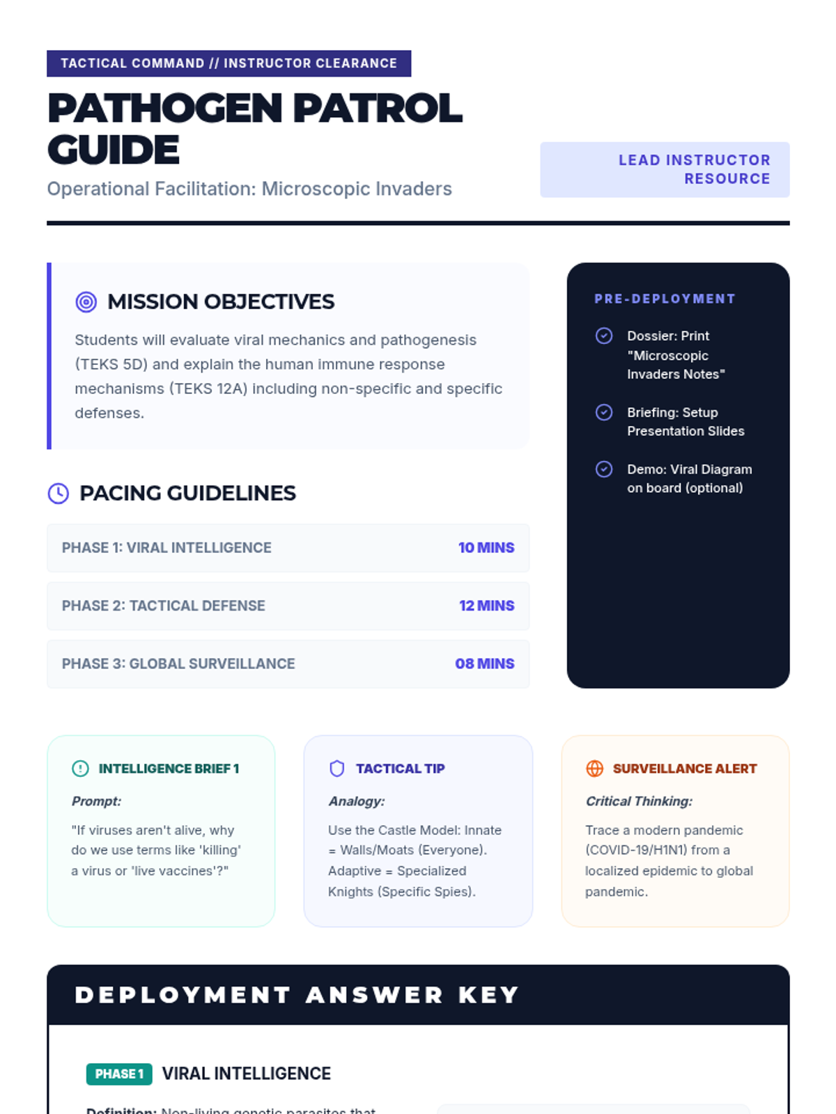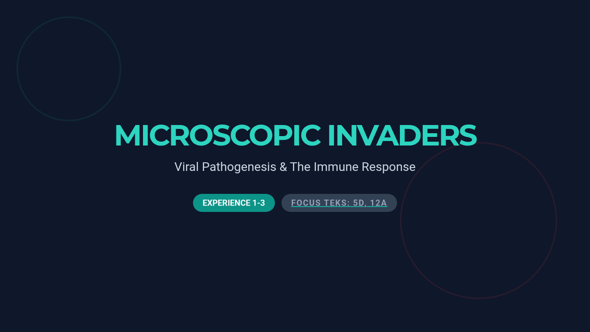 A comprehensive exploration of viral structure, pathogenesis, and the human immune response, covering TEKS 5D and 12A. This sequence bridges the gap between microscopic invaders and our biological defenses.