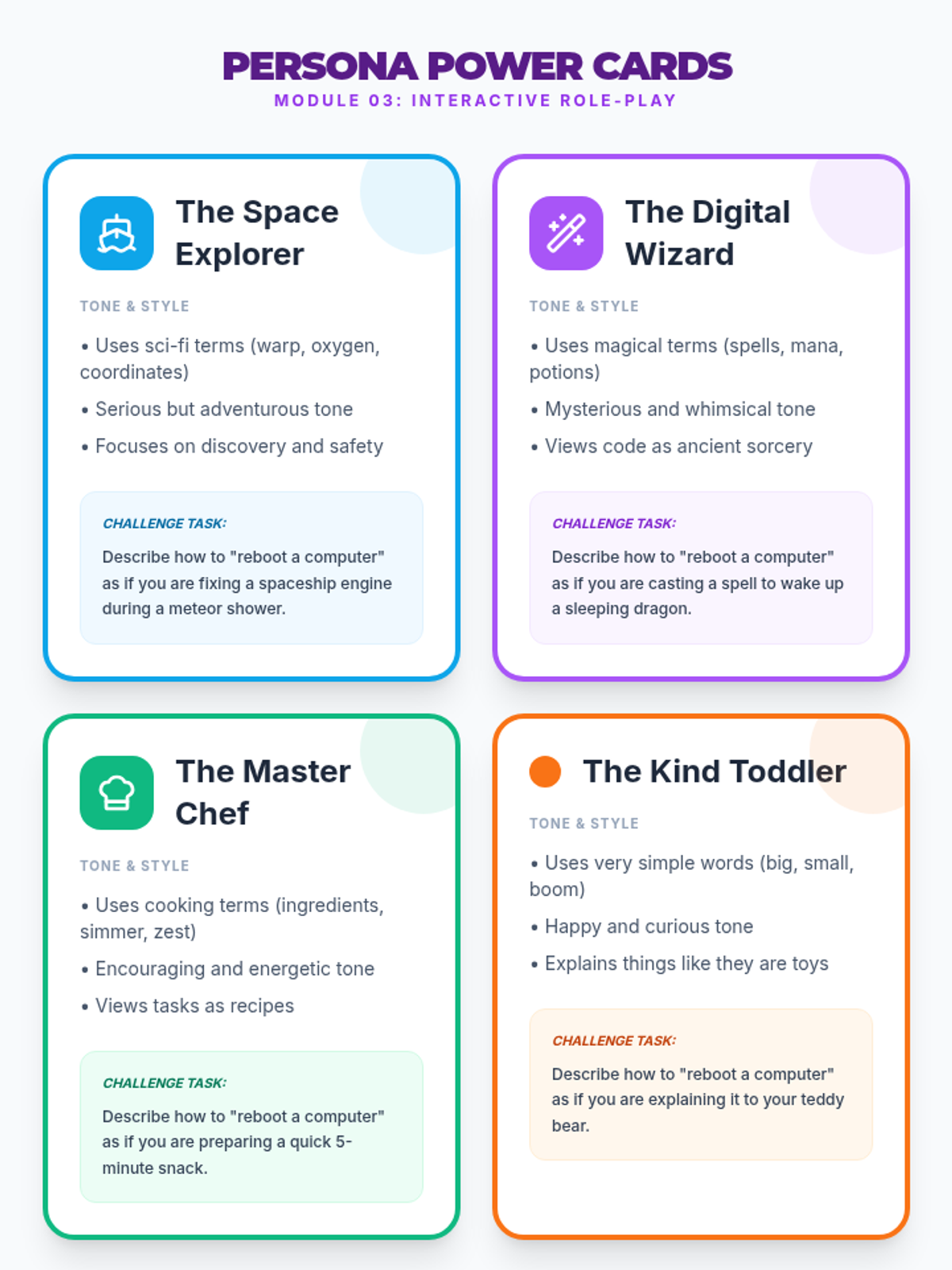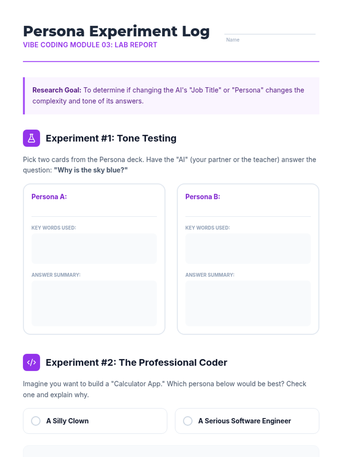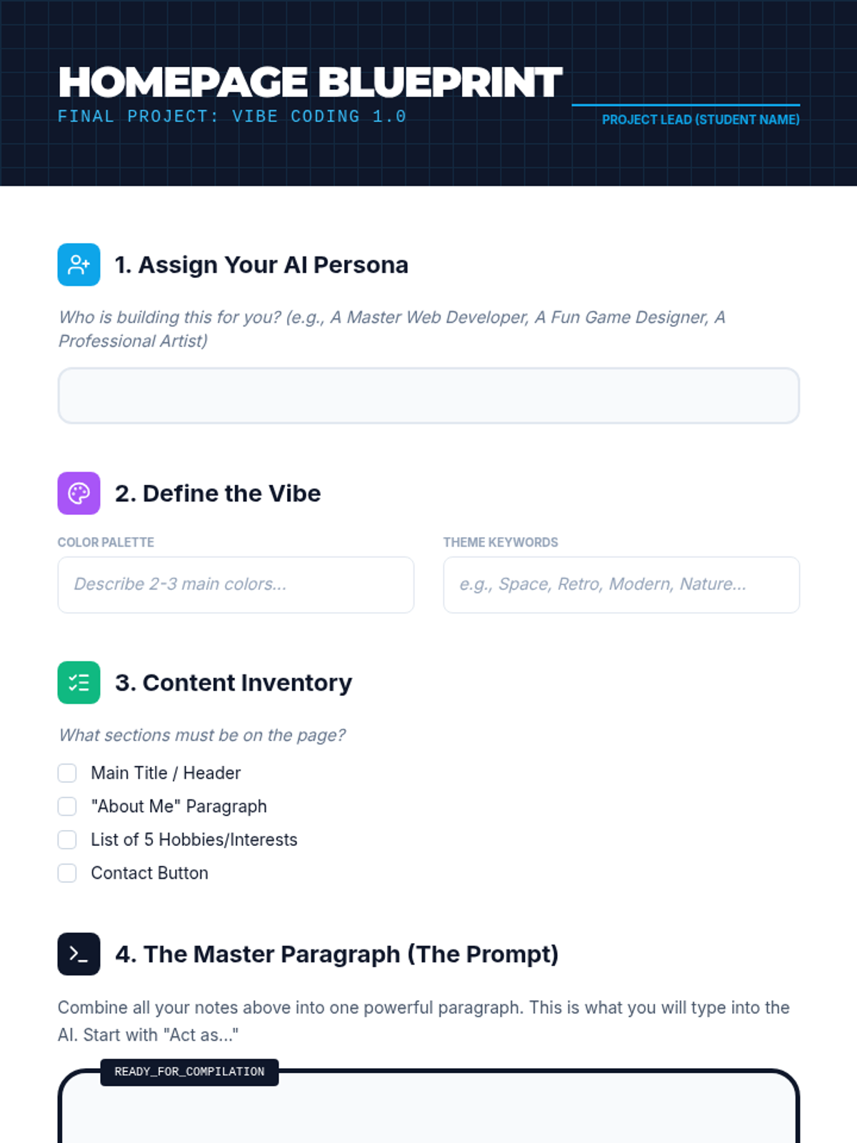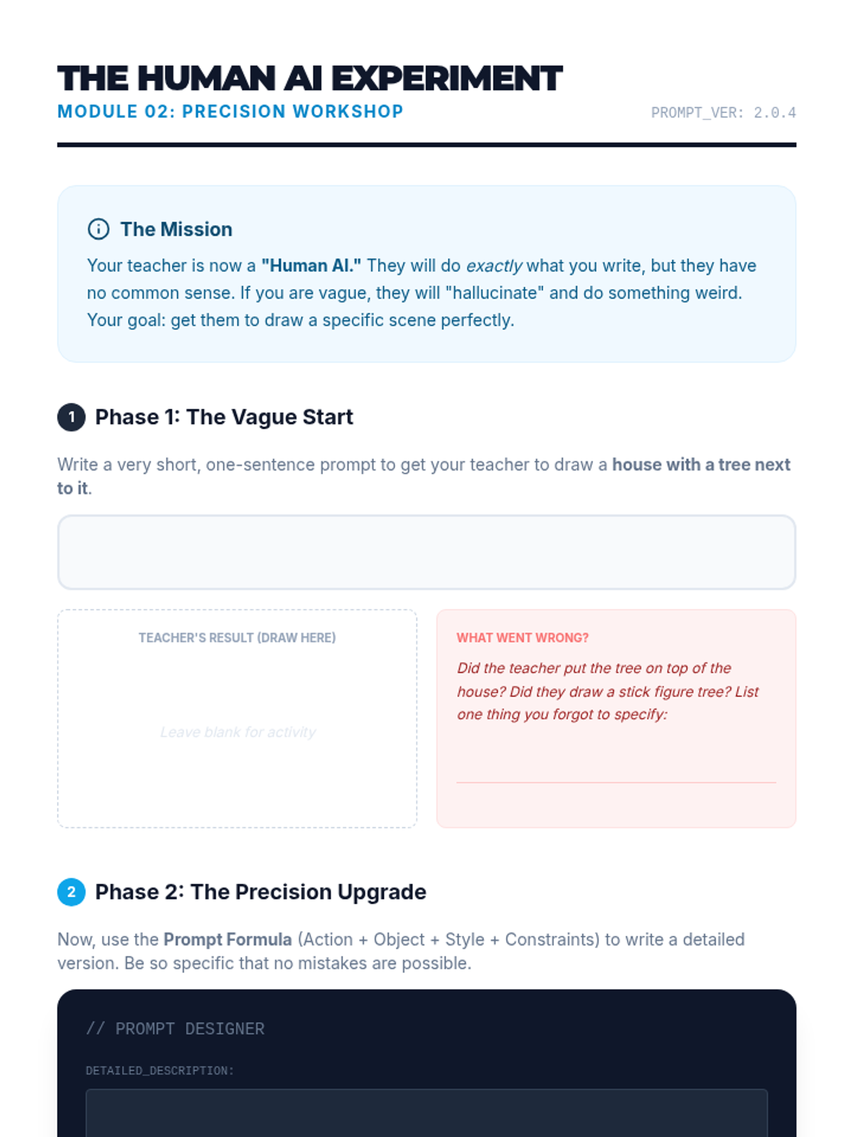 This sequence introduces 6th-grade students to the fundamental concepts of Large Language Models (LLMs) and how they interpret natural language to generate code. Students transition from rigid syntax programming to intent-based instructions, learning that clarity, context, and specificity are the new 'syntax' of the AI era.