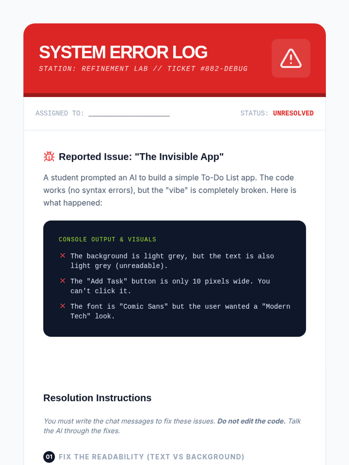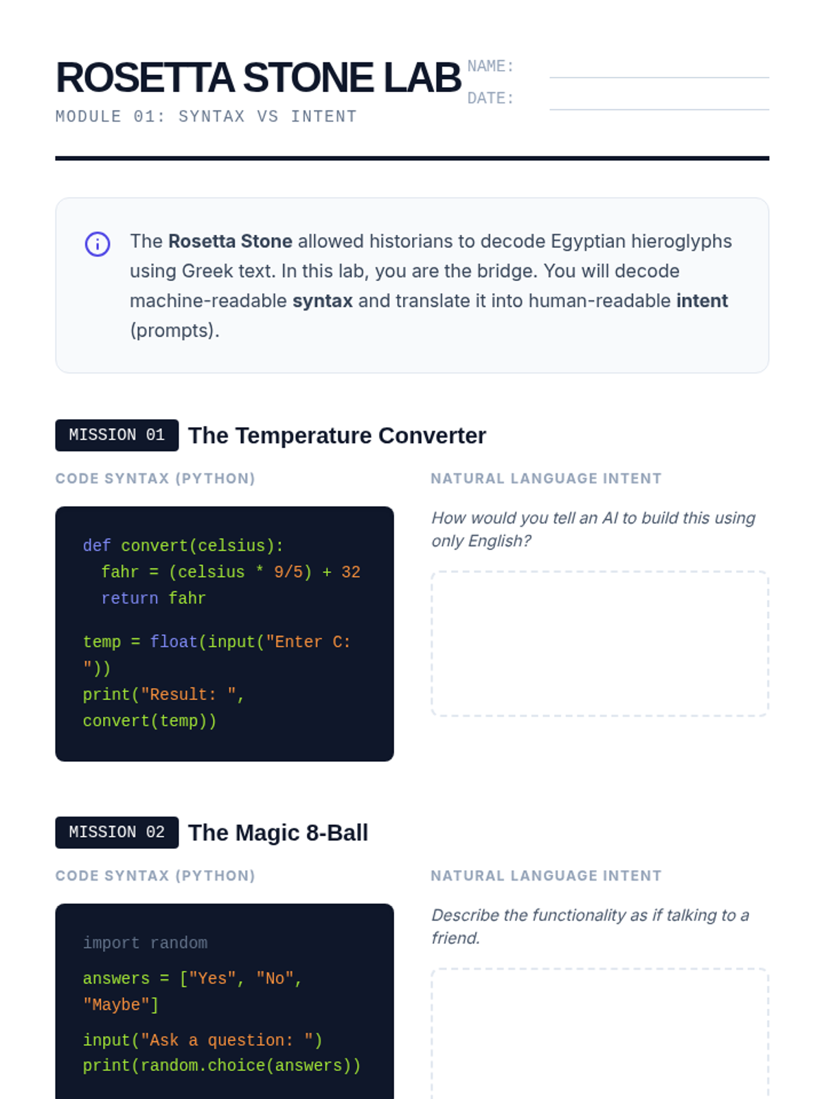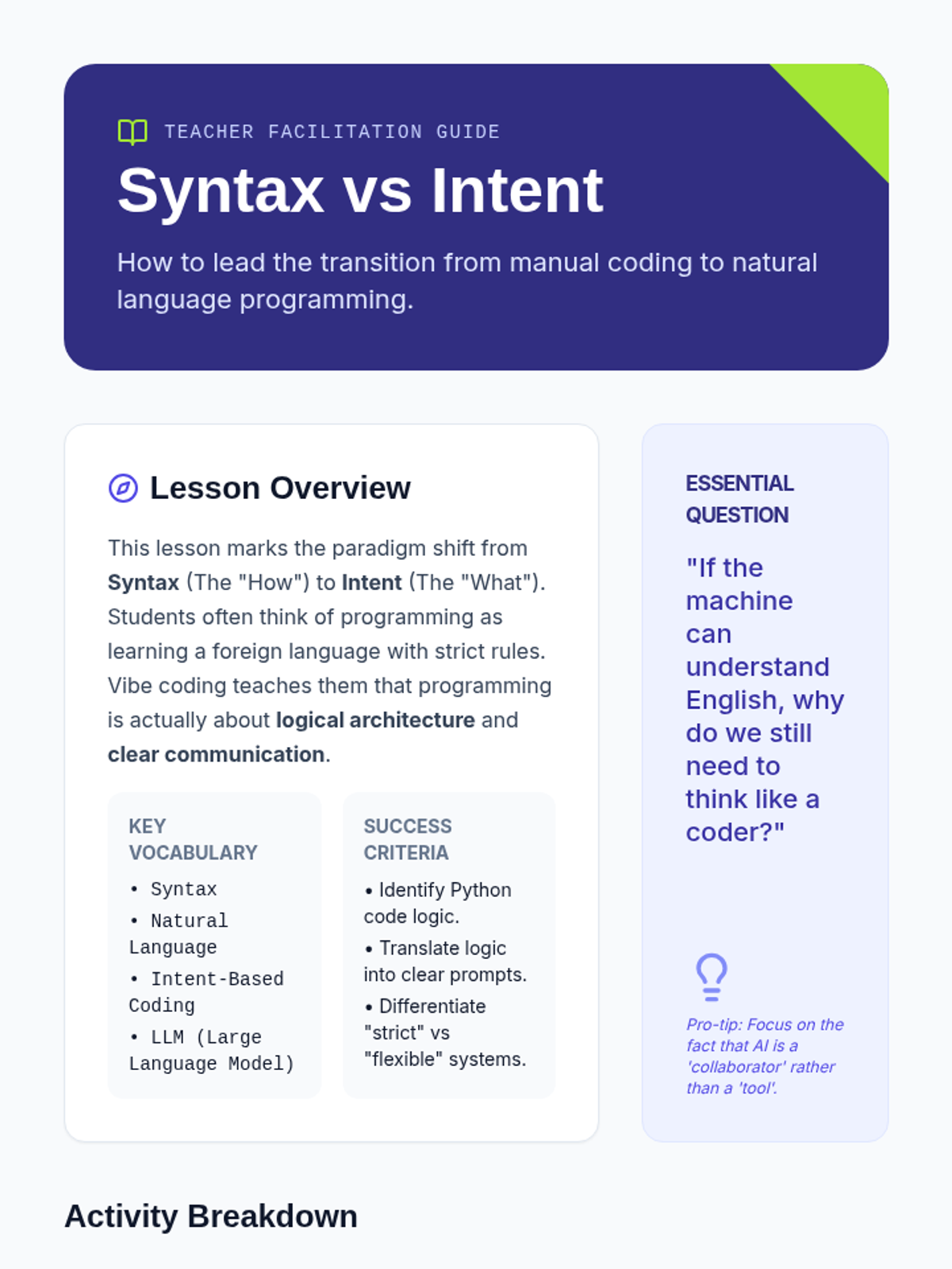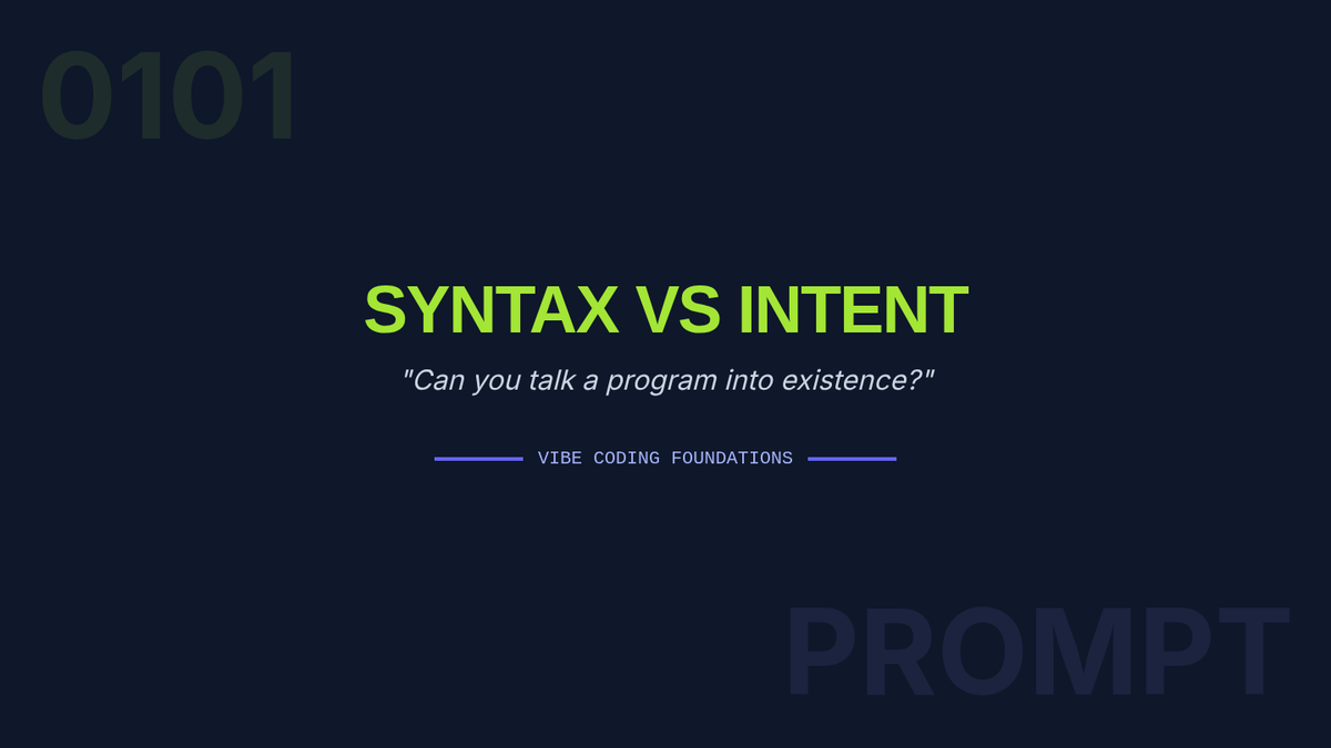 A comprehensive introduction to 'vibe coding' for 7th graders, shifting the focus from manual syntax to natural language intent. Students learn to use AI as a bridge between their ideas and functional software through precision, context, and iterative refinement.