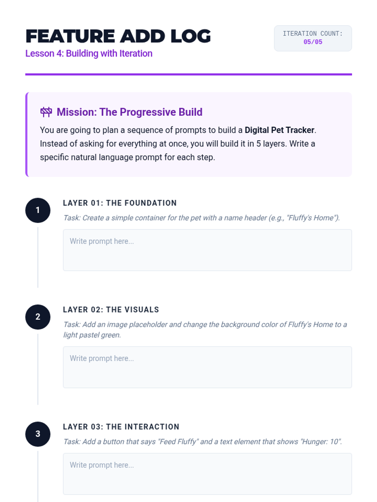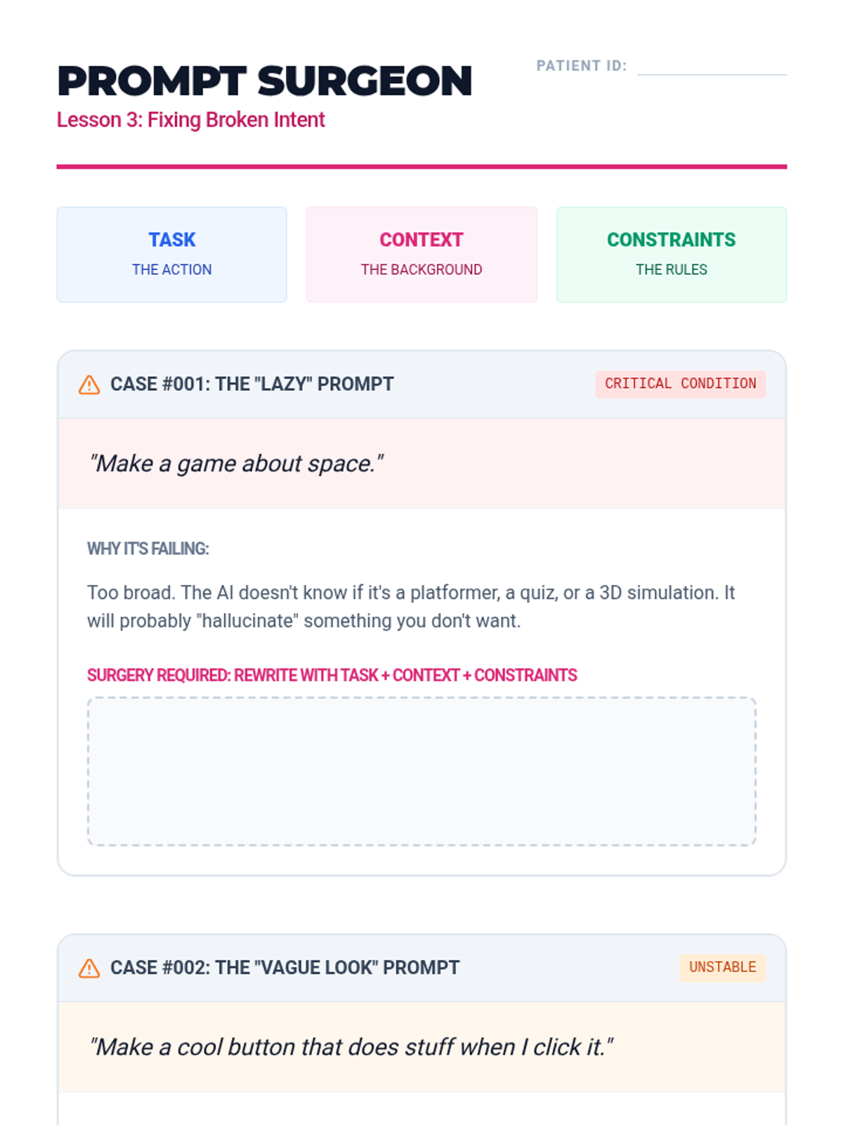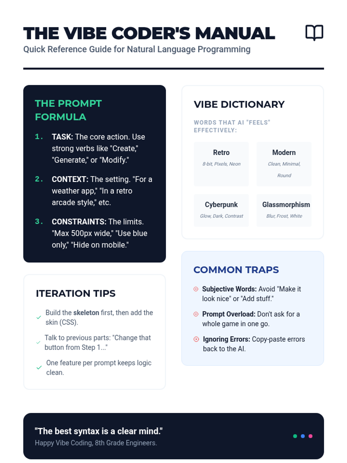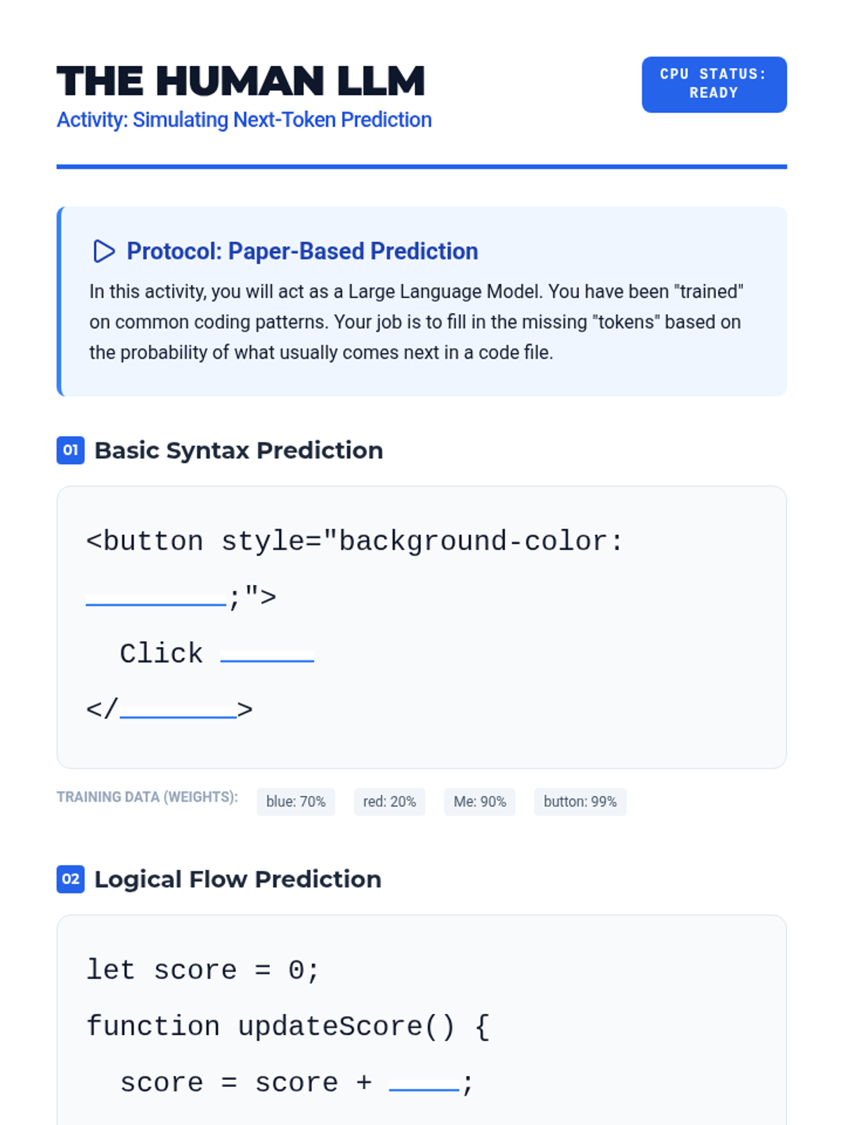 This introductory sequence establishes the foundational concepts of 'vibe coding'—programming via natural language descriptions rather than manual syntax entry. Students explore how Large Language Models (LLMs) interpret intent to generate code, comparing traditional coding workflows with AI-assisted development.