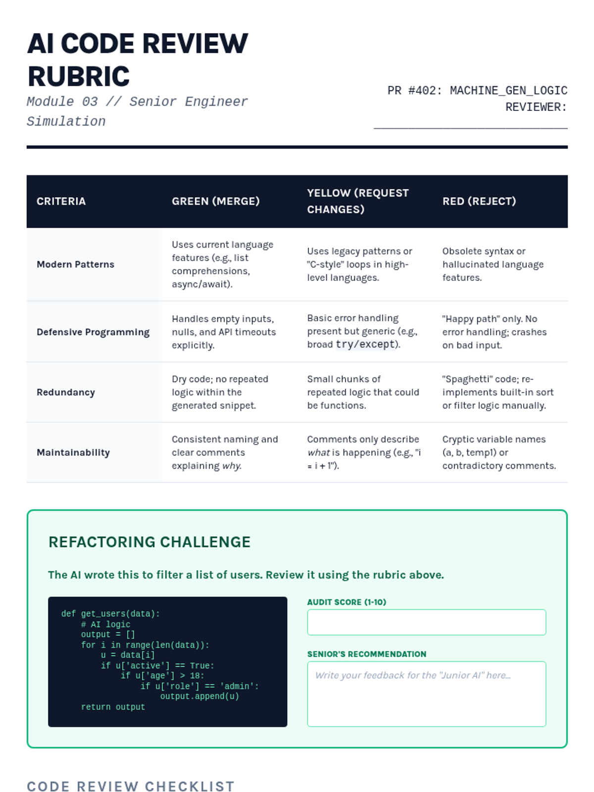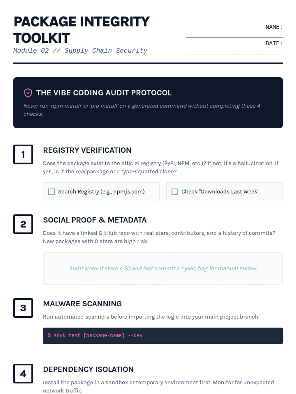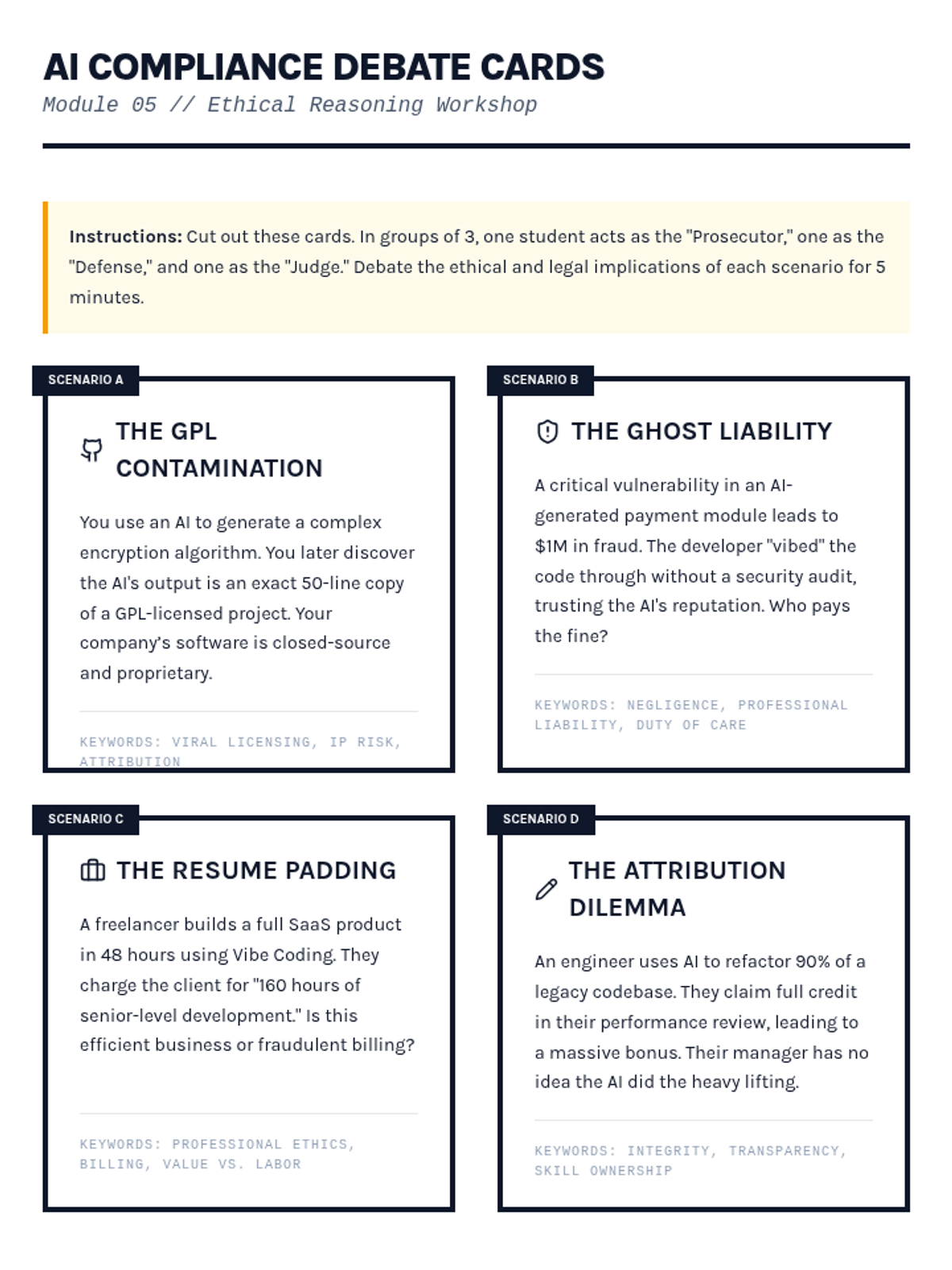 This sequence explores the critical intersection of security, ethics, and quality assurance in AI-augmented development (Vibe Coding). Students transition from simple generation to rigorous auditing, learning to identify vulnerabilities, verify dependencies, and navigate the complex legal landscape of machine-generated software.