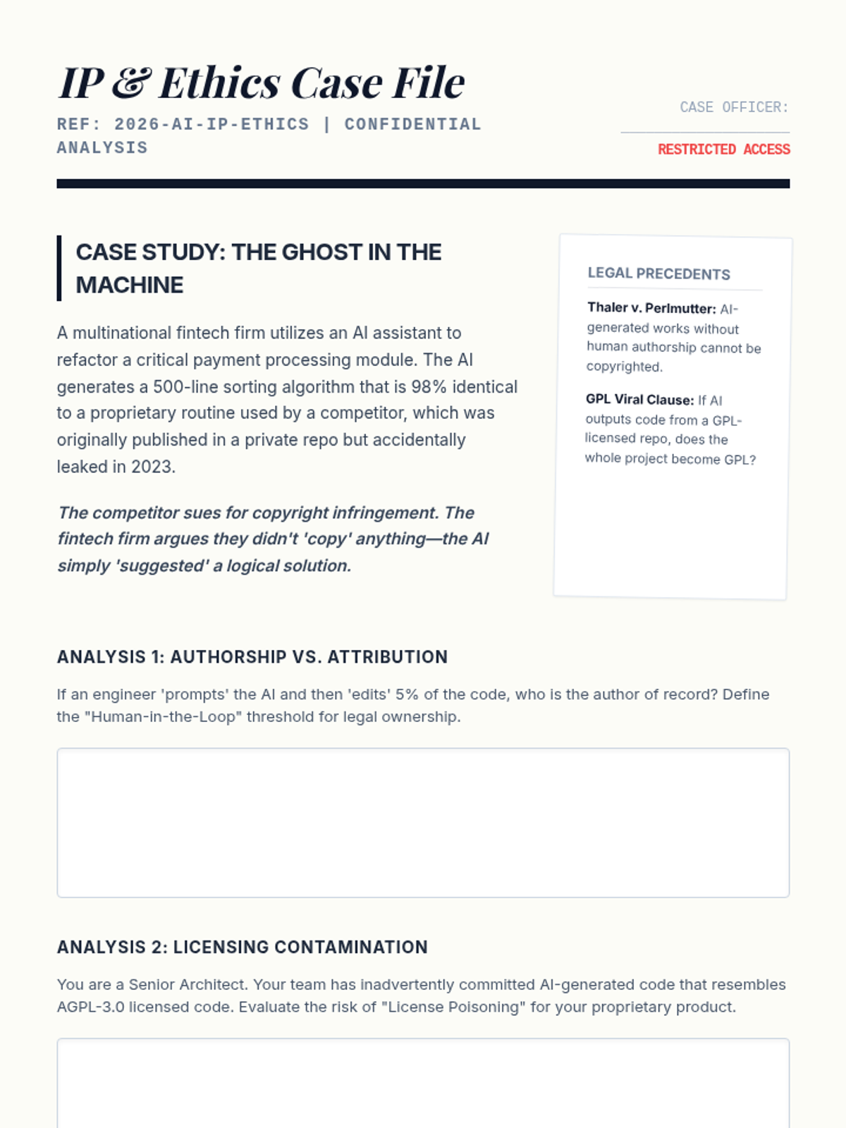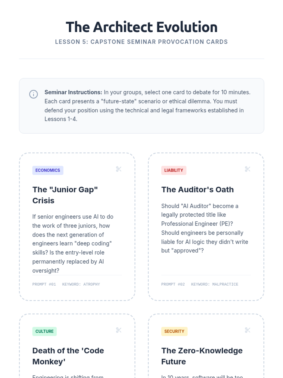 A comprehensive graduate-level exploration of the technical and ethical shifts in engineering caused by AI-assisted 'vibe coding'. This sequence focuses on automation bias, security vulnerabilities, intellectual property challenges, and the evolution of the software engineer's role from author to auditor.