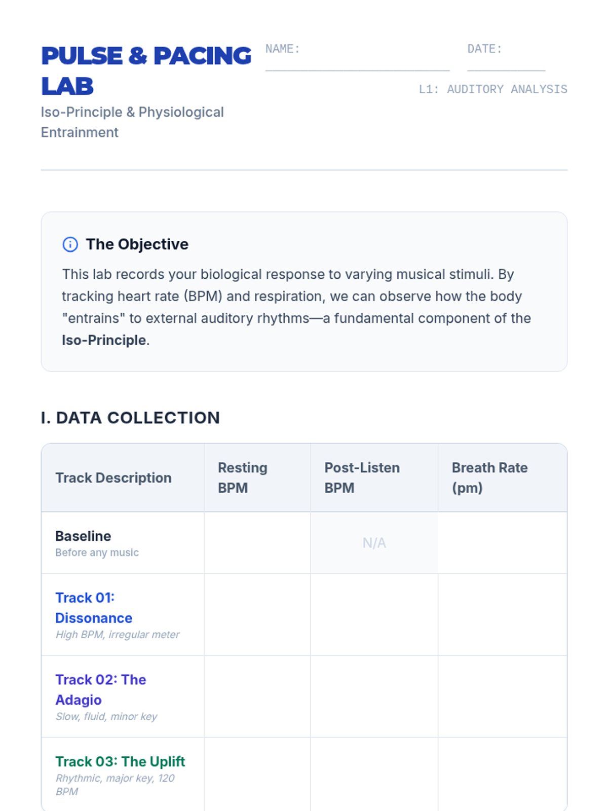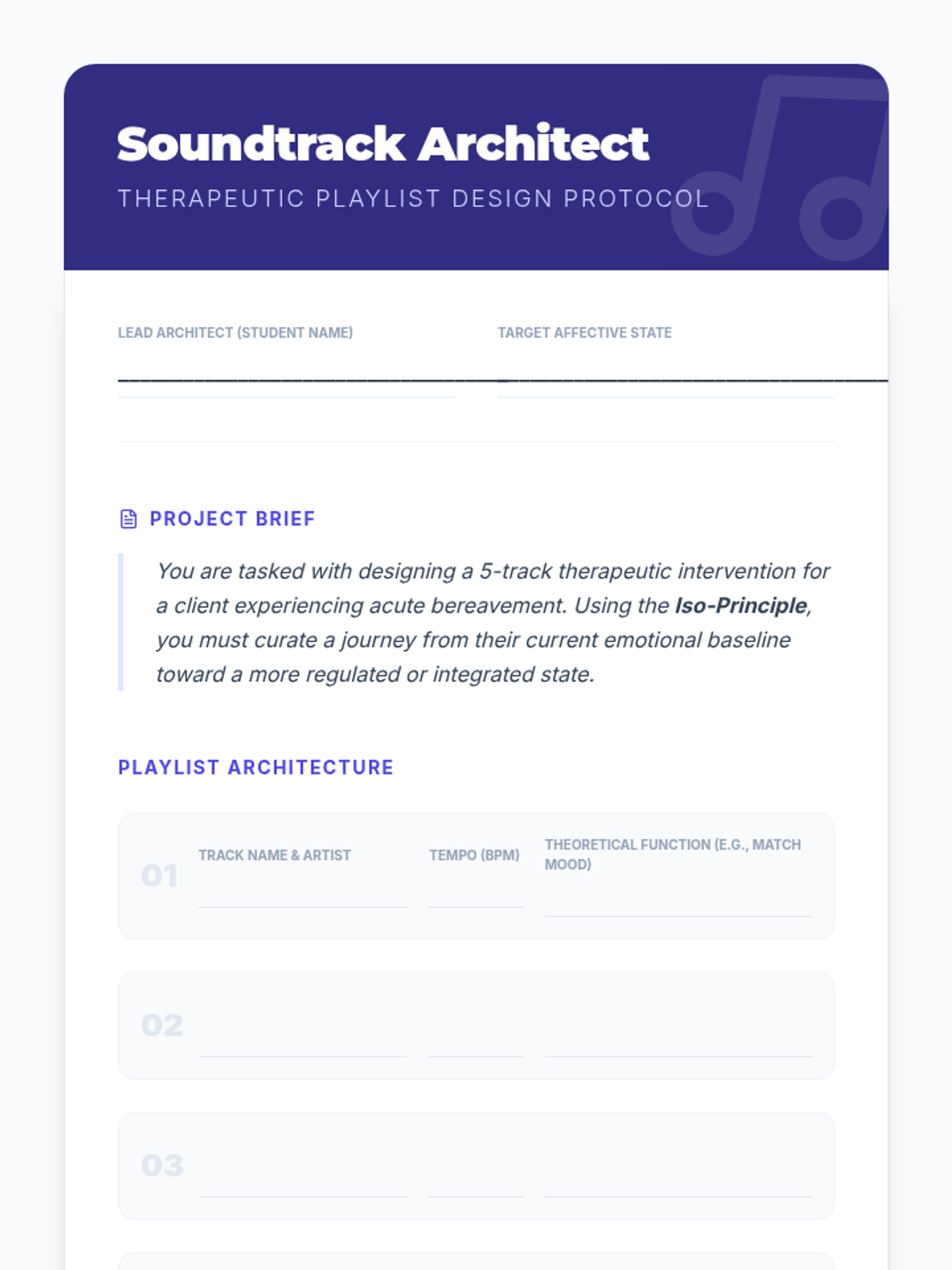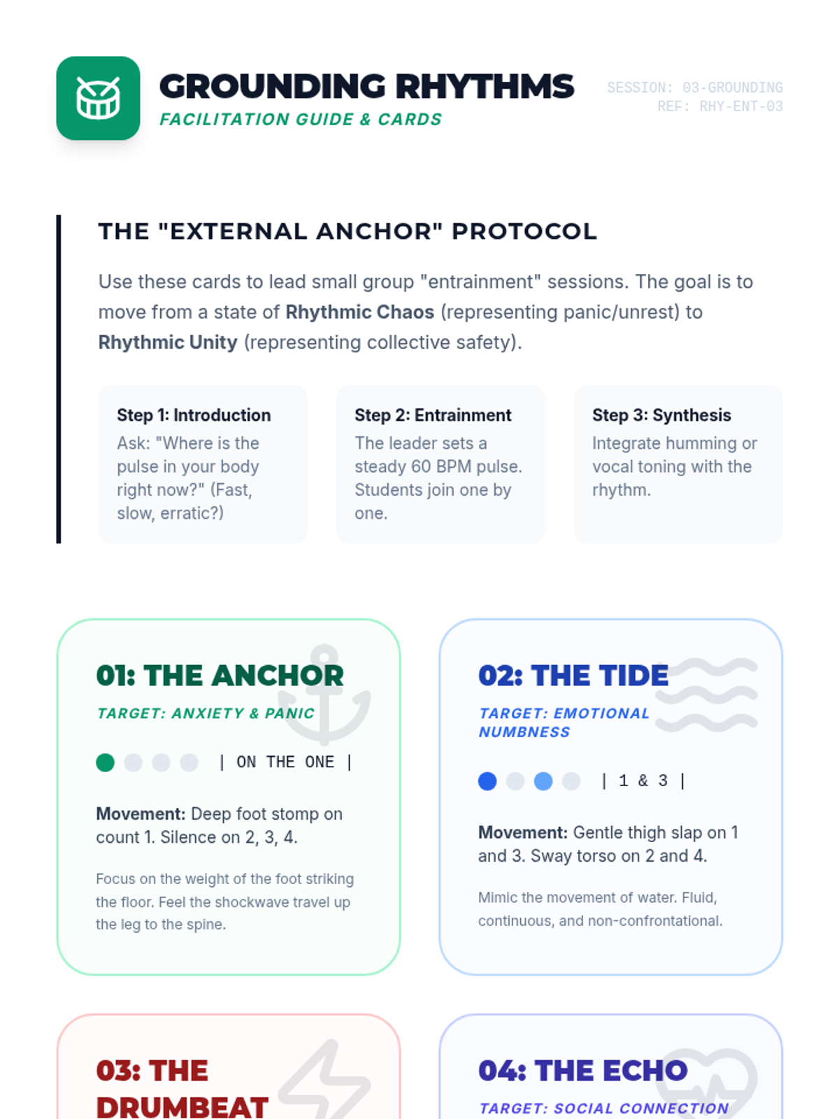 A comprehensive sequence exploring non-verbal, auditory, and somatic pathways for bereavement support. Students investigate the neurobiology of music, rhythmic entrainment, and somatic release techniques to support emotional regulation in the context of loss.