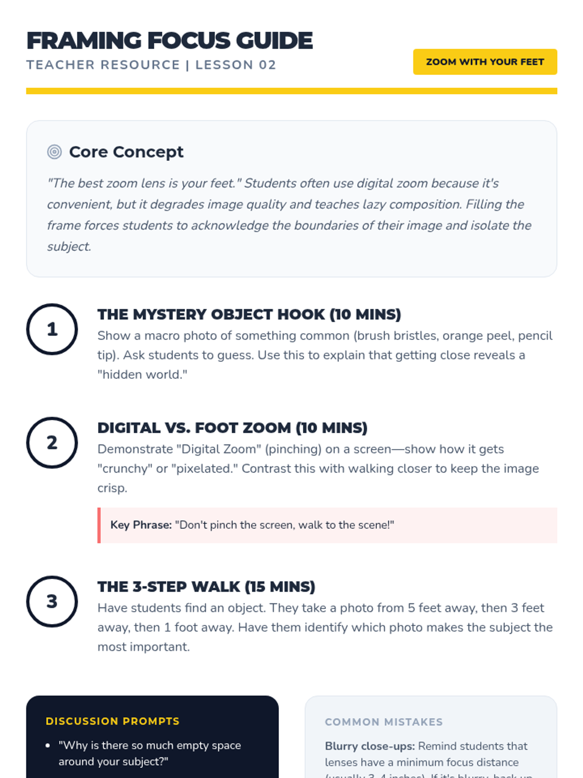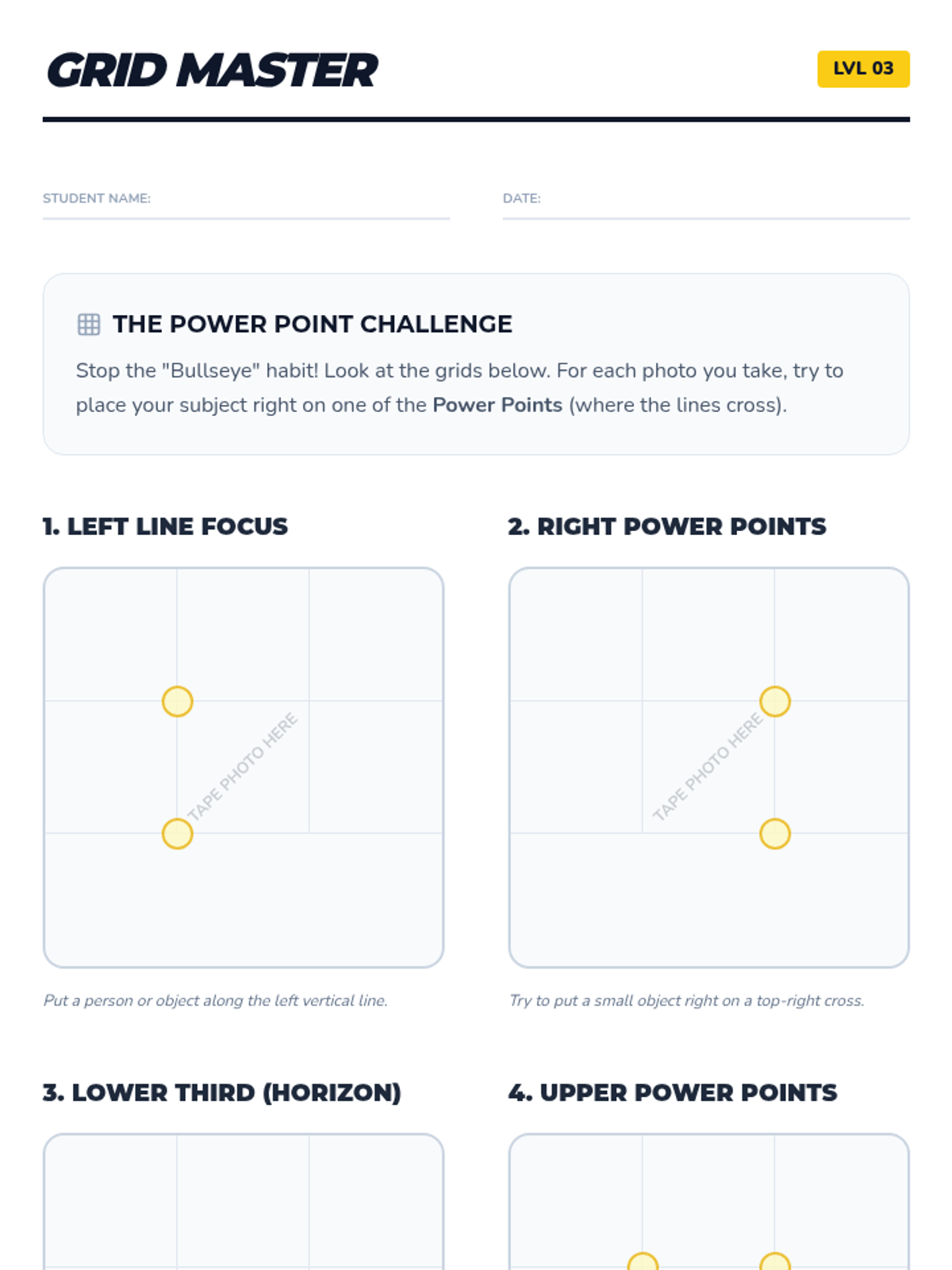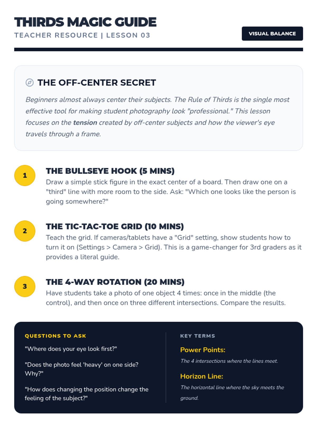 A photography sequence for 3rd graders focused on composition, framing, and intentional image-making. Students progress from basic camera handling to advanced concepts like the Rule of Thirds and perspective.