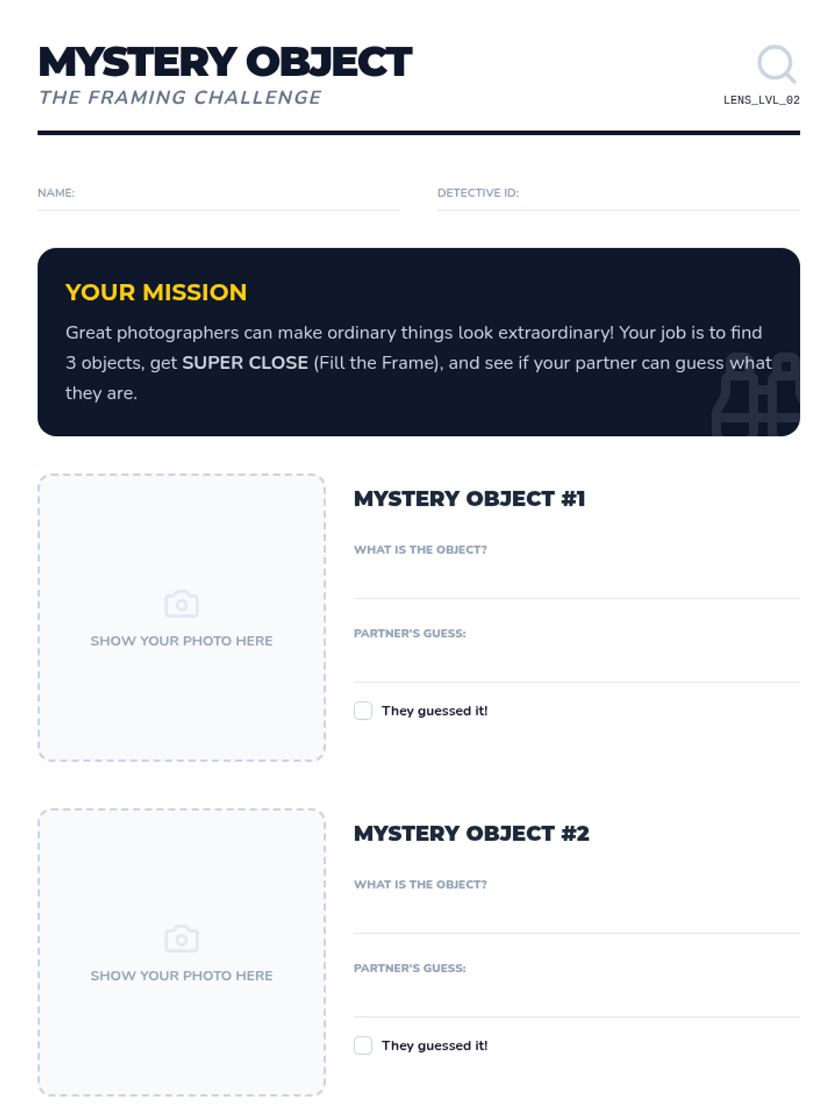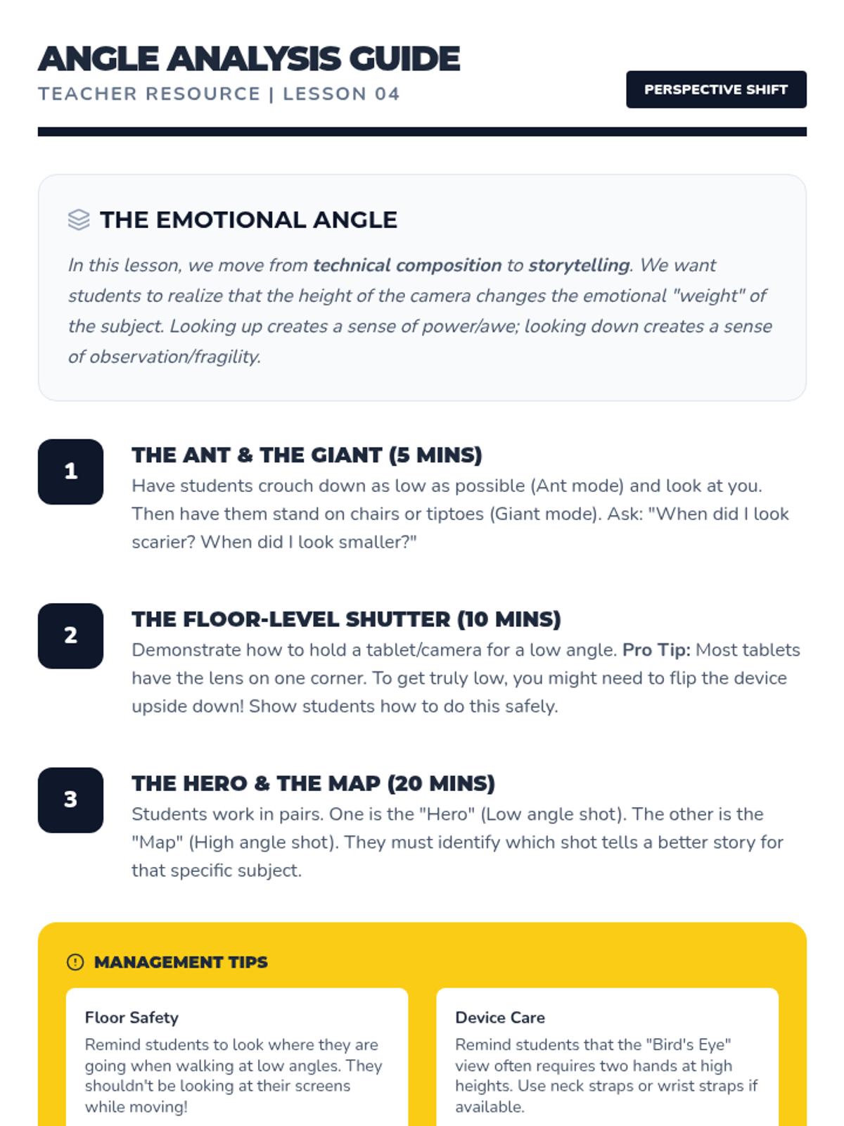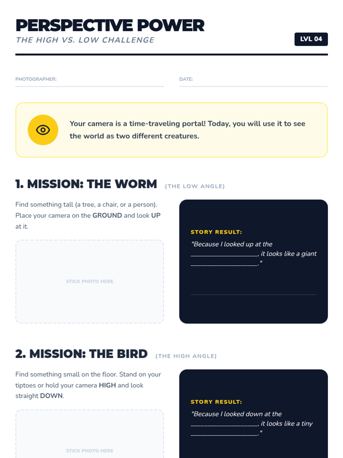 A photography sequence for 3rd graders focused on composition, framing, and intentional image-making. Students progress from basic camera handling to advanced concepts like the Rule of Thirds and perspective.