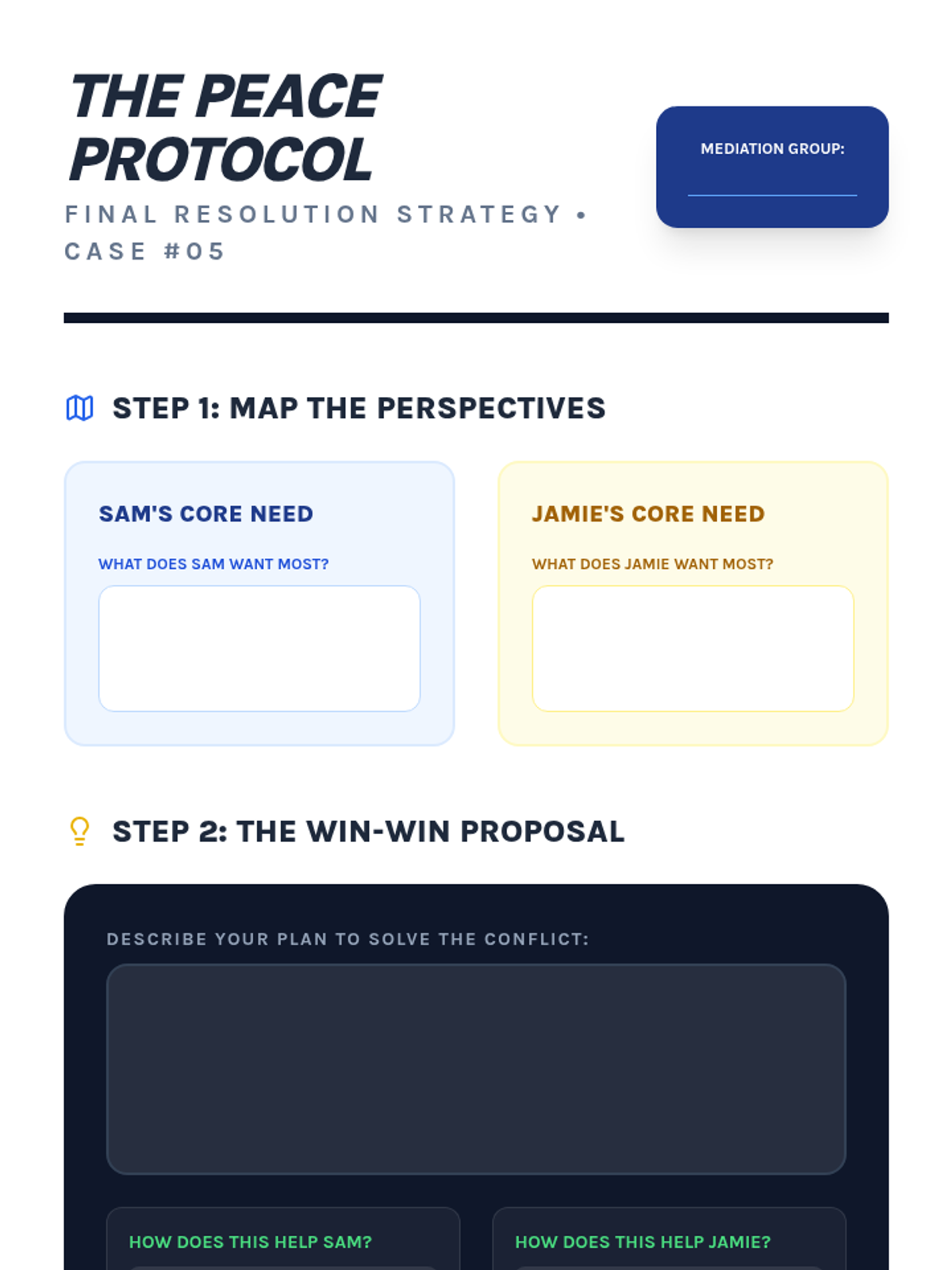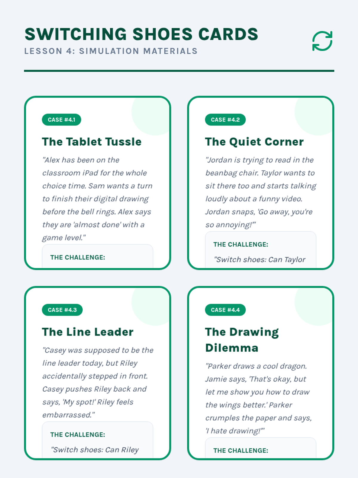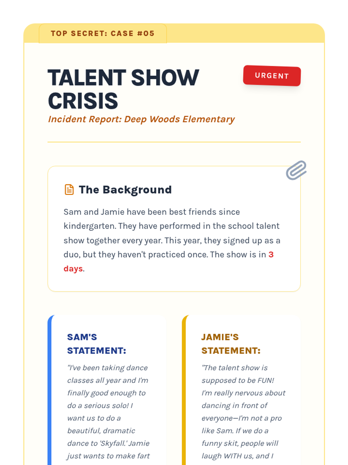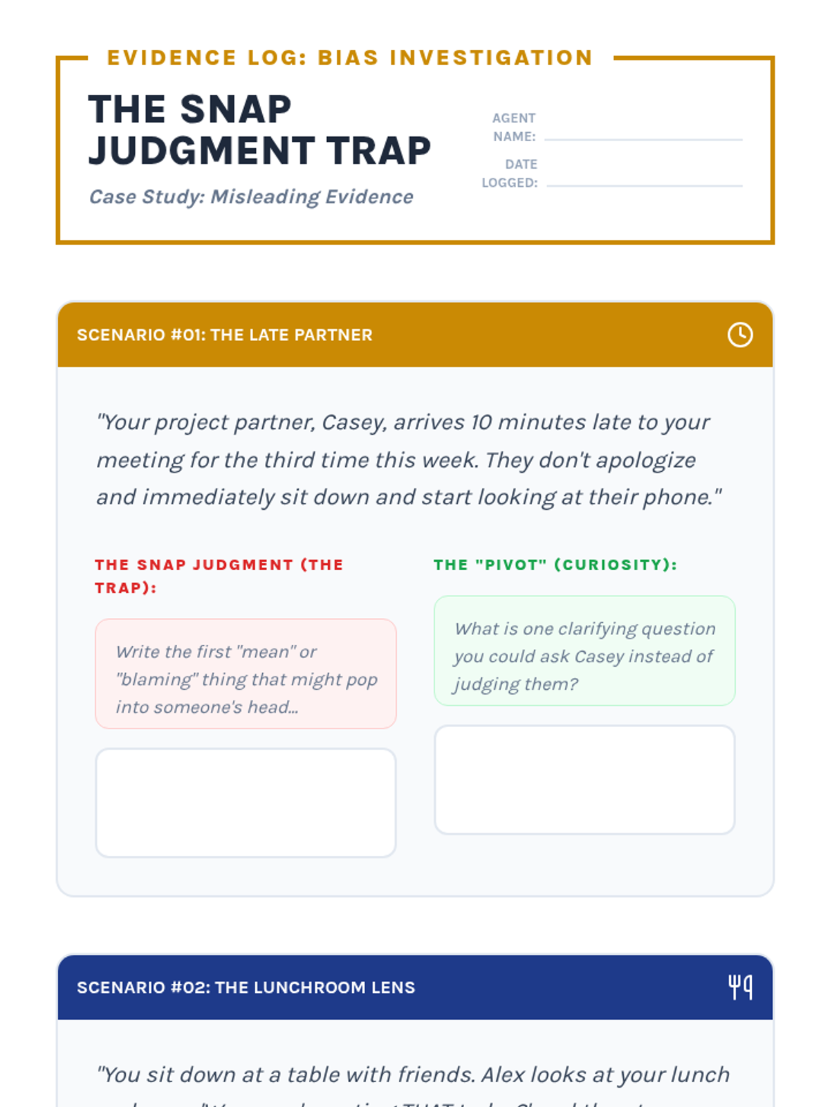 A 4th-grade social awareness unit where students learn to analyze situations from multiple viewpoints to build empathy and resolve conflicts. Using a 'Detective' theme, students investigate visual illusions, hidden motivations, personal biases, and collaborative mediation strategies.