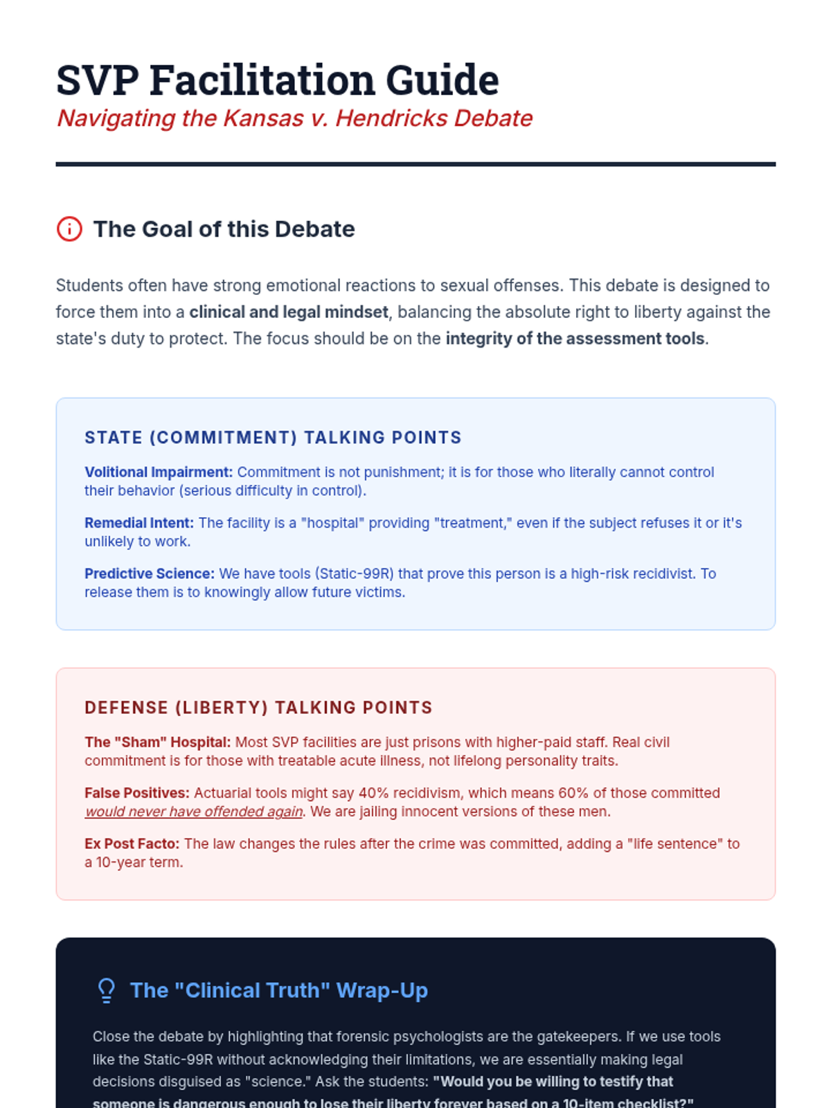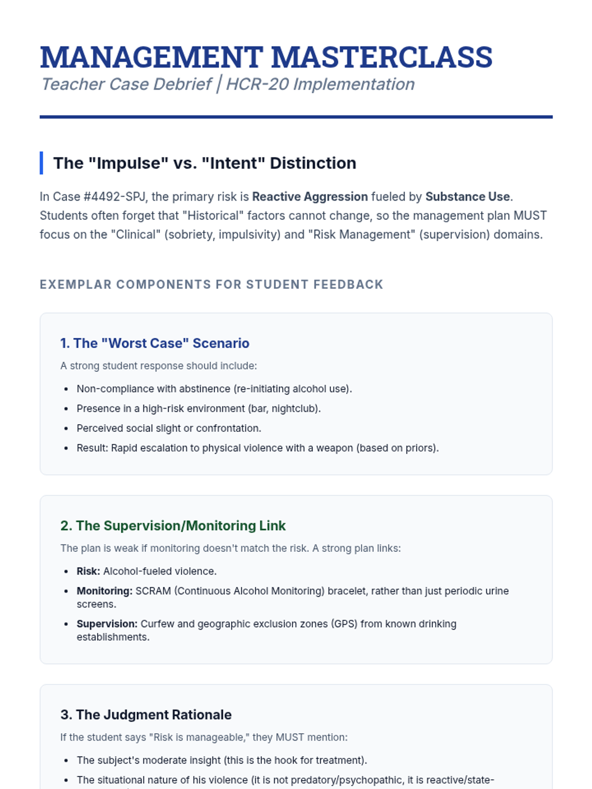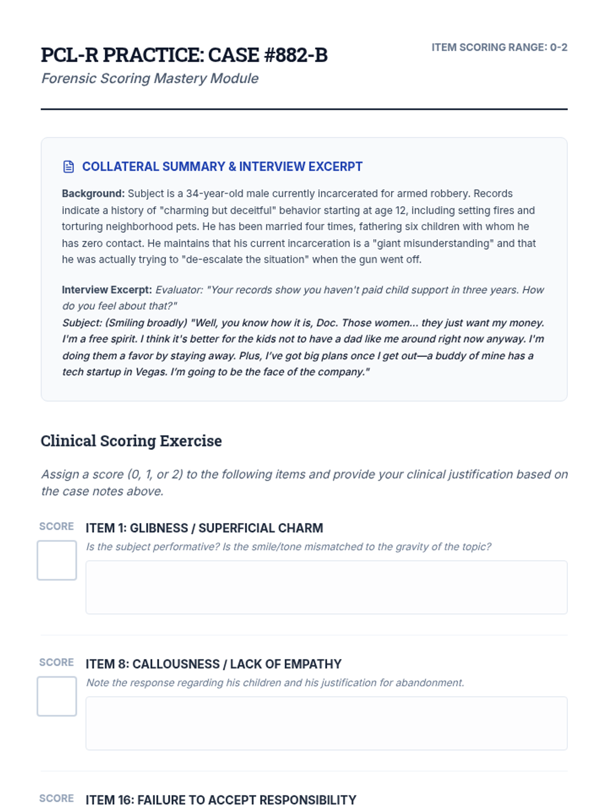 An advanced clinical sequence for graduate students focusing on the assessment of psychopathy and the prediction of future dangerousness. Students examine clinical and actuarial methods, the ethics of risk labeling, and the implementation of tools like the PCL-R and HCR-20 in forensic settings.